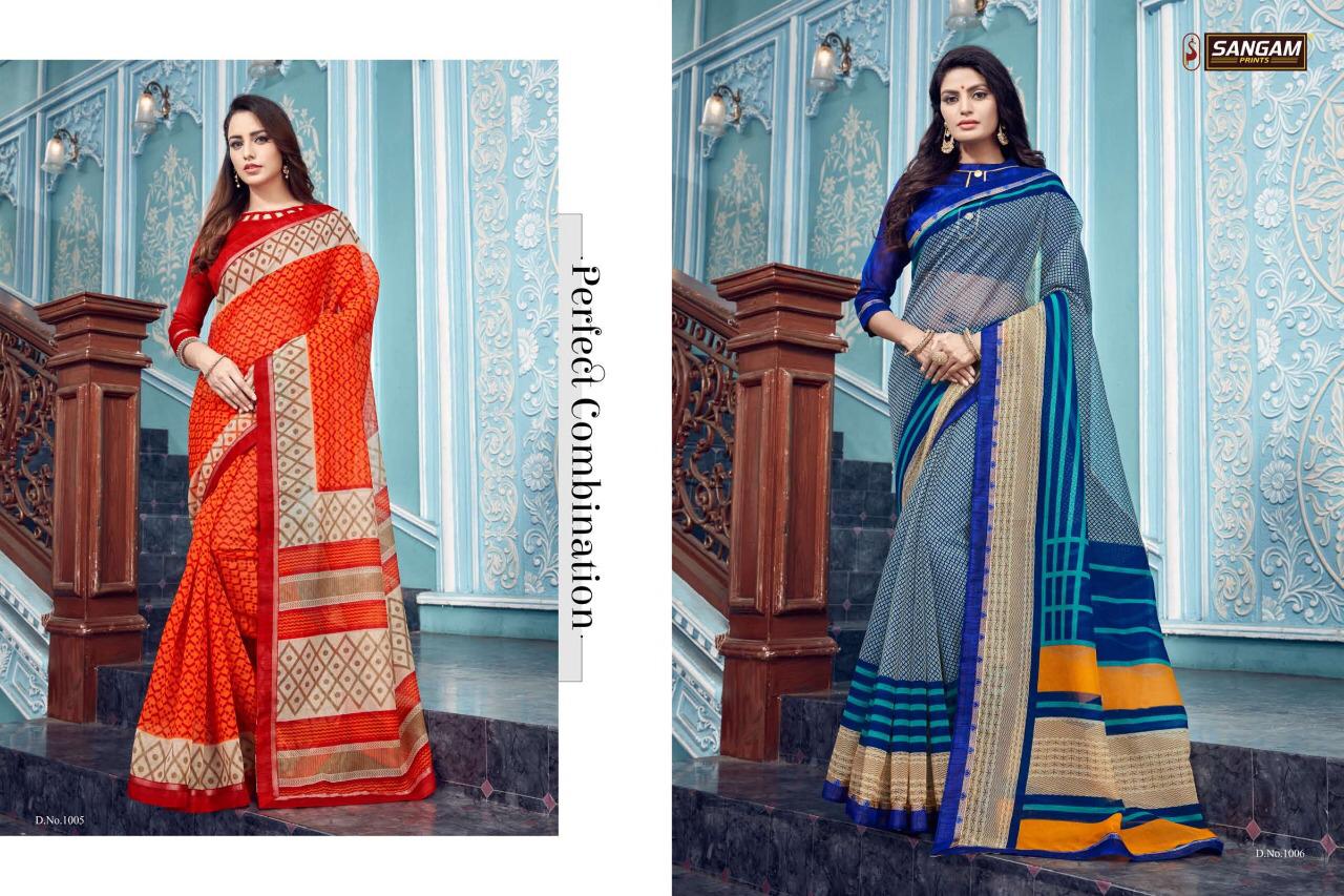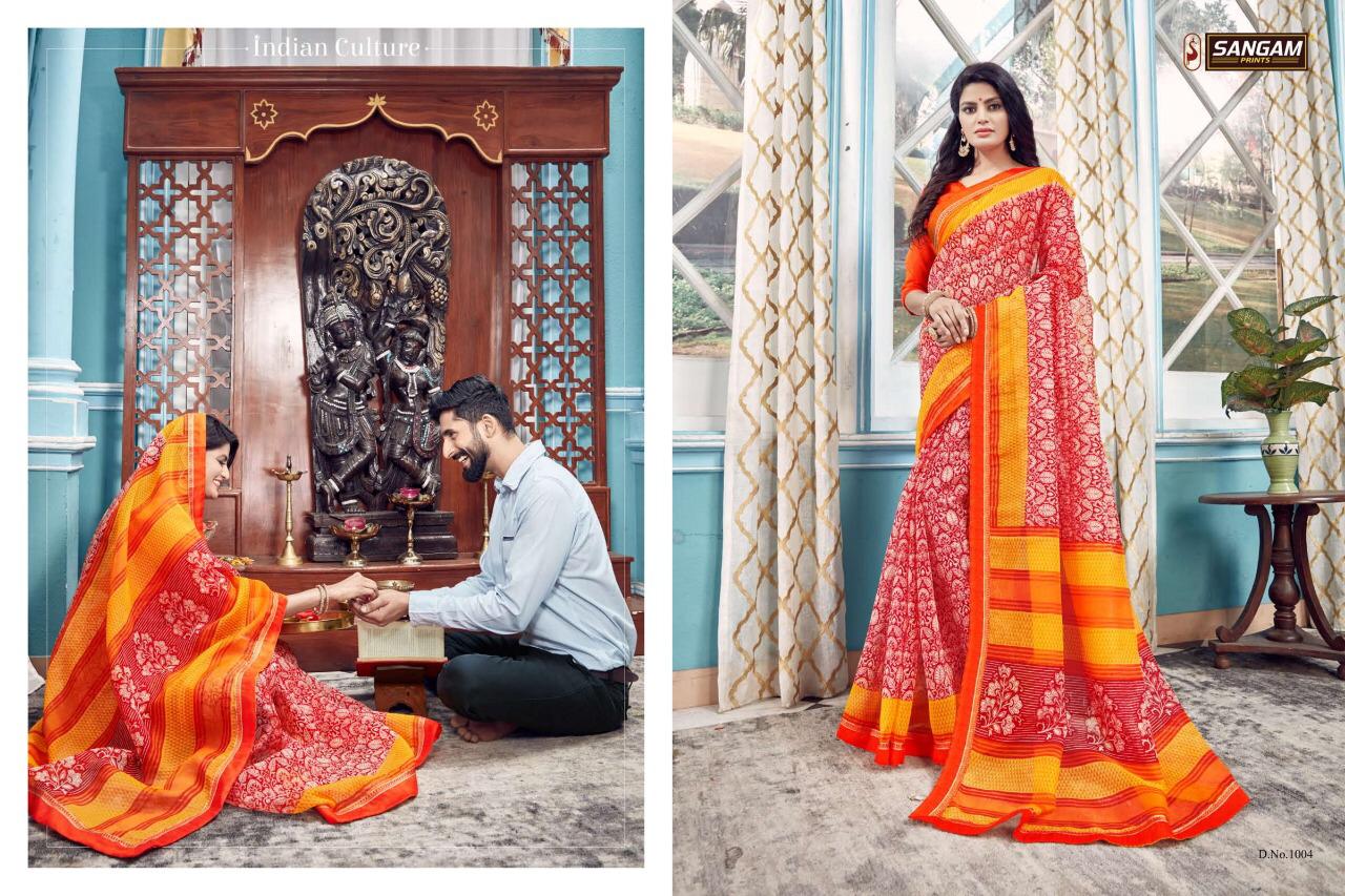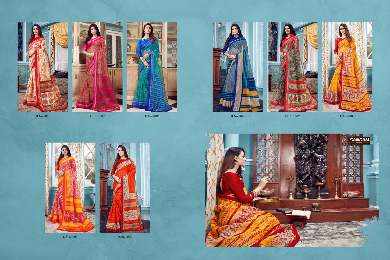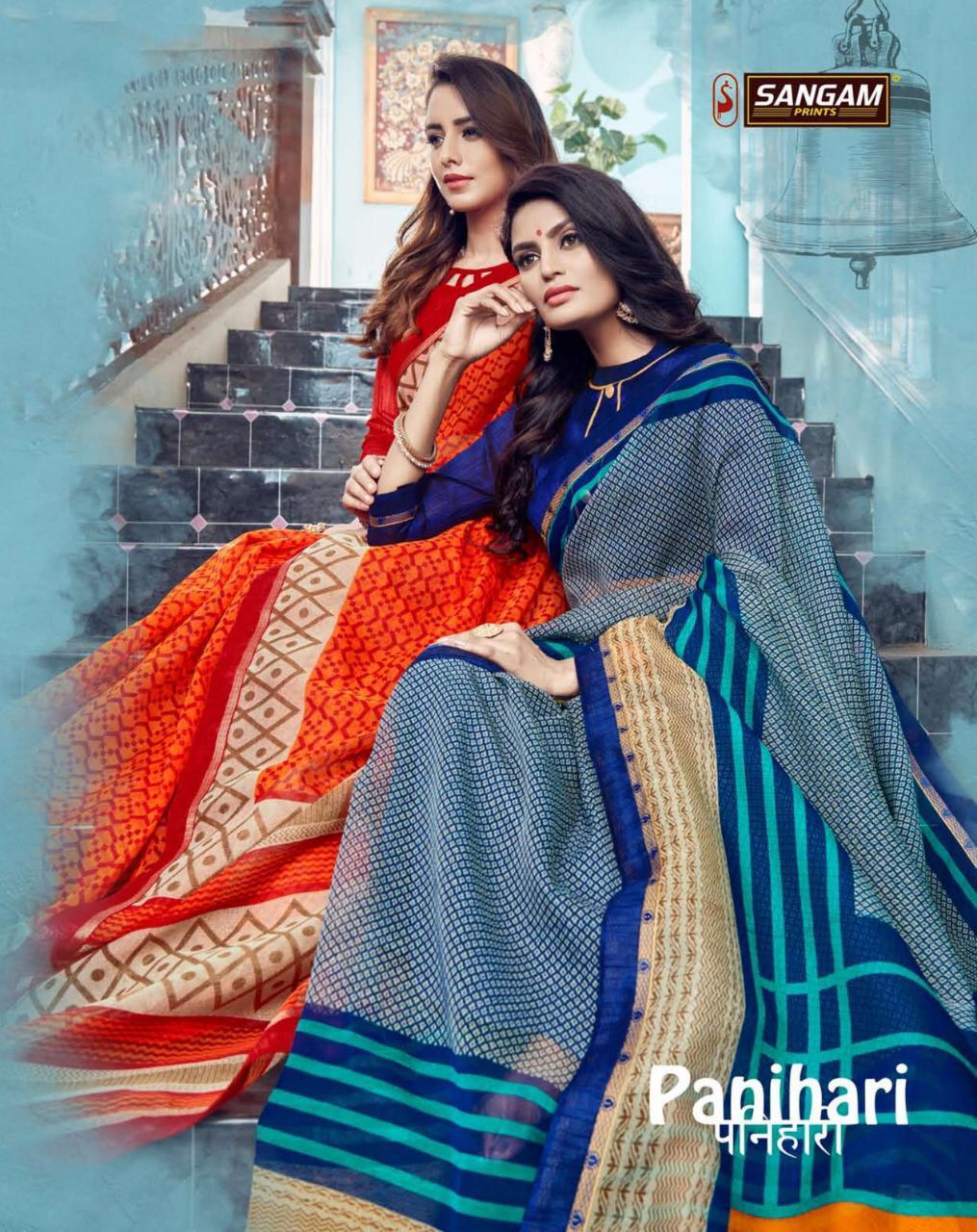 Buy Online Panihari By Sangam Series 1001 To 1008 Cotton Printed Sarees Wholesale Supplier Surat 8 Pcs of Full Catalogue at Wholesale Price. Looking for Panihari By Sangam Series 1001 To 1008 Cotton Printed Sarees Wholesale Supplier Surat Full Catalouge at Best Price? Buy Now Panihari By Sangam Series 1001 To 1008 Cotton Printed Sarees Wholesale Supplier Surat at Wholesale Rate of Rs 4000 with Total 8 Pcs from authroized dealer and supplier of SANGAM Brand. Cost of Each piece is just only Rs 500 which is very low and affordable price to resale the product in your retail store ,This is Surat based Wholesale Supplier & Dealer of SANGAM Brand. Click on Brand name to Know more about SANGAM Brand's products.Call or Whatsapp on 9898838984 for booking or enquiry