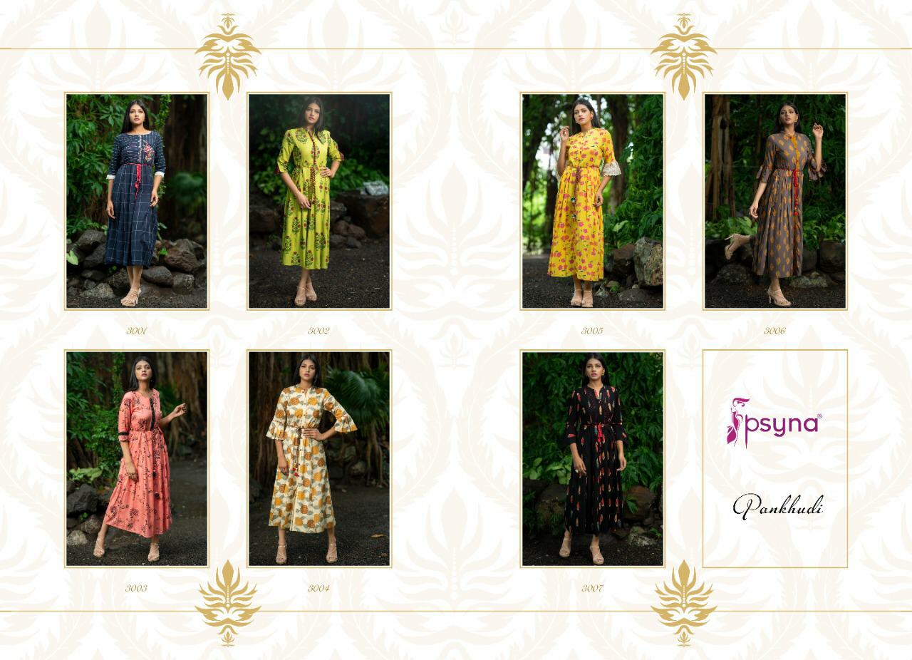 Buy Online Pankhudi Vol 3 By Psyna Handloom Reyon Kurtis Wholesale Supplier And Dealer Surat 7 Pcs of Full Catalogue at Wholesale Price. Looking for Pankhudi Vol 3 By Psyna Handloom Reyon Kurtis Wholesale Supplier And Dealer Surat Full Catalouge at Best Price? Buy Now Pankhudi Vol 3 By Psyna Handloom Reyon Kurtis Wholesale Supplier And Dealer Surat at Wholesale Rate of Rs 5250 with Total 7 Pcs from authroized dealer and supplier of PSYNA Brand. Cost of Each piece is just only Rs 750 which is very low and affordable price to resale the product in your retail store ,This is Surat based Wholesale Supplier & Dealer of PSYNA Brand. Click on Brand name to Know more about PSYNA Brand's products.Call or Whatsapp on 9898838984 for booking or enquiry