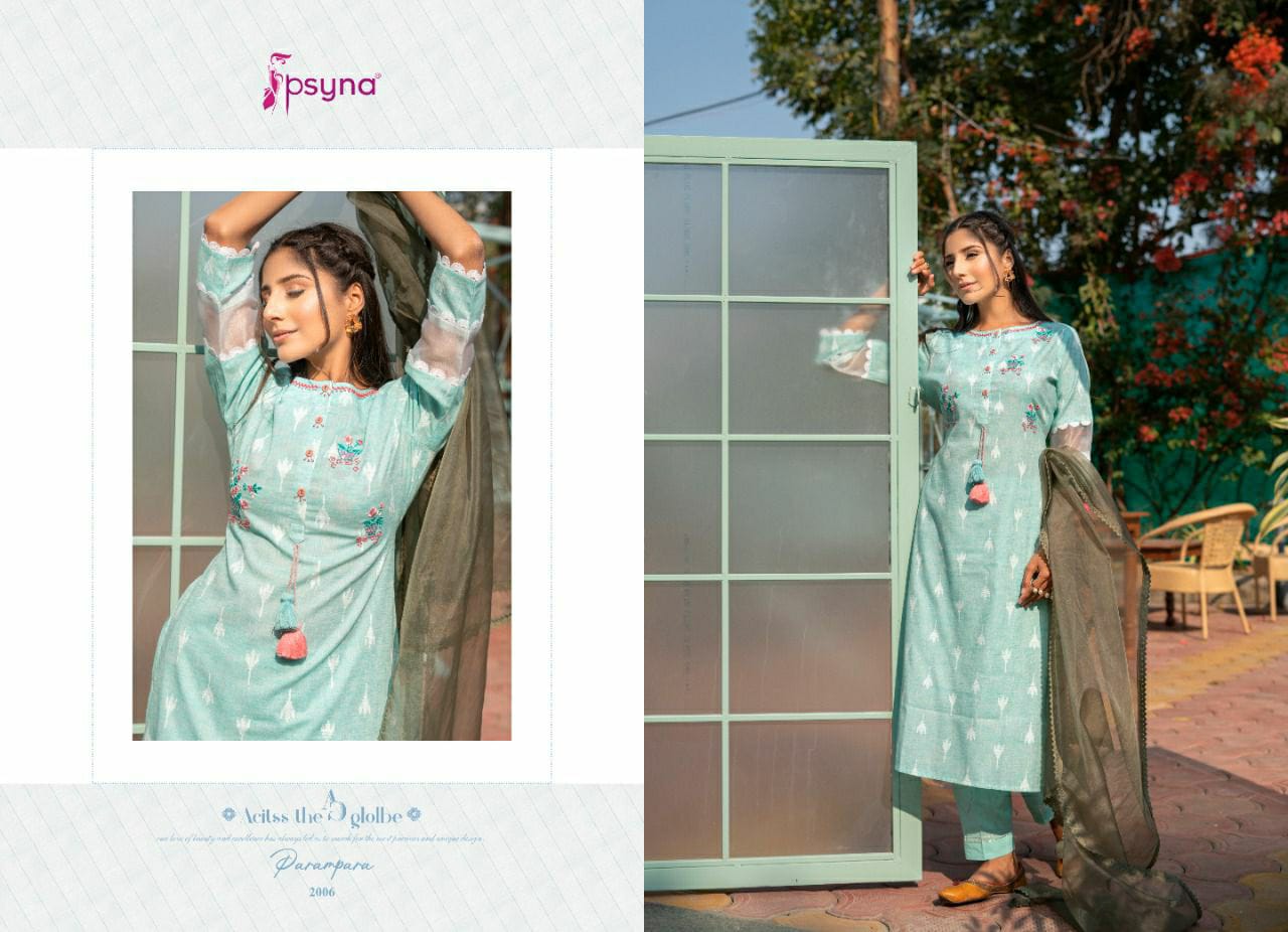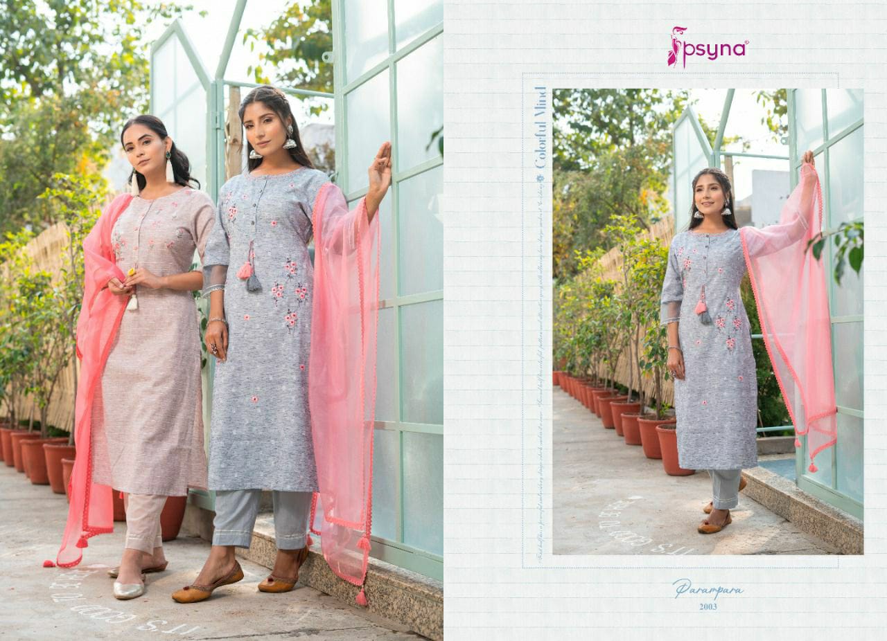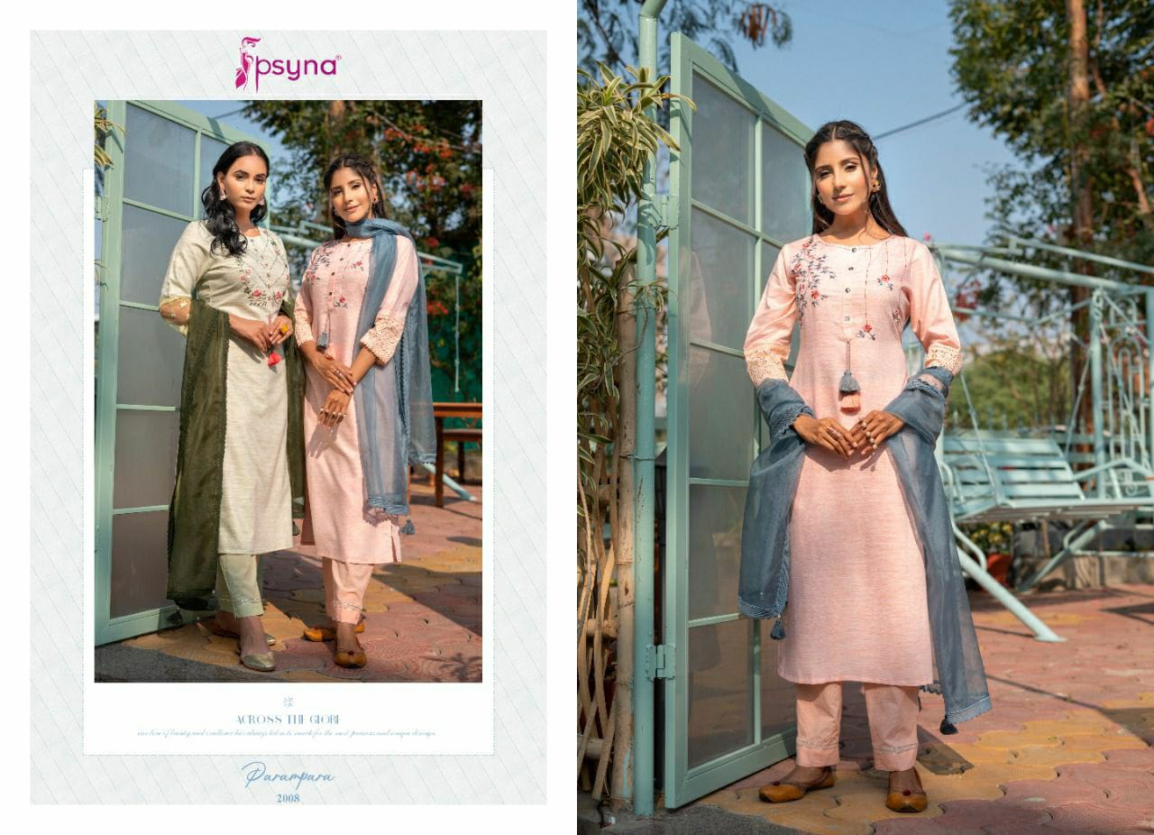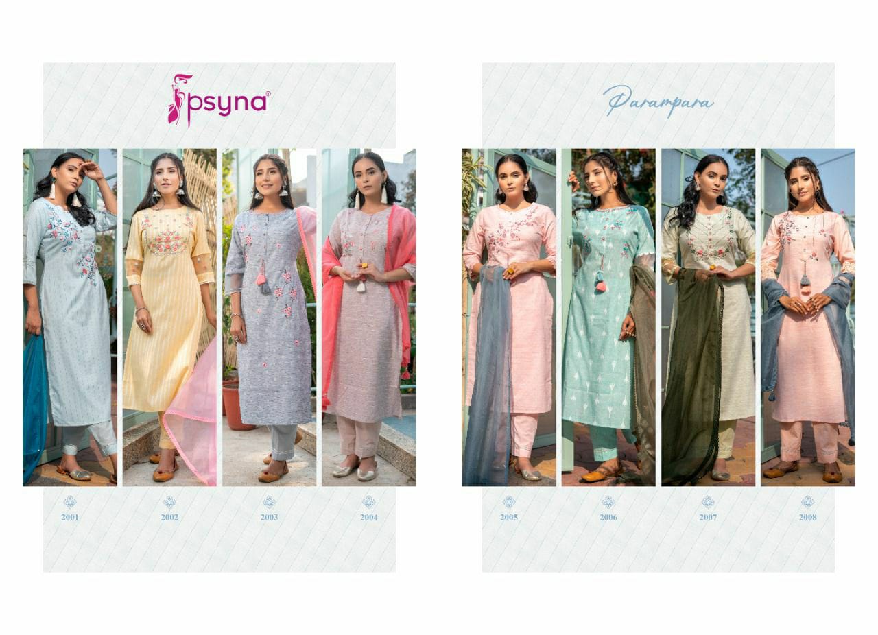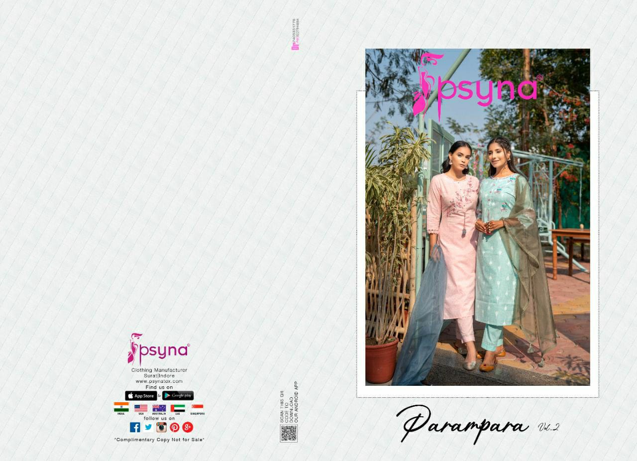 *Brand :* PSYNA *Catalog Name :* Parampara Vol 3 Top Bottom With Dupatta *Price :* ?1249 *Piece :* 8 *Total Price :* 9992 ( GST Extra ) *Size :* L,XL,XXL *Fabric :* fancy cotton *Availibility :* On Booking |