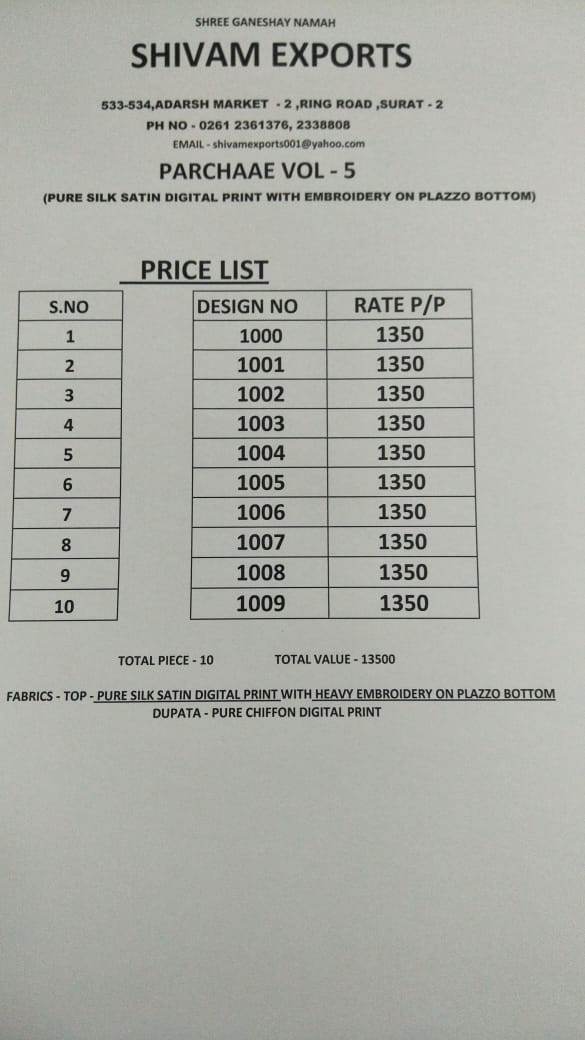 Buy Online Parchaae Vol 5 By Shivam Satin Digital Printed Embroidered Designer Plazzo Suits Wholesale Supplier And Dealer Nitya Nx Gujarat 10 Pcs of Full Catalogue at Wholesale Price. Looking for Parchaae Vol 5 By Shivam Satin Digital Printed Embroidered Designer Plazzo Suits Wholesale Supplier And Dealer Nitya Nx Gujarat Full Catalouge at Best Price? Buy Now Parchaae Vol 5 By Shivam Satin Digital Printed Embroidered Designer Plazzo Suits Wholesale Supplier And Dealer Nitya Nx Gujarat at Wholesale Rate of Rs 13500 with Total 10 Pcs from authroized dealer and supplier of Shivam Brand. Cost of Each piece is just only Rs 1350 which is very low and affordable price to resale the product in your retail store ,This is Surat based Wholesale Supplier & Dealer of Shivam Brand. Click on Brand name to Know more about Shivam Brand's products.Call or Whatsapp on 9898838984 for booking or enquiry