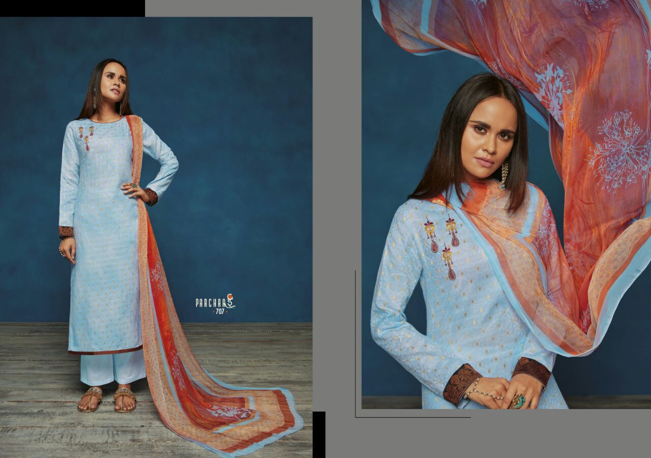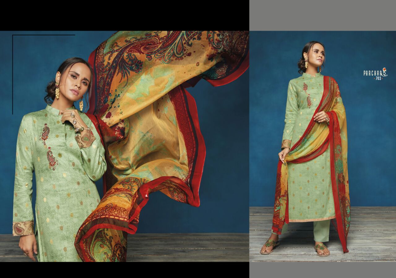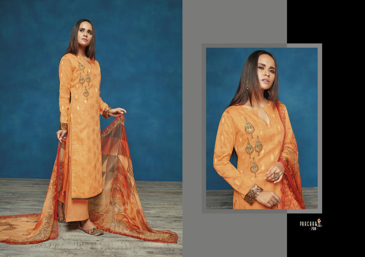 Brand - Shivam . Catlog name - PARCHAEE vol -3. Top - Glaze satin jaquard print with embroidery on top Dupata - digital print Bottom - pure cotton dyed Rate - 1225 per Pcs . Set to st . GST 5 Percent Extra. Delivery- Running order and inquiry +919898838984 |