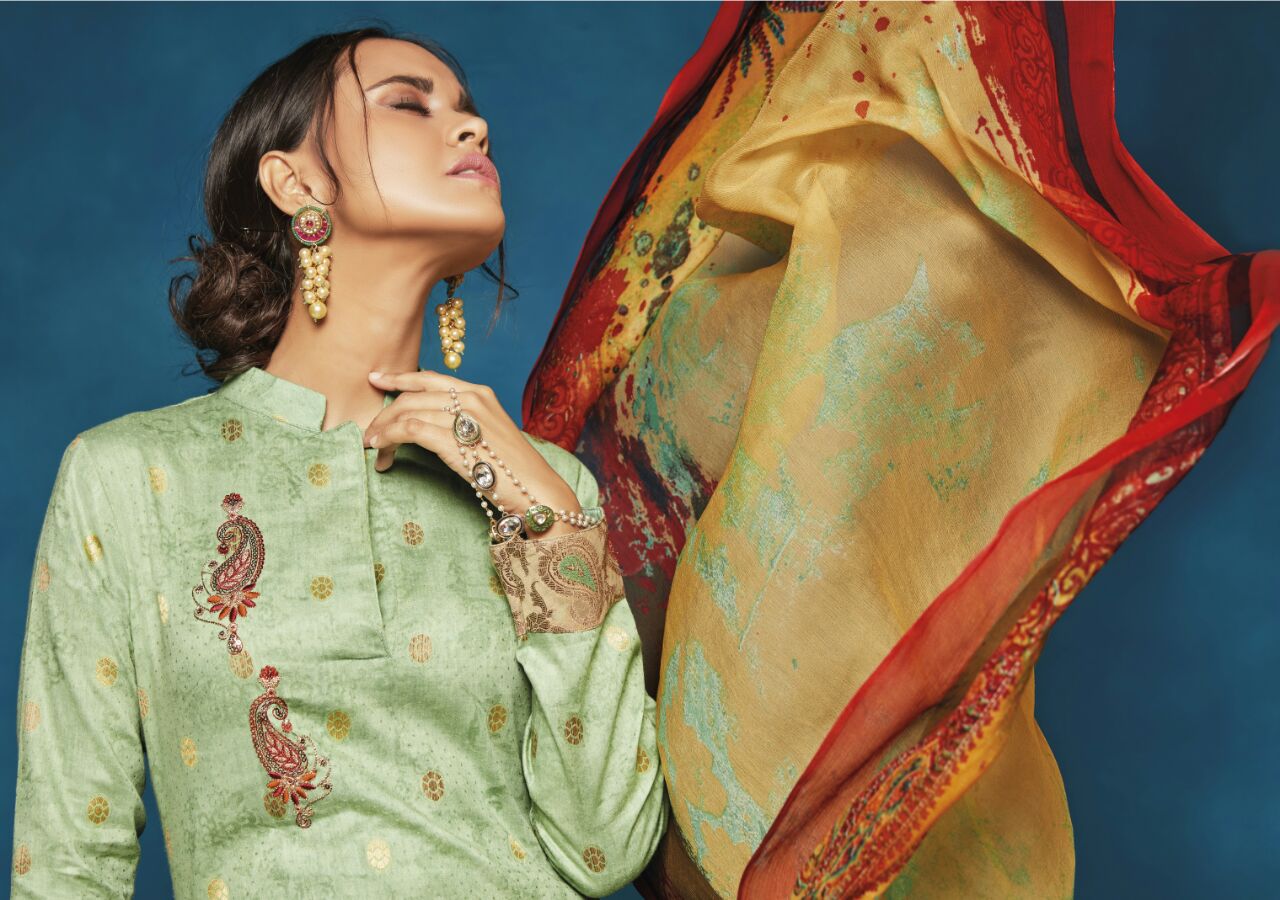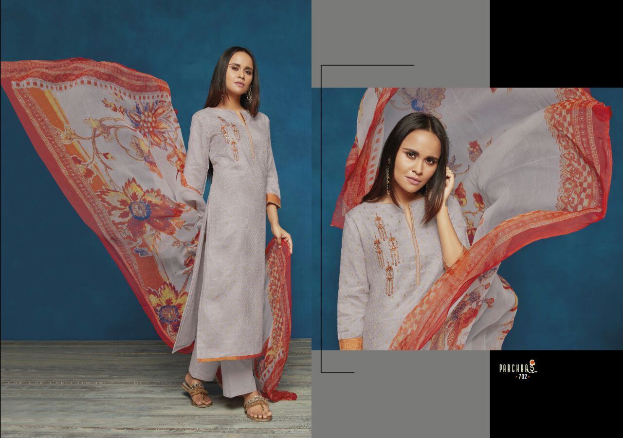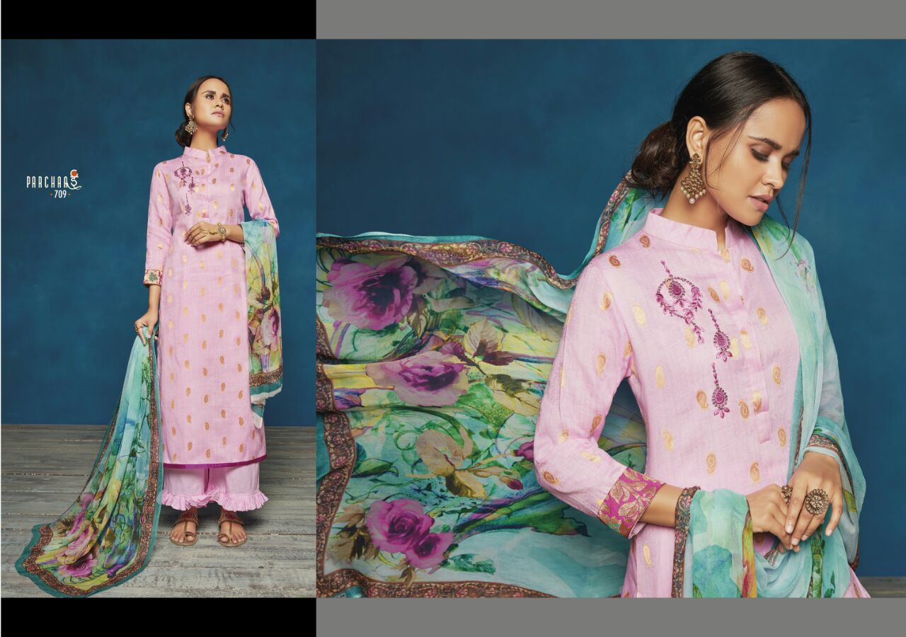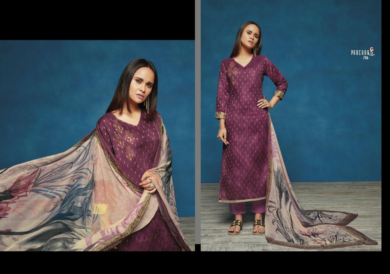 Brand - Shivam . Catlog name - PARCHAEE vol -3. Top - Glaze satin jaquard print with embroidery on top Dupata - digital print Bottom - pure cotton dyed Rate - 1225 per Pcs . Set to st . GST 5 Percent Extra. Delivery- Running order and inquiry +919898838984 |