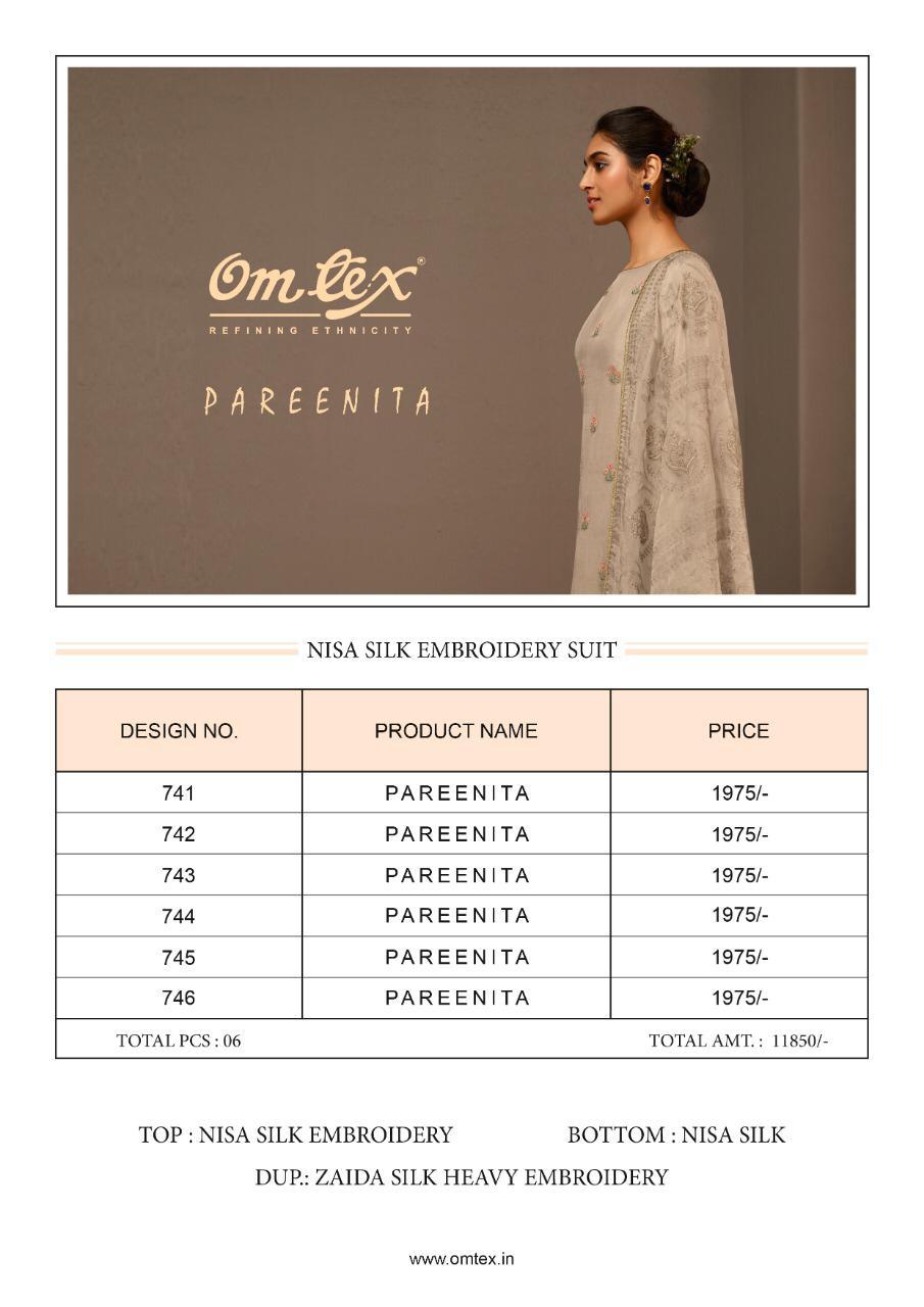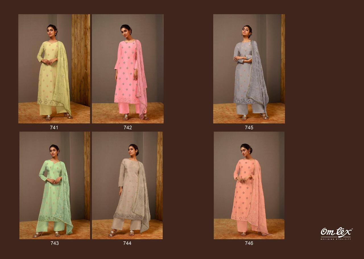 Buy Online Pareenita By Omtex Series 741 To 746 Designer Party Wear Suits Wholesale Supplier Gujarat 7 Pcs of Full Catalogue at Wholesale Price. Looking for Pareenita By Omtex Series 741 To 746 Designer Party Wear Suits Wholesale Supplier Gujarat Full Catalouge at Best Price? Buy Now Pareenita By Omtex Series 741 To 746 Designer Party Wear Suits Wholesale Supplier Gujarat at Wholesale Rate of Rs 13825 with Total 7 Pcs from authroized dealer and supplier of OM TEX Brand. Cost of Each piece is just only Rs 1975 which is very low and affordable price to resale the product in your retail store ,This is Surat based Wholesale Supplier & Dealer of OM TEX Brand. Click on Brand name to Know more about OM TEX Brand's products.Call or Whatsapp on 9898838984 for booking or enquiry