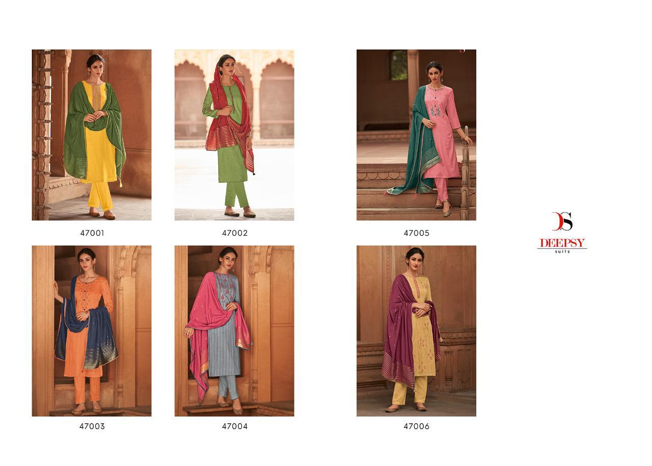 *Pari by DEEPSY SUITS* Top - Pure jam cotton silk print with Self Embroidery Bot - Cotton solid Dup - Pure viscose weaving With lace & tussles Series -47001 to 47006 Rate : 999 per pcs . GST 5 Percent Extra * set & Loose & Singel * Delivery 3-4 days . * Special pouch packing* *_Quilted Fabric Used For best quality results_* |