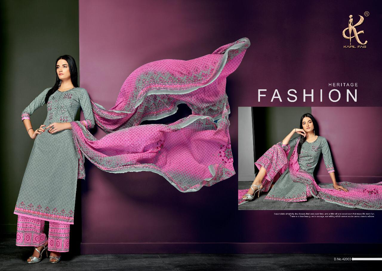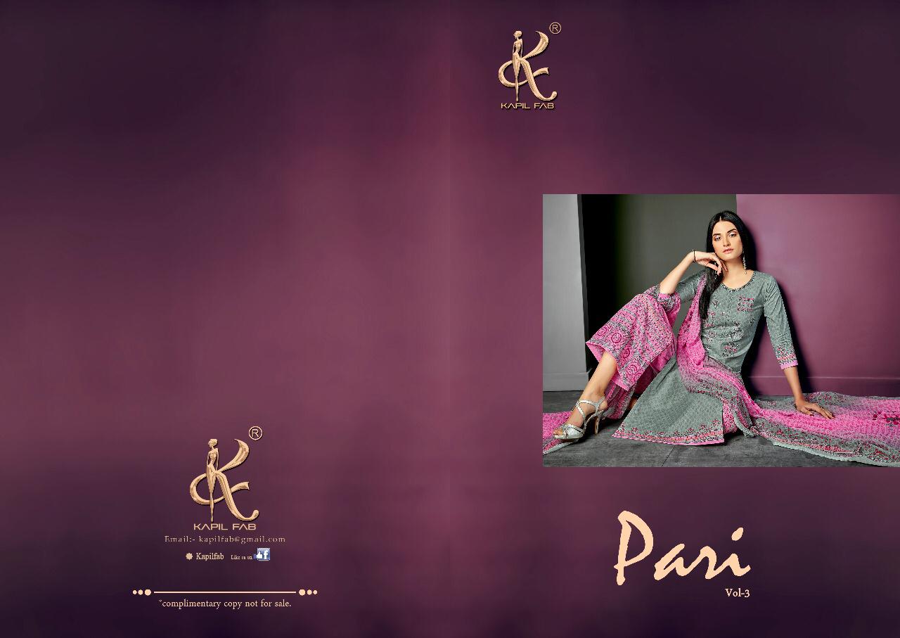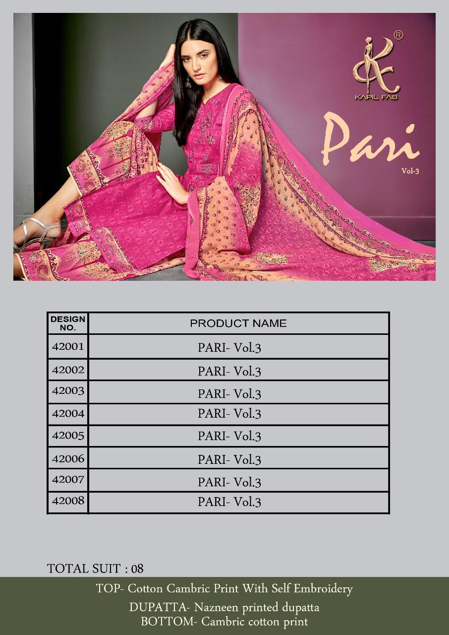Buy Online Pari Vol 3 By Kapil Fab Series 42001 To 42008 Cotton Embroidered Designer Dress Material Wholesaler Gujarat 8 Pcs of Full Catalogue at Wholesale Price. Looking for Pari Vol 3 By Kapil Fab Series 42001 To 42008 Cotton Embroidered Designer Dress Material Wholesaler Gujarat Full Catalouge at Best Price? Buy Now Pari Vol 3 By Kapil Fab Series 42001 To 42008 Cotton Embroidered Designer Dress Material Wholesaler Gujarat at Wholesale Rate of Rs 5400 with Total 8 Pcs from authroized dealer and supplier of KAPIL TRENDZ Brand. Cost of Each piece is just only Rs 675 which is very low and affordable price to resale the product in your retail store ,This is Surat based Wholesale Supplier & Dealer of KAPIL TRENDZ Brand. Click on Brand name to Know more about KAPIL TRENDZ Brand's products.Call or Whatsapp on 9898838984 for booking or enquiry