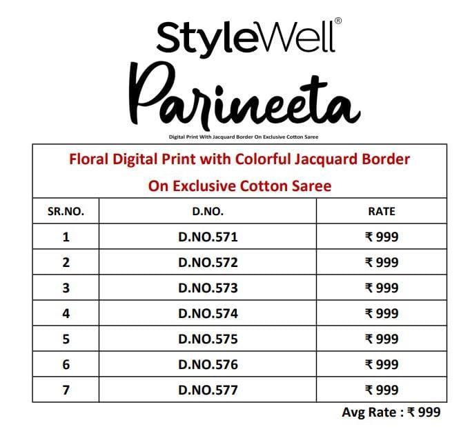 Buy Online Parineeta By Style Well Designer Saree Wholesale Suppliers And Dealer From India 7 Pcs of Full Catalogue at Wholesale Price. Looking for Parineeta By Style Well Designer Saree Wholesale Suppliers And Dealer From India Full Catalouge at Best Price? Buy Now Parineeta By Style Well Designer Saree Wholesale Suppliers And Dealer From India at Wholesale Rate of Rs 6993 with Total 7 Pcs from authroized dealer and supplier of STYLE WELL Brand. Cost of Each piece is just only Rs 999 which is very low and affordable price to resale the product in your retail store ,This is Surat based Wholesale Supplier & Dealer of STYLE WELL Brand. Click on Brand name to Know more about STYLE WELL Brand's products.Call or Whatsapp on 9898838984 for booking or enquiry