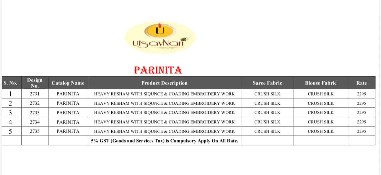 Buy Online PARINITA by utsav nari fashion saree collection manufacturer Surat 5 Pcs of Full Catalogue at Wholesale Price. Looking for PARINITA by utsav nari fashion saree collection manufacturer Surat Full Catalouge at Best Price? Buy Now PARINITA by utsav nari fashion saree collection manufacturer Surat at Wholesale Rate of Rs 11475 with Total 5 Pcs from authroized dealer and supplier of UTSAV NARI Brand. Cost of Each piece is just only Rs 2295 which is very low and affordable price to resale the product in your retail store ,This is Surat based Wholesale Supplier & Dealer of UTSAV NARI Brand. Click on Brand name to Know more about UTSAV NARI Brand's products.Call or Whatsapp on 9898838984 for booking or enquiry