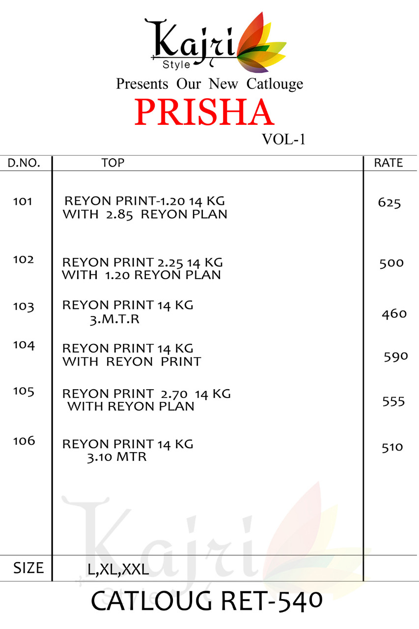 Buy Online Parisha Vol 1 By Kajri Style Reyon Printed Kurtis Wholesale Supplier Surat 6 Pcs of Full Catalogue at Wholesale Price. Looking for Parisha Vol 1 By Kajri Style Reyon Printed Kurtis Wholesale Supplier Surat Full Catalouge at Best Price? Buy Now Parisha Vol 1 By Kajri Style Reyon Printed Kurtis Wholesale Supplier Surat at Wholesale Rate of Rs 3240 with Total 6 Pcs from authroized dealer and supplier of KAJRI STYLE Brand. Cost of Each piece is just only Rs 540 which is very low and affordable price to resale the product in your retail store ,This is Surat based Wholesale Supplier & Dealer of KAJRI STYLE Brand. Click on Brand name to Know more about KAJRI STYLE Brand's products.Call or Whatsapp on 9898838984 for booking or enquiry