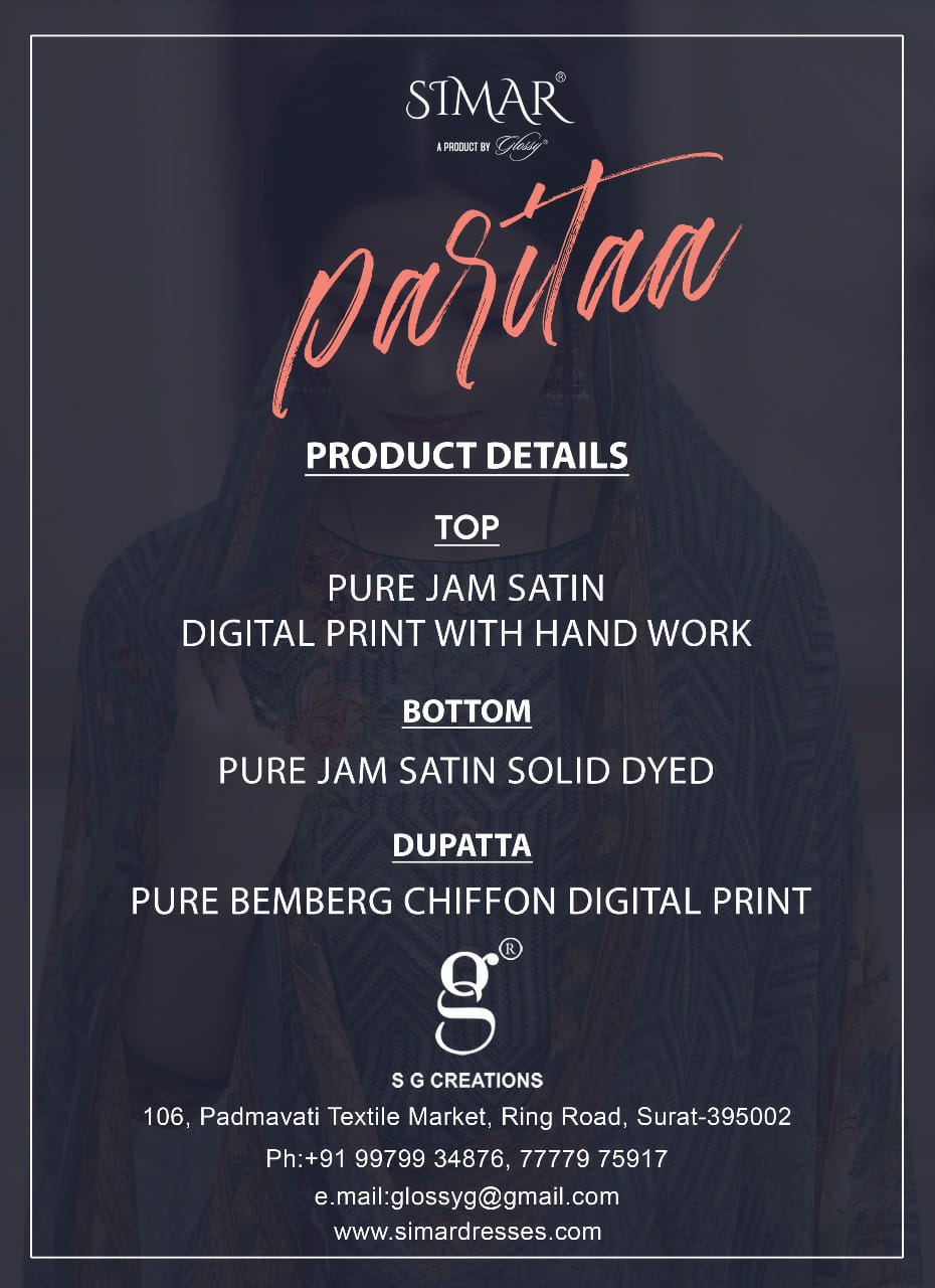 Buy Online Parita By Glossy Manufacturer Traders Surat Gujarat 8 Pcs of Full Catalogue at Wholesale Price. Looking for Parita By Glossy Manufacturer Traders Surat Gujarat Full Catalouge at Best Price? Buy Now Parita By Glossy Manufacturer Traders Surat Gujarat at Wholesale Rate of Rs 11160 with Total 8 Pcs from authroized dealer and supplier of GLOSSY Brand. Cost of Each piece is just only Rs 1395 which is very low and affordable price to resale the product in your retail store ,This is Surat based Wholesale Supplier & Dealer of GLOSSY Brand. Click on Brand name to Know more about GLOSSY Brand's products.Call or Whatsapp on 9898838984 for booking or enquiry