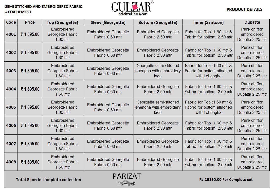 Buy Online Parizat By Gulzar Series 4001 To 4008 Georgette Embroidered Designer Party Wear Suits Wholesale Supplier Gujarat 8 Pcs of Full Catalogue at Wholesale Price. Looking for Parizat By Gulzar Series 4001 To 4008 Georgette Embroidered Designer Party Wear Suits Wholesale Supplier Gujarat Full Catalouge at Best Price? Buy Now Parizat By Gulzar Series 4001 To 4008 Georgette Embroidered Designer Party Wear Suits Wholesale Supplier Gujarat at Wholesale Rate of Rs 15160 with Total 8 Pcs from authroized dealer and supplier of GULZAR Brand. Cost of Each piece is just only Rs 1895 which is very low and affordable price to resale the product in your retail store ,This is Surat based Wholesale Supplier & Dealer of GULZAR Brand. Click on Brand name to Know more about GULZAR Brand's products.Call or Whatsapp on 9898838984 for booking or enquiry