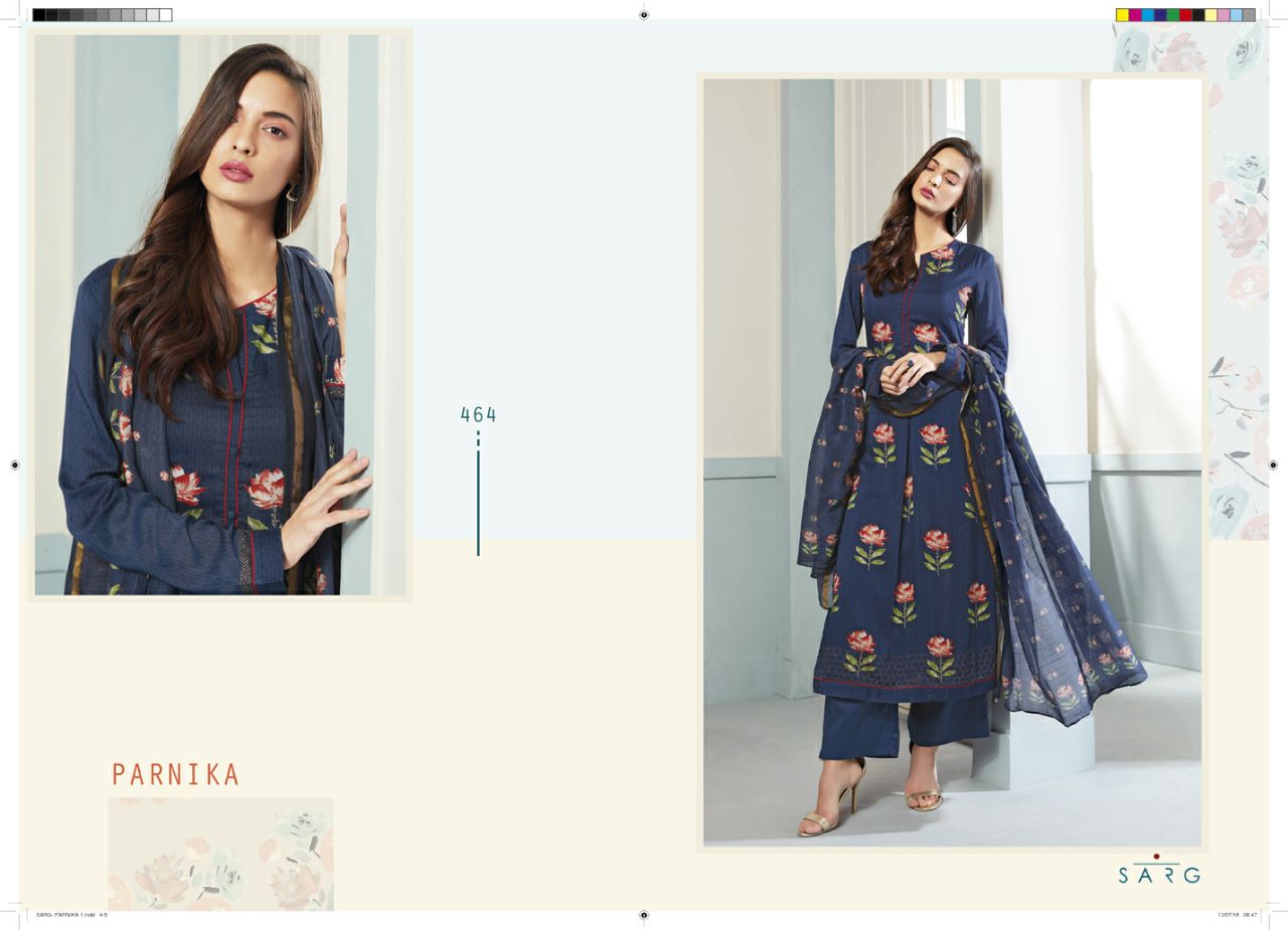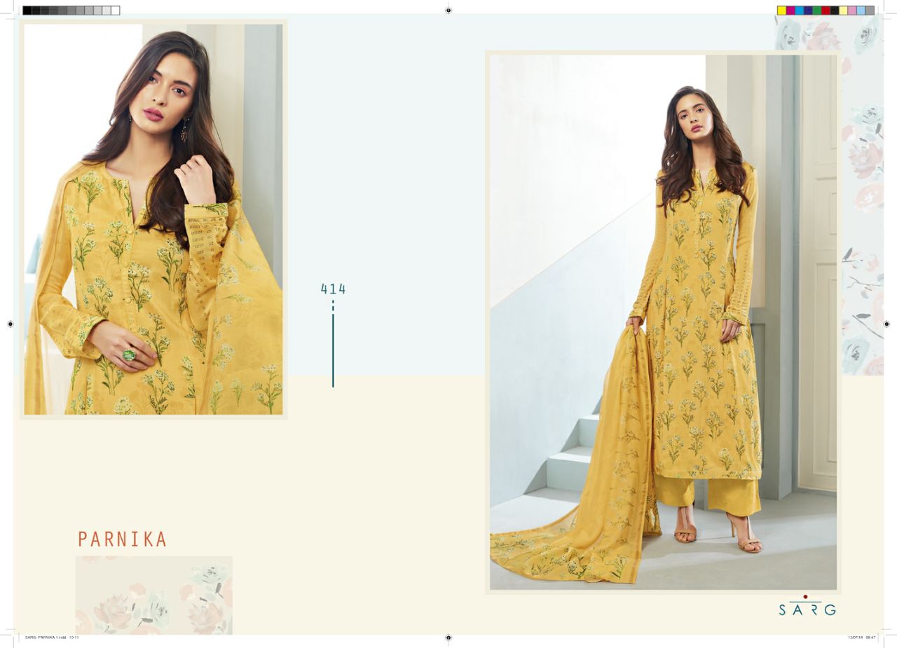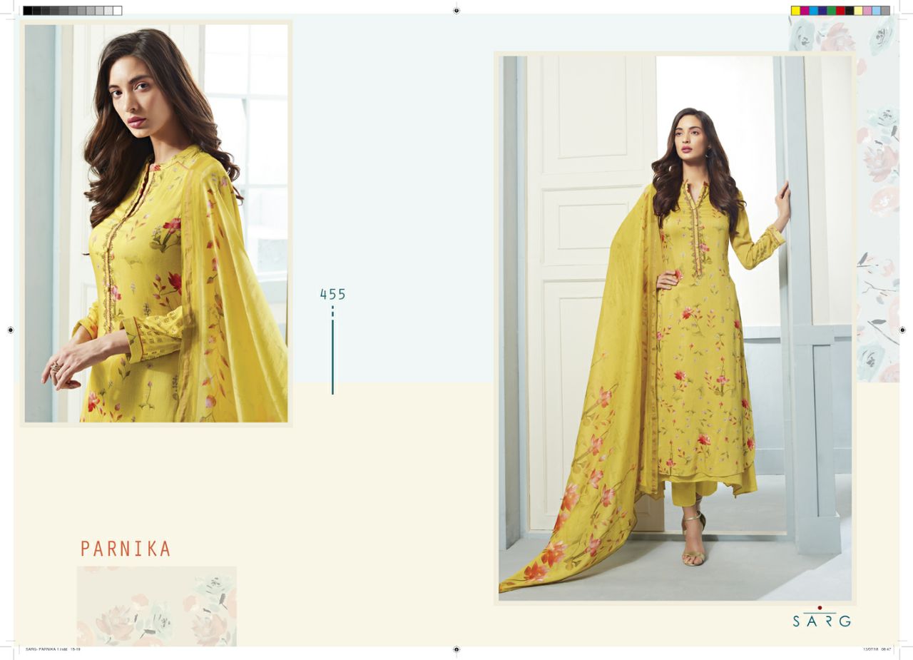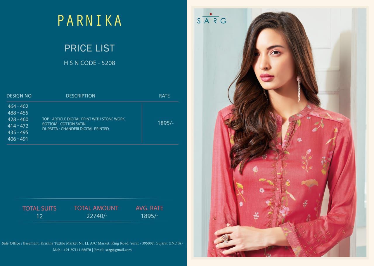 Buy Online Parnika By Sarg Sahiba Digital Printed Suits Wholesale Supplier And Dealer Surat 12 Pcs of Full Catalogue at Wholesale Price. Looking for Parnika By Sarg Sahiba Digital Printed Suits Wholesale Supplier And Dealer Surat Full Catalouge at Best Price? Buy Now Parnika By Sarg Sahiba Digital Printed Suits Wholesale Supplier And Dealer Surat at Wholesale Rate of Rs 22740 with Total 12 Pcs from authroized dealer and supplier of SARG Brand. Cost of Each piece is just only Rs 1895 which is very low and affordable price to resale the product in your retail store ,This is Surat based Wholesale Supplier & Dealer of SARG Brand. Click on Brand name to Know more about SARG Brand's products.Call or Whatsapp on 9898838984 for booking or enquiry