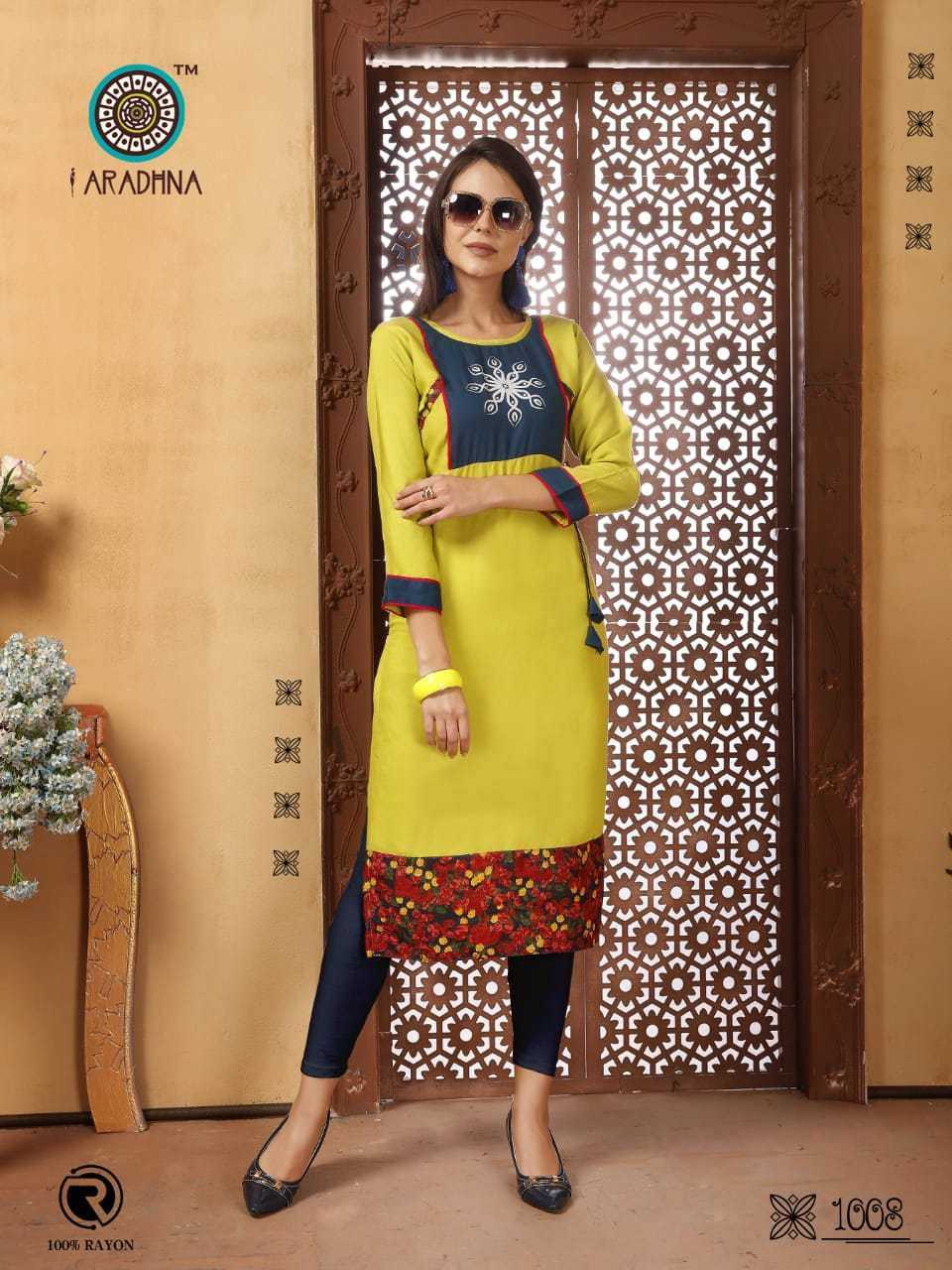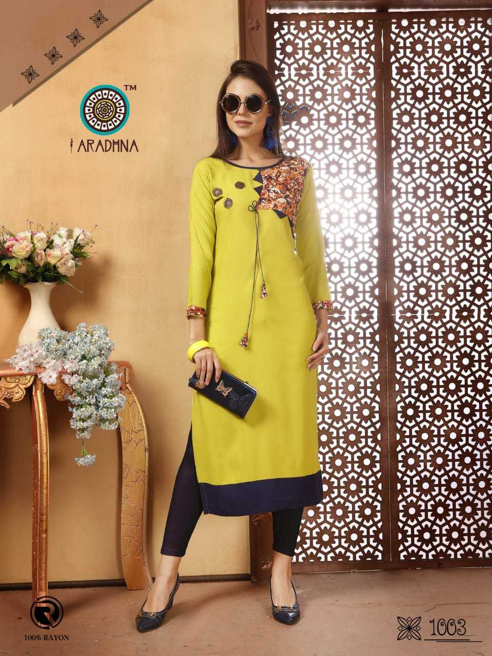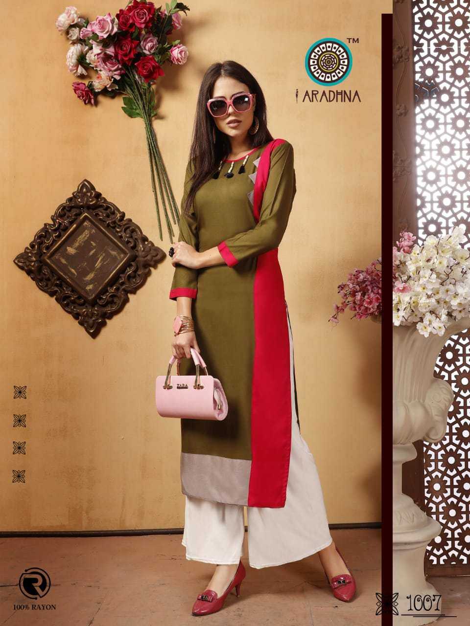 Buy Online Parrot 3 By Aradhna 1001 Series Fancy Reyon Kurti Collection Wholesale Dealer Surat 8 Pcs of Full Catalogue at Wholesale Price. Looking for Parrot 3 By Aradhna 1001 Series Fancy Reyon Kurti Collection Wholesale Dealer Surat Full Catalouge at Best Price? Buy Now Parrot 3 By Aradhna 1001 Series Fancy Reyon Kurti Collection Wholesale Dealer Surat at Wholesale Rate of Rs 2880 with Total 8 Pcs from authroized dealer and supplier of Brand. Cost of Each piece is just only Rs 360 which is very low and affordable price to resale the product in your retail store ,This is Surat based Wholesale Supplier & Dealer of Brand. Click on Brand name to Know more about Brand's products.Call or Whatsapp on 9898838984 for booking or enquiry
