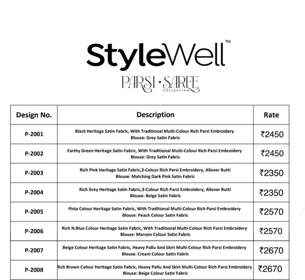 Buy Online Parsi Saree By Stylewell Heavy Embroidered Designer Party Wear Sarees Wholesale Supplier And Dealer Surat 8 Pcs of Full Catalogue at Wholesale Price. Looking for Parsi Saree By Stylewell Heavy Embroidered Designer Party Wear Sarees Wholesale Supplier And Dealer Surat Full Catalouge at Best Price? Buy Now Parsi Saree By Stylewell Heavy Embroidered Designer Party Wear Sarees Wholesale Supplier And Dealer Surat at Wholesale Rate of Rs 20080 with Total 8 Pcs from authroized dealer and supplier of STYLE WELL Brand. Cost of Each piece is just only Rs 2510 which is very low and affordable price to resale the product in your retail store ,This is Surat based Wholesale Supplier & Dealer of STYLE WELL Brand. Click on Brand name to Know more about STYLE WELL Brand's products.Call or Whatsapp on 9898838984 for booking or enquiry