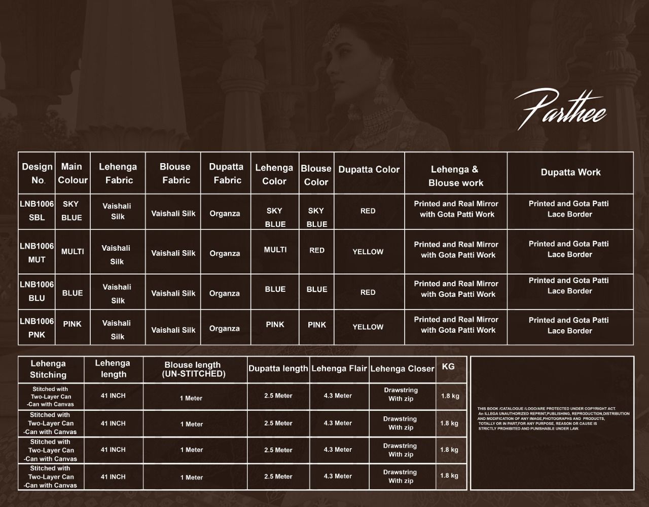 Buy Online Parthee Designer Vaishali Silk Printed Lehenga Choli Collection Manufacturer Surat 4 Pcs of Full Catalogue at Wholesale Price. Looking for Parthee Designer Vaishali Silk Printed Lehenga Choli Collection Manufacturer Surat Full Catalouge at Best Price? Buy Now Parthee Designer Vaishali Silk Printed Lehenga Choli Collection Manufacturer Surat at Wholesale Rate of Rs 9000 with Total 4 Pcs from authroized dealer and supplier of Brand. Cost of Each piece is just only Rs 2250 which is very low and affordable price to resale the product in your retail store ,This is Surat based Wholesale Supplier & Dealer of Brand. Click on Brand name to Know more about Brand's products.Call or Whatsapp on 9898838984 for booking or enquiry