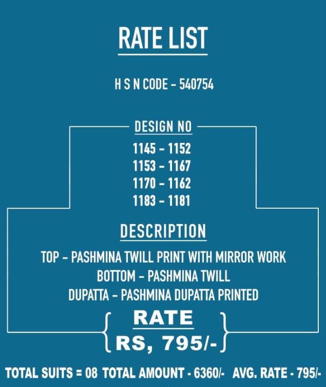 *NIRUKTH* A SAHIBA BRAND presents its winter woollen collection *PARTHVI* *TOP:* Pashmina twill print with mirror work *BOTTOM:* Pashmina twill *DUPATTA:* Pashmina dupatta printed *RATE:* 795/- |
