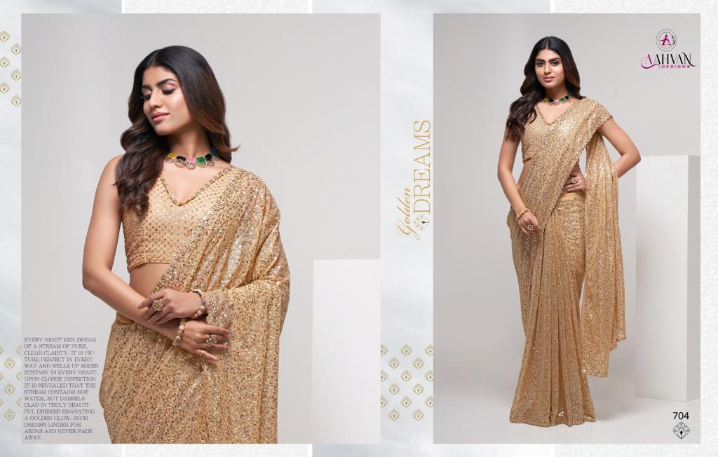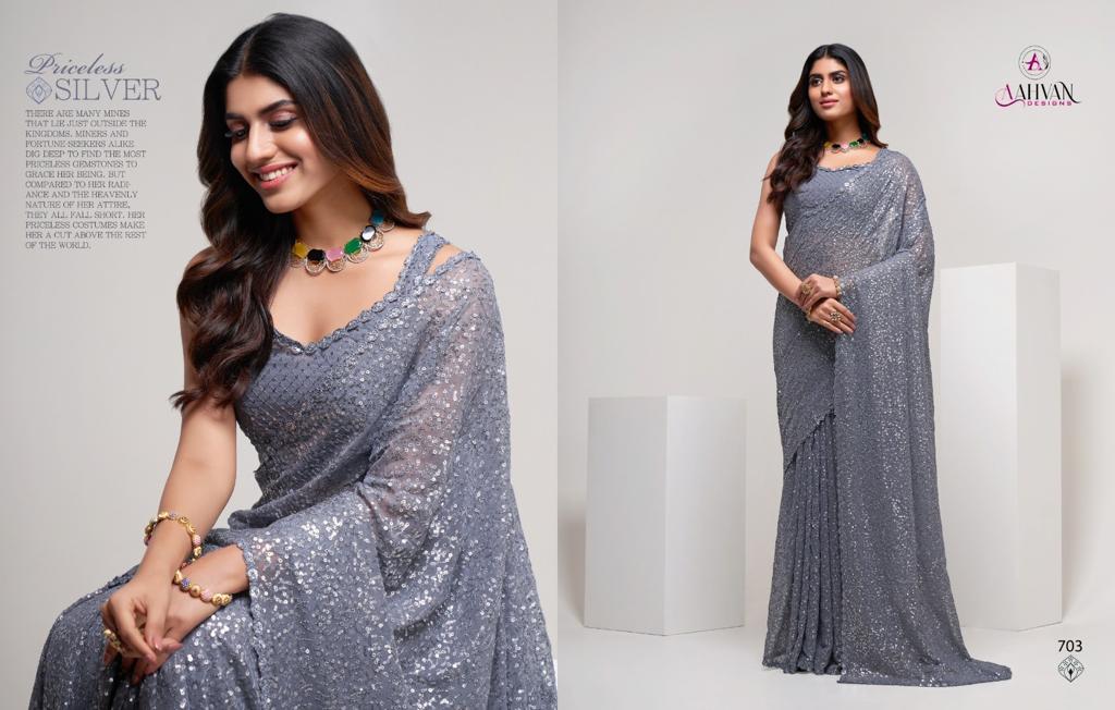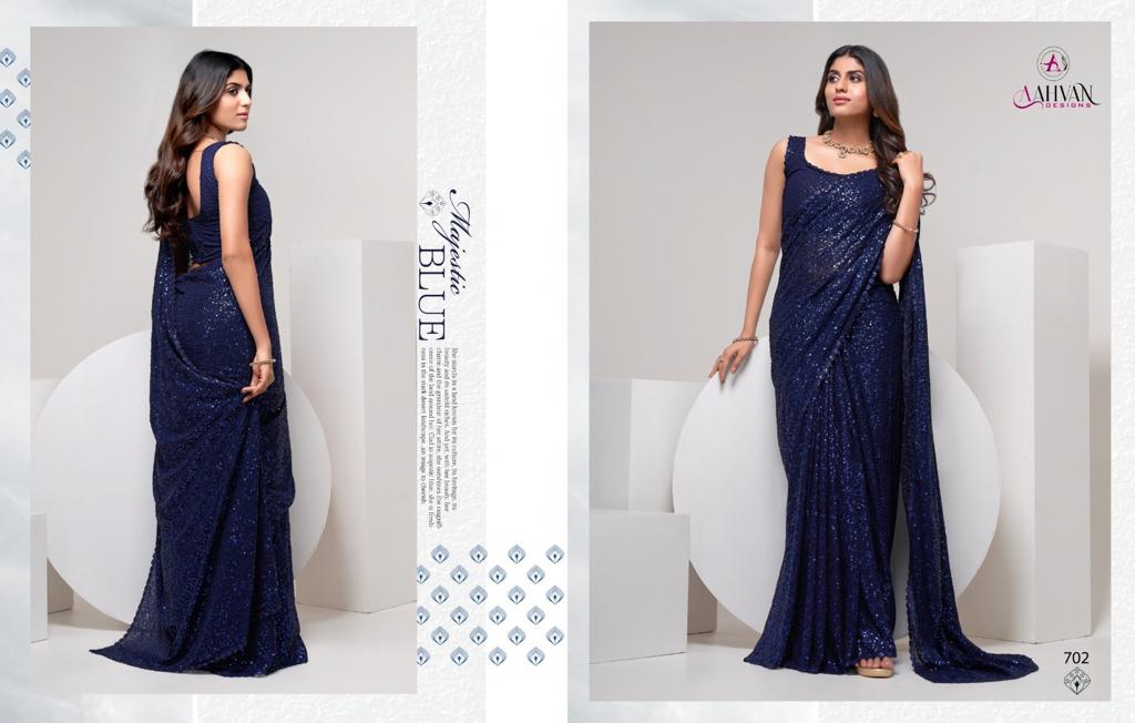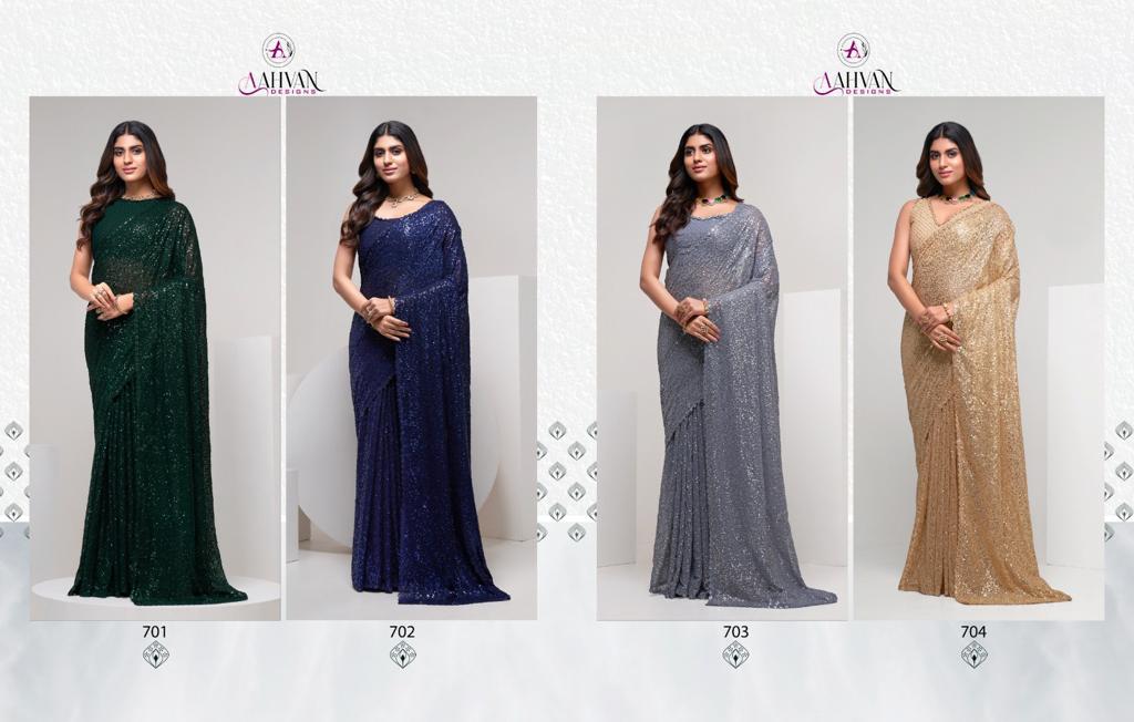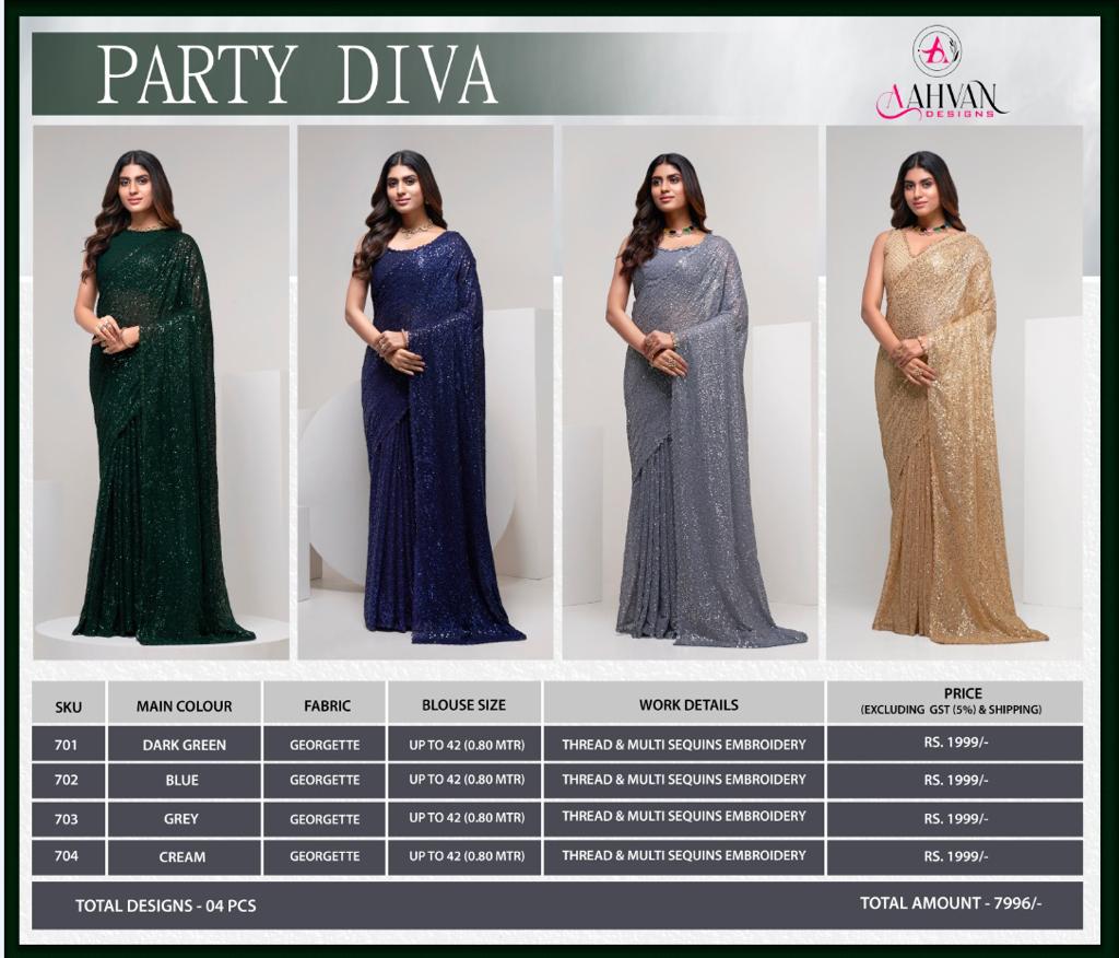Brand Name - Aahvan Designs Catalog Name - Party Diva (Total - 4 Pcs) Saree Fabric - Georgette Length Â? 5.5 Meter Work - Thread & Multi Sequins Embroidery Work Blouse Fabric - Georgette Work - Thread & Multi Sequins Embroidery Work Size - 0.8 Meter Stitch Type - Unstitched Price - Rs. 1999/- (Excluding Gst (5%) & Shipping) Gst Rate - 5% Singles Available Weight - 1Kg 100+single |