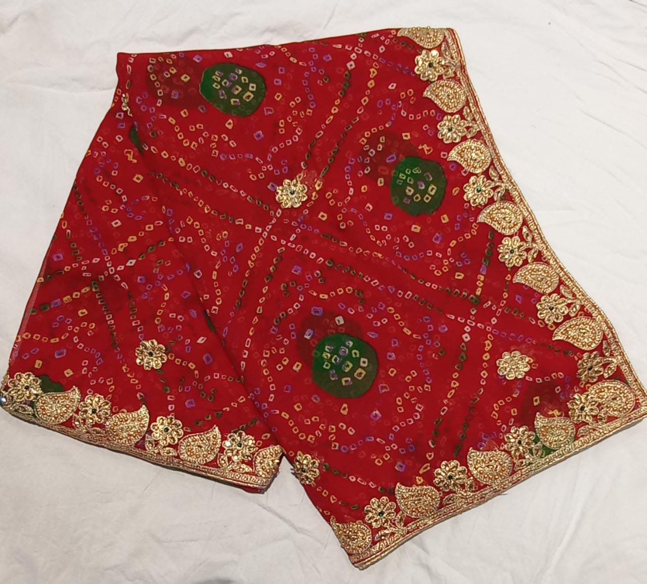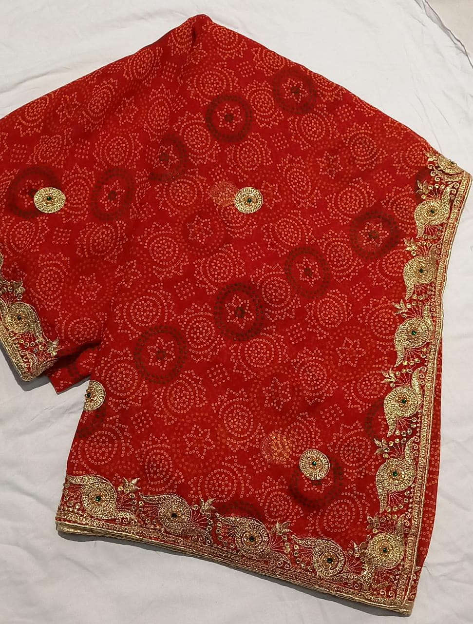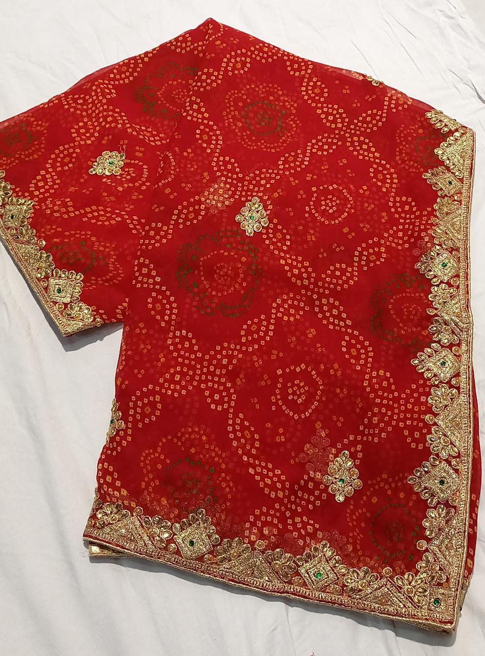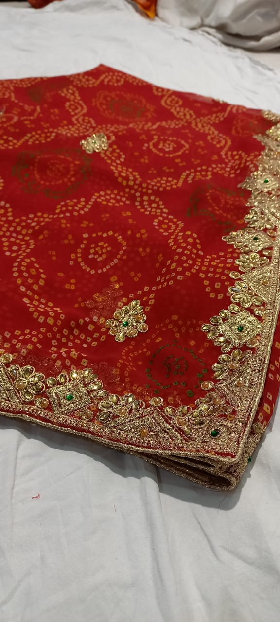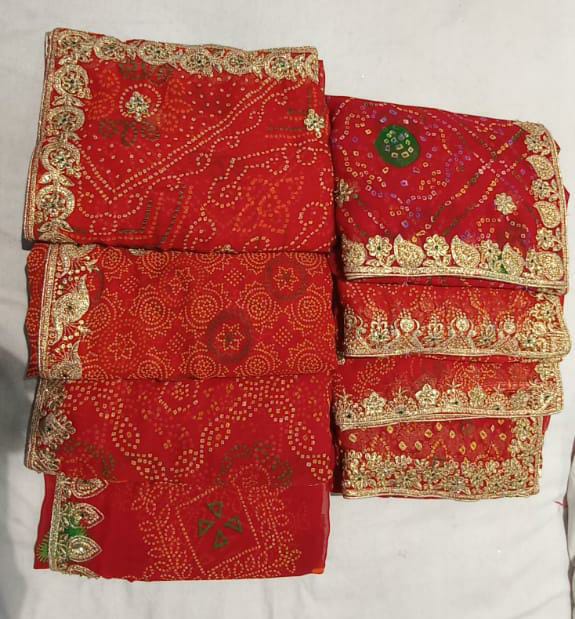 *NEW BRIGHT SINGLE RED HEAVY C-PALLU BANDHANI CATALOGUE WITH DIAMOND WORK ON IT* NAME - *PARVATI* PCS - *8 PCS* RATE - 790/- 5% GST SHIP EXTRA Singles available FABRICS - *HEAVY GORGET* 100+single |