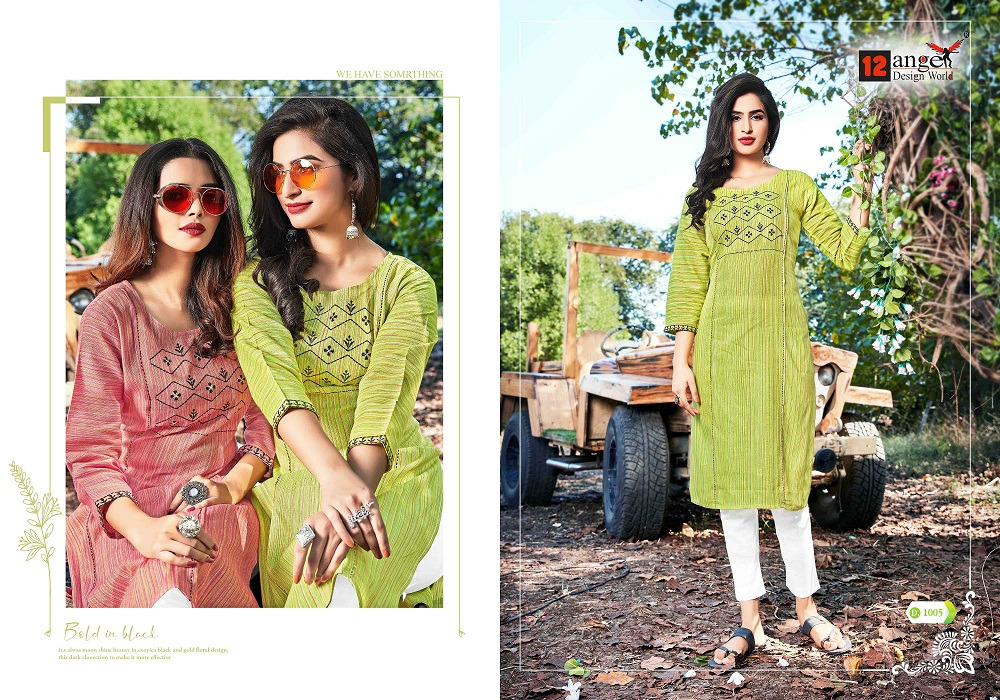 ?"12Angel" launching Casual Wear KURTI WITH WORK ?Catalog Name :-pestle ? -:Fabric:- cotton (100%) ?Top length :- 44 INS Size: M (38), L (40), XL (42), 2XL (44) Design:- 6 peaces set ?Rate: 299/- per pcs Set to set |