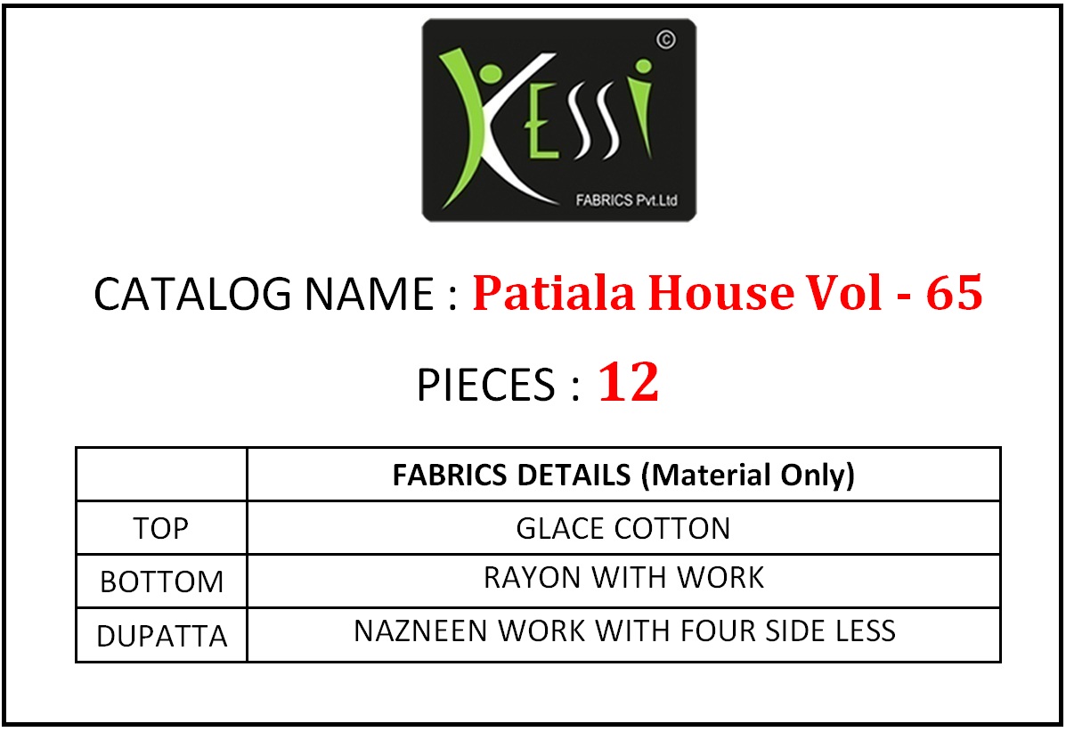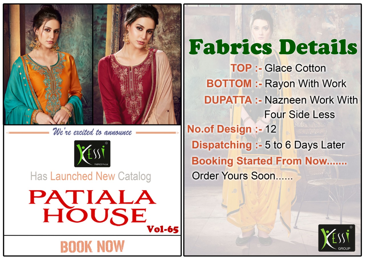 ? *Kessi Fabrics Pvt. Ltd.* has launched _Catalog name_ : *Patiala House Vol - 65* ? _Fabric Details_ ? ?Top :- GLACE COTTON ?Bottom:- RAYON WITH WORK ?Dupatta:- NAZNEEN WORK WITH FOUR SIDE LESS ?Total Design :- 12 ?Dispatching 5 to 6 days later ?Booking started from now... ?Order yours soon... Rate -799 per pcs . St to set . GST 5 Percent Extra |