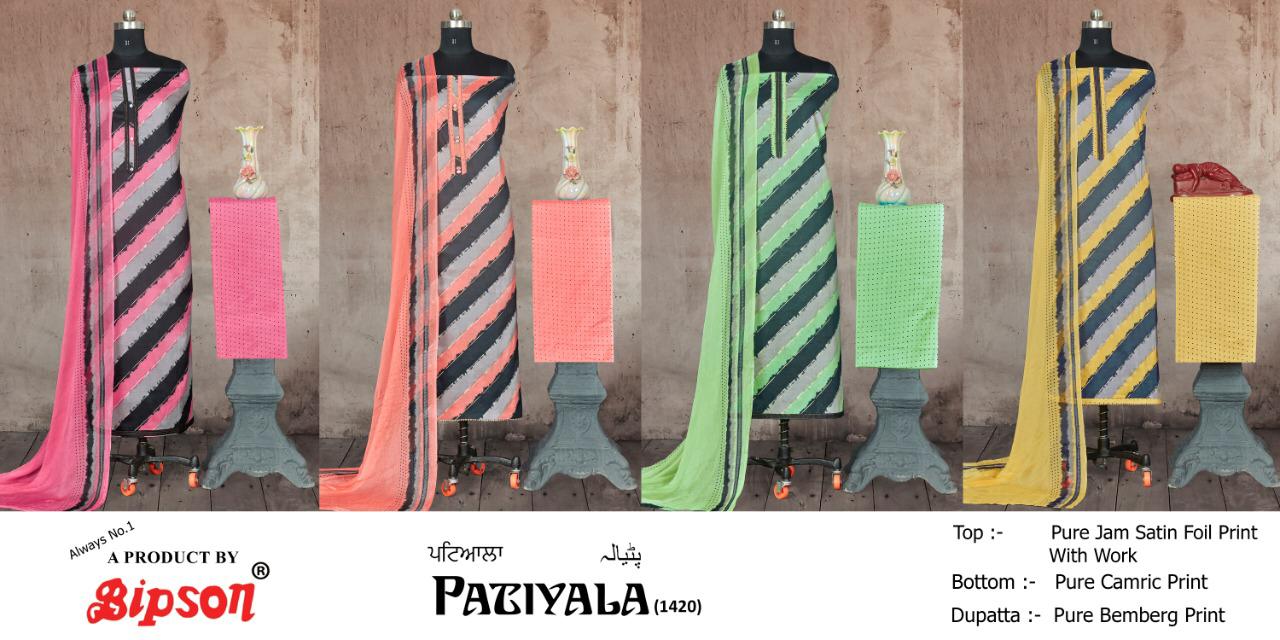Buy Online Patiyala 1420 By Bipson Manufacturer Traders Surat 4 Pcs of Full Catalogue at Wholesale Price. Looking for Patiyala 1420 By Bipson Manufacturer Traders Surat Full Catalouge at Best Price? Buy Now Patiyala 1420 By Bipson Manufacturer Traders Surat at Wholesale Rate of Rs 3180 with Total 4 Pcs from authroized dealer and supplier of Bipson prints pvt ltd Brand. Cost of Each piece is just only Rs 795 which is very low and affordable price to resale the product in your retail store ,This is Surat based Wholesale Supplier & Dealer of Bipson prints pvt ltd Brand. Click on Brand name to Know more about Bipson prints pvt ltd Brand's products.Call or Whatsapp on 9898838984 for booking or enquiry