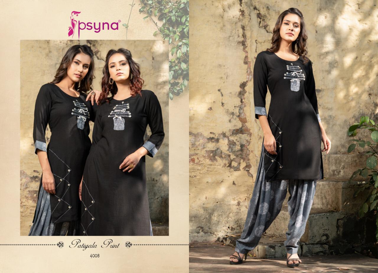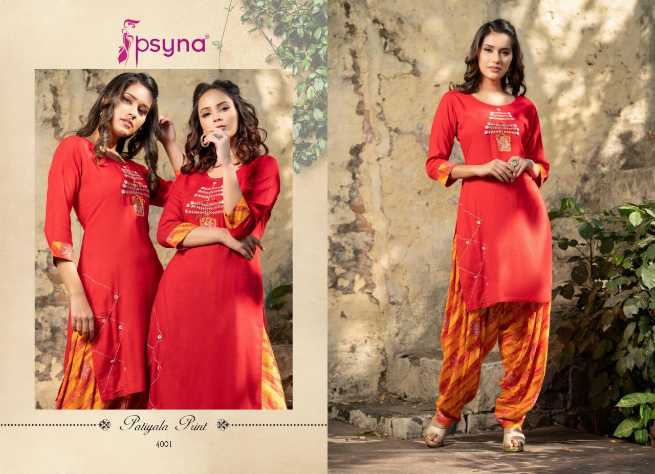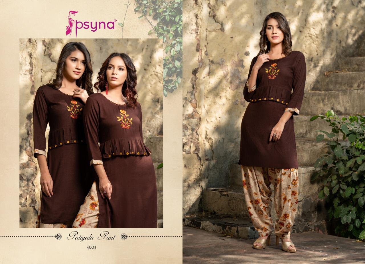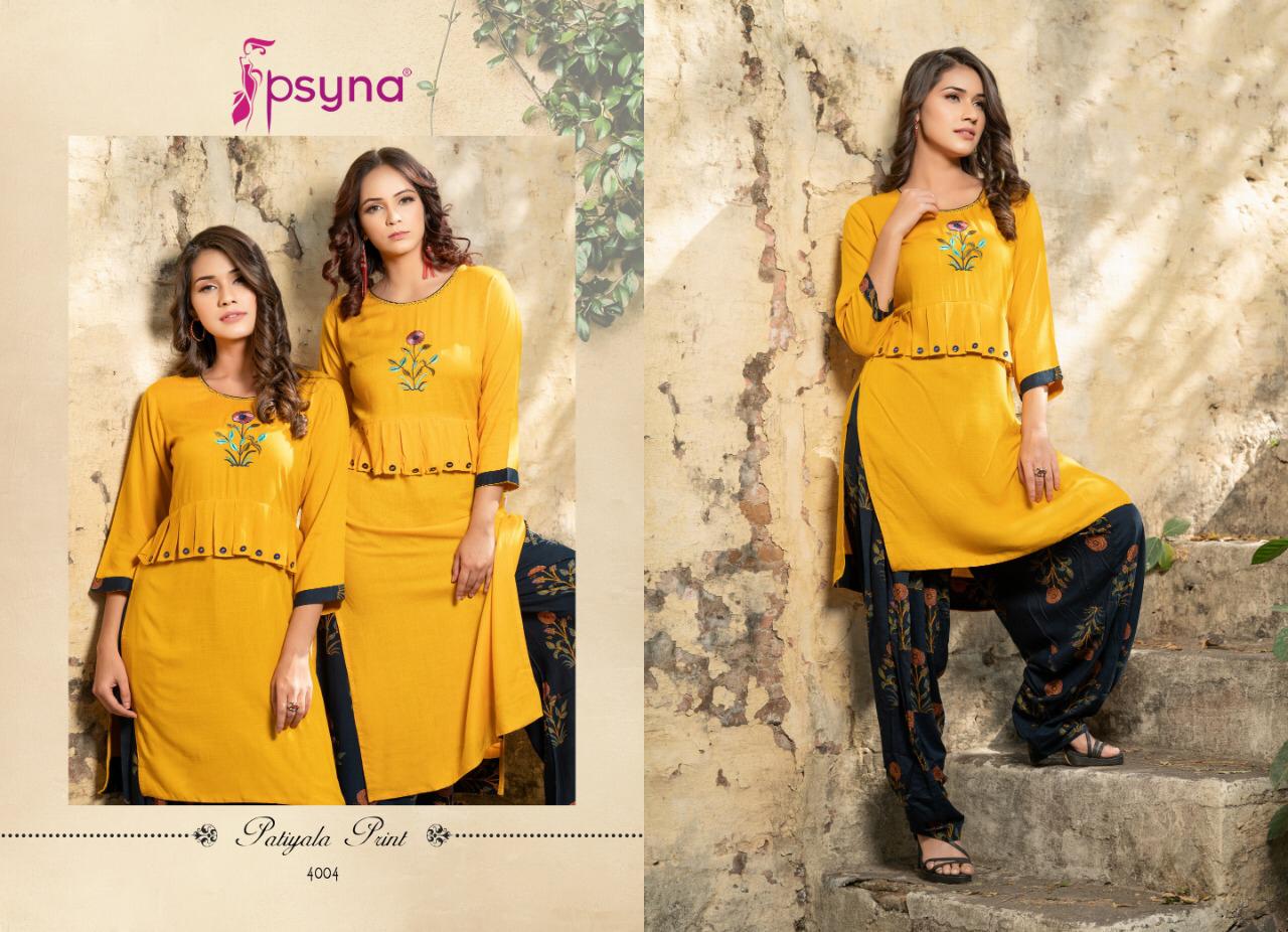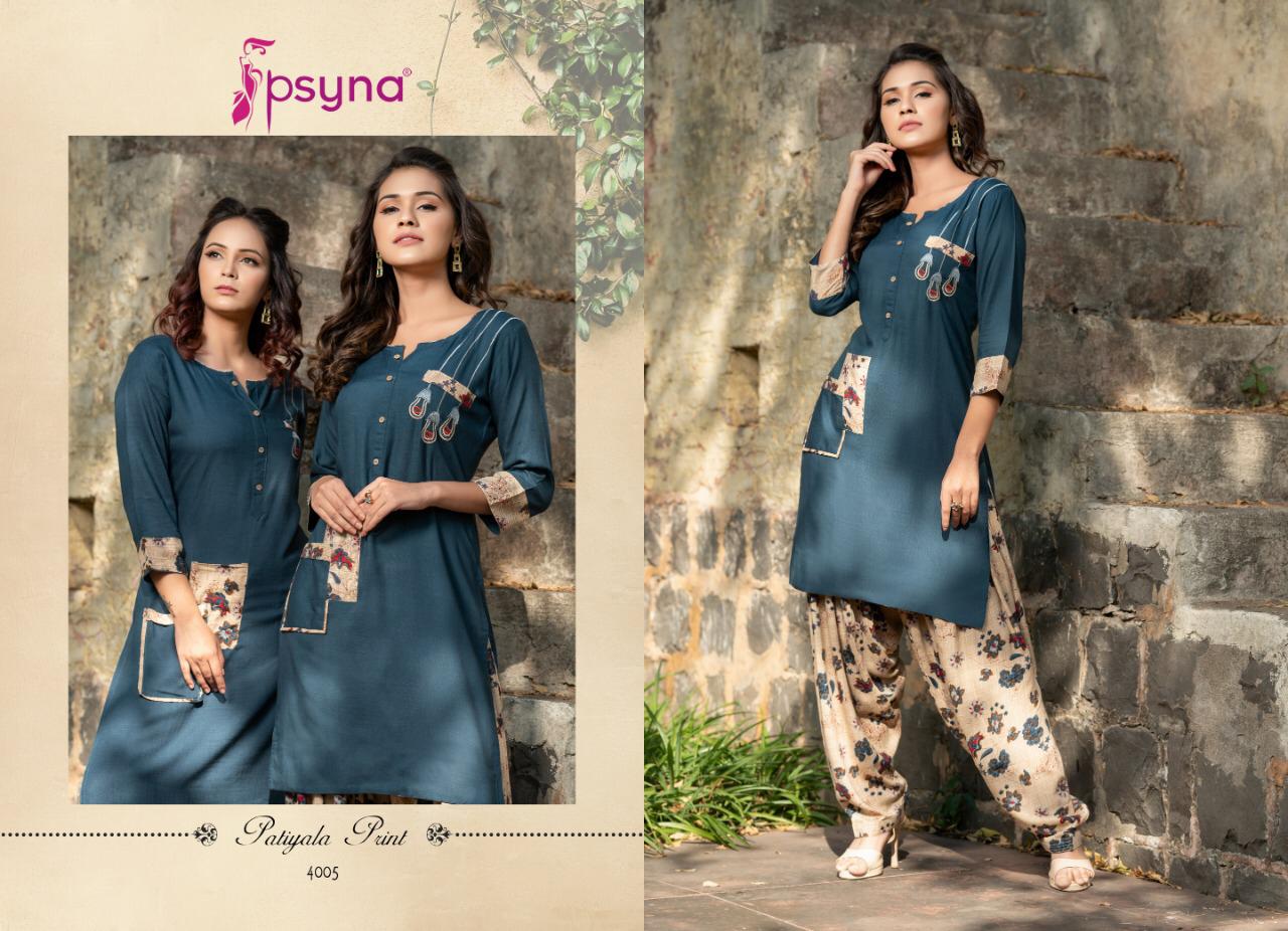 Buy Online Patiyala Print Vol 4 By Psyna 4001 Series Fancy Reyon Slub Kurti With Patiyala Collection Wholesaler Surat 10 Pcs of Full Catalogue at Wholesale Price. Looking for Patiyala Print Vol 4 By Psyna 4001 Series Fancy Reyon Slub Kurti With Patiyala Collection Wholesaler Surat Full Catalouge at Best Price? Buy Now Patiyala Print Vol 4 By Psyna 4001 Series Fancy Reyon Slub Kurti With Patiyala Collection Wholesaler Surat at Wholesale Rate of Rs 6990 with Total 10 Pcs from authroized dealer and supplier of PSYNA Brand. Cost of Each piece is just only Rs 699 which is very low and affordable price to resale the product in your retail store ,This is Surat based Wholesale Supplier & Dealer of PSYNA Brand. Click on Brand name to Know more about PSYNA Brand's products.Call or Whatsapp on 9898838984 for booking or enquiry