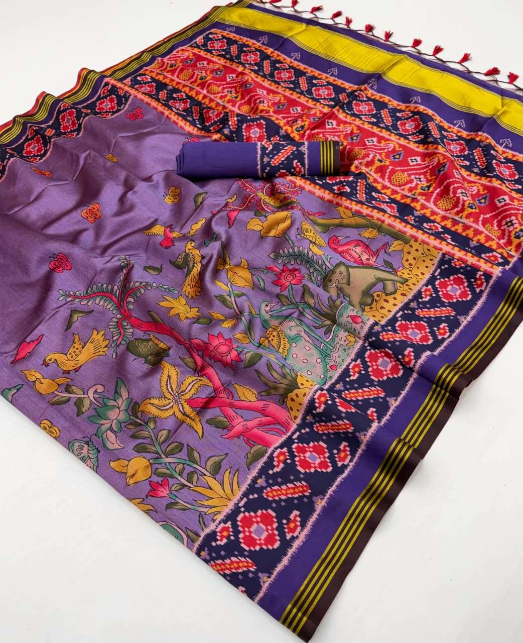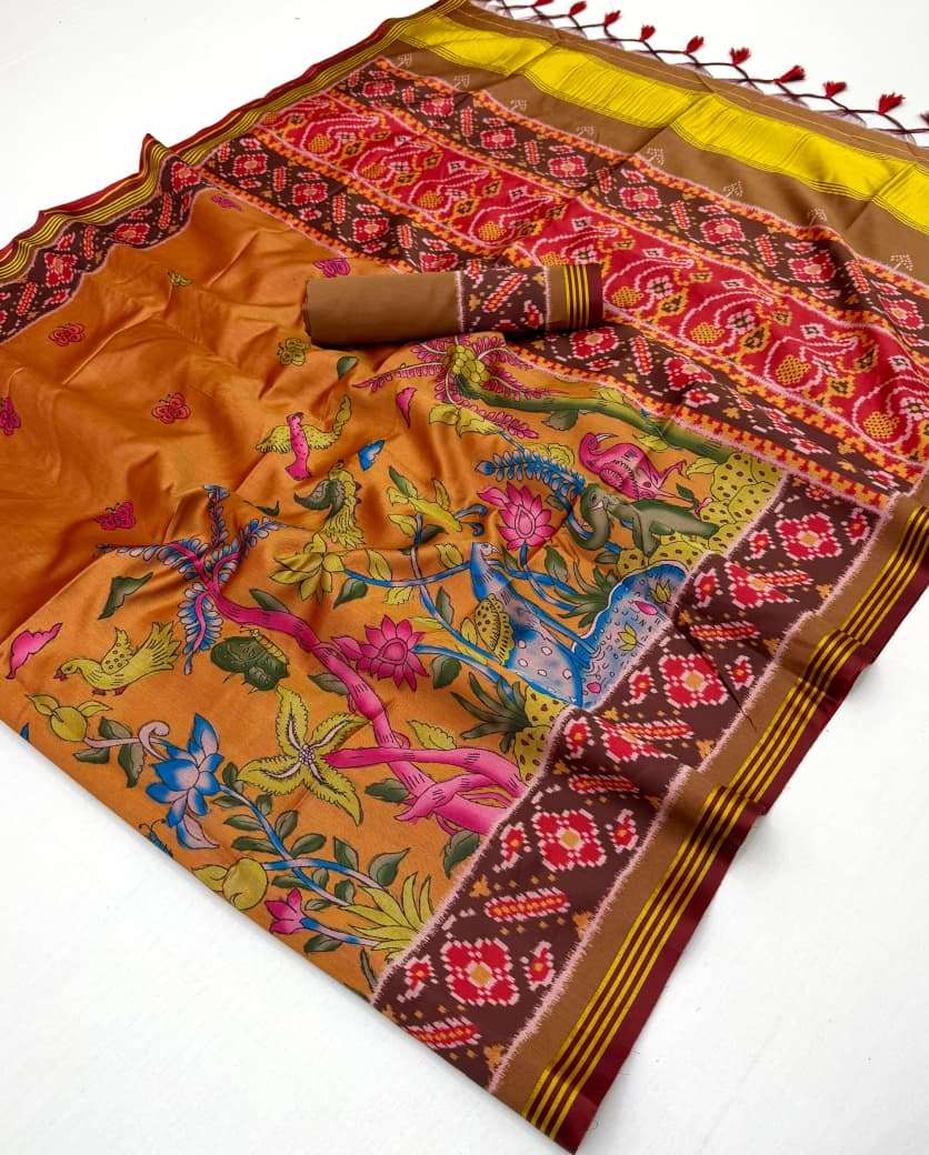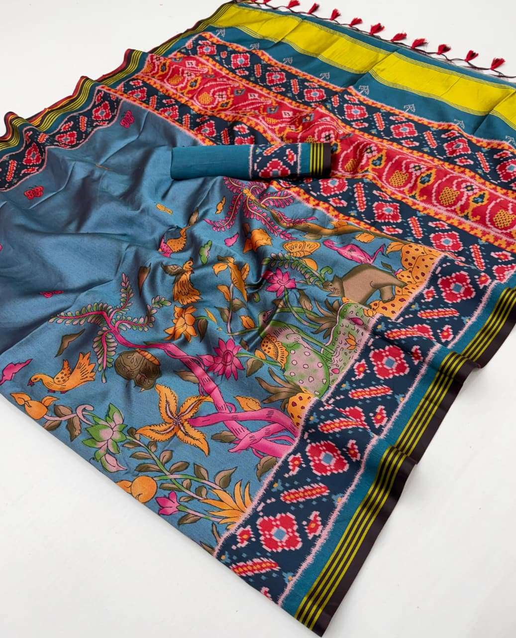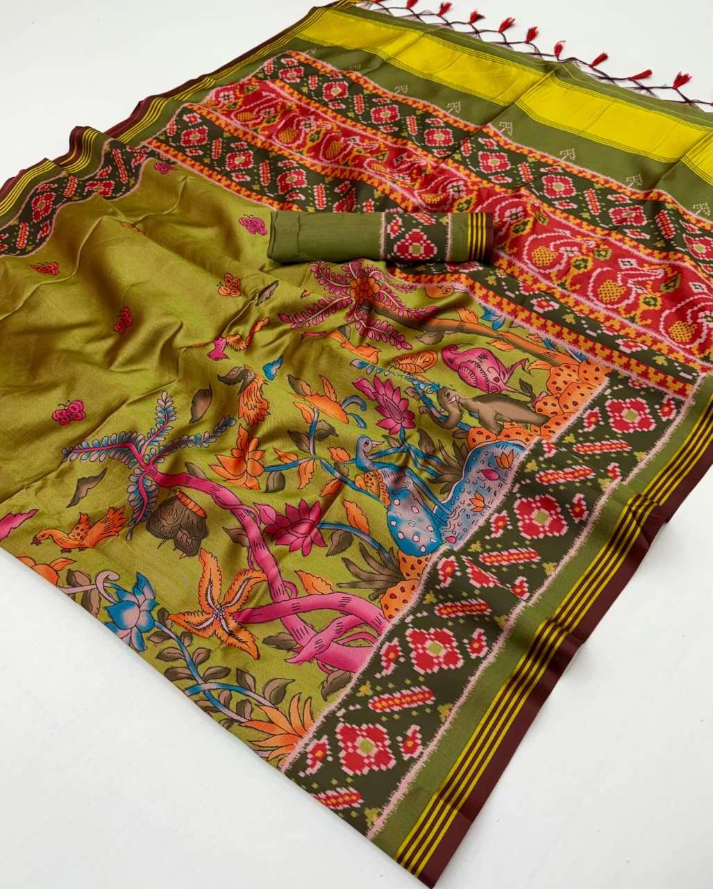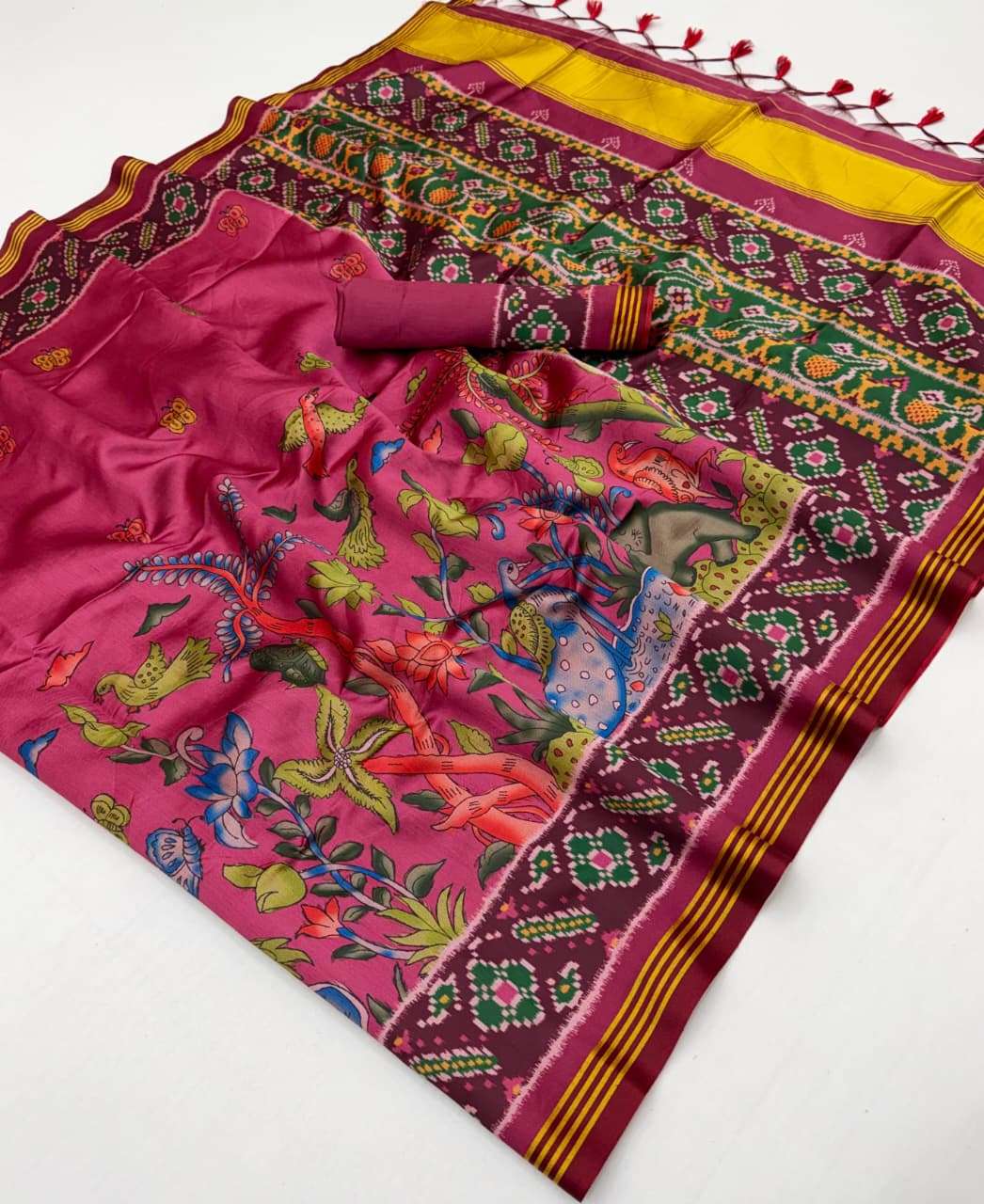 🔰*FABRIC DETAILS:-* ▪︎ *SUPERIOR TWILL P.V.SILK WITH WEAVING BORDER AND PALLU WITH EXCELLENT PATAN PATOLA PRINT TRADITION OF GUJRAT WITH SUPER SOFT FINISH WITH HAND TASSLES*