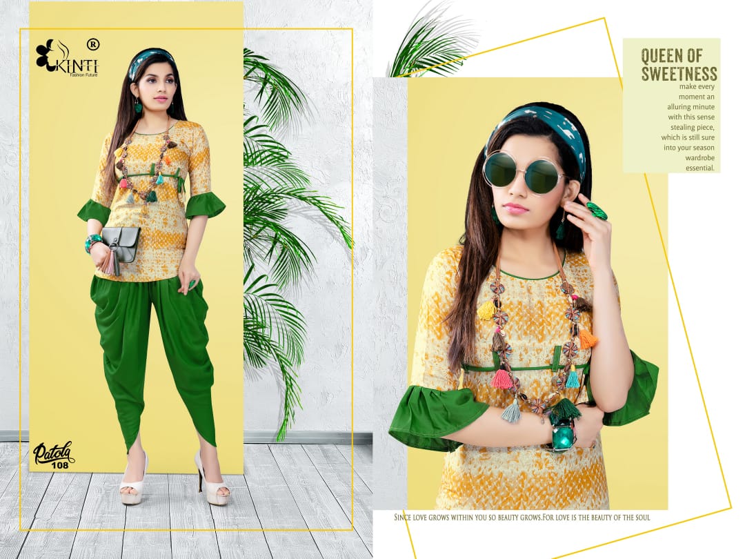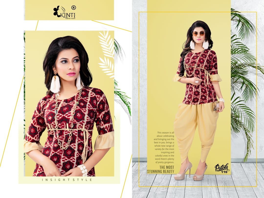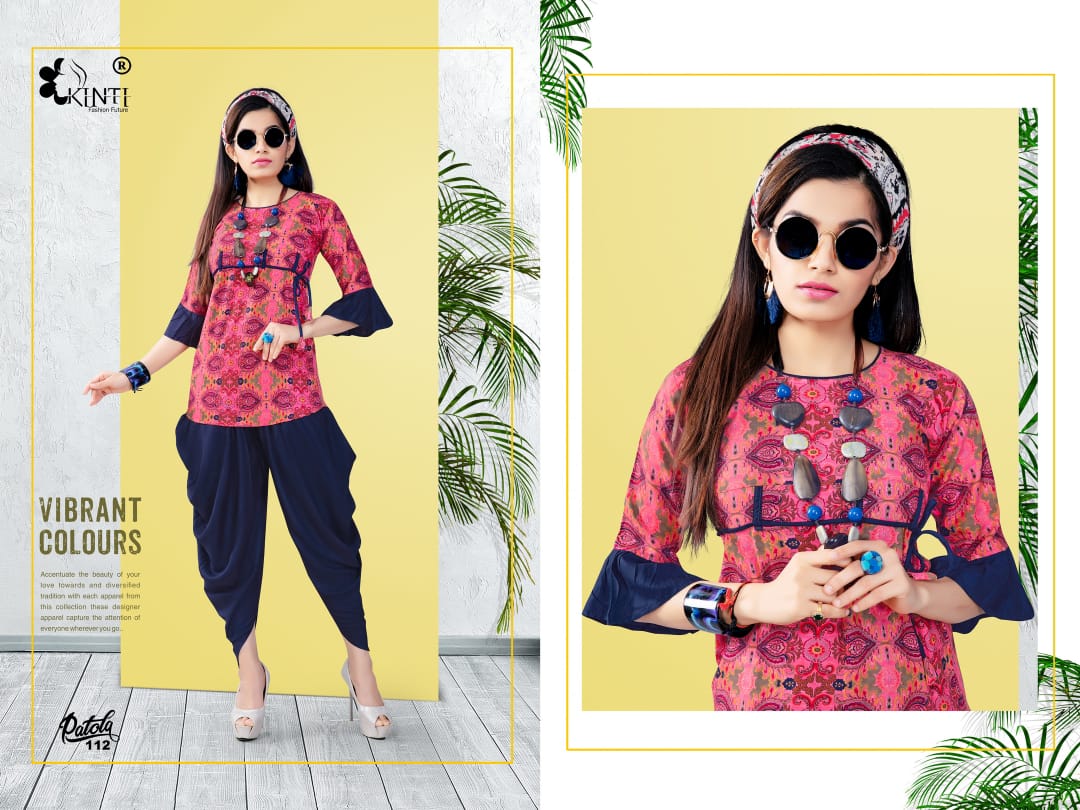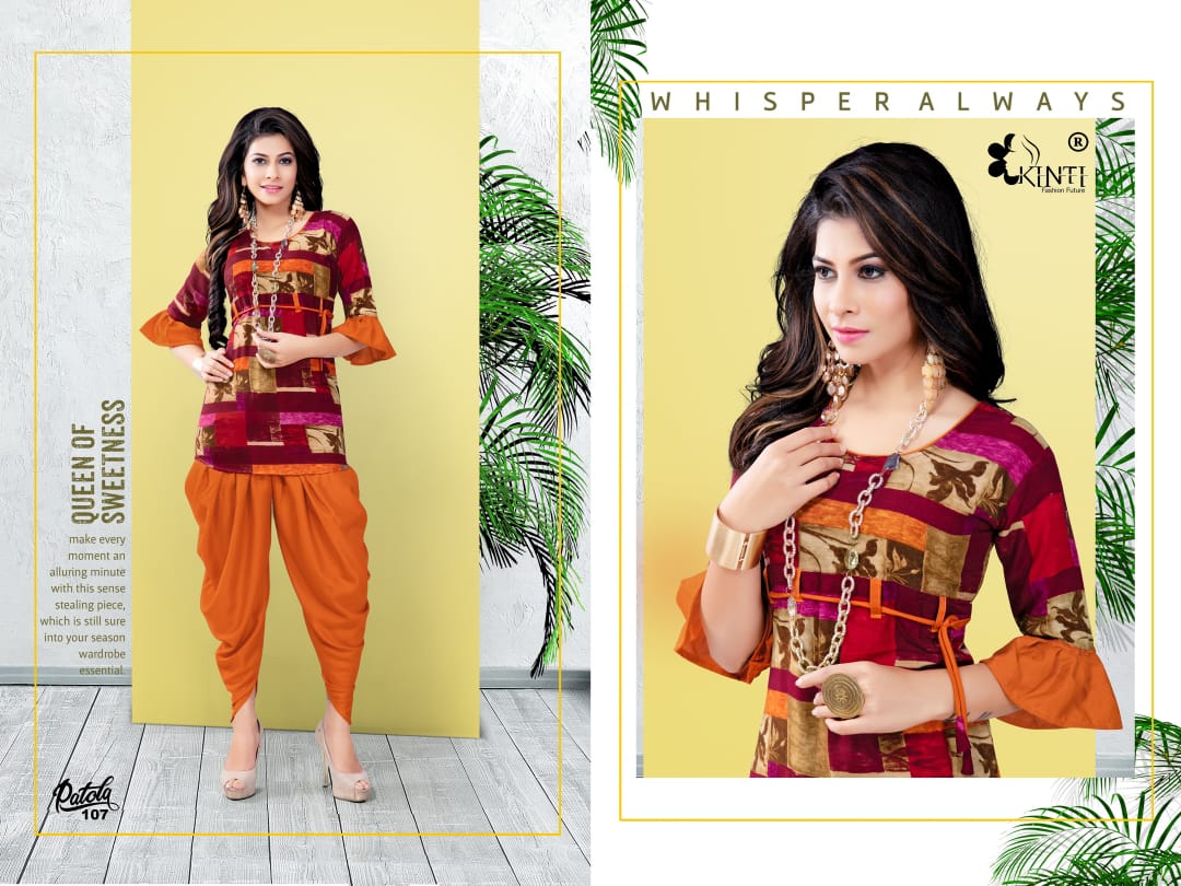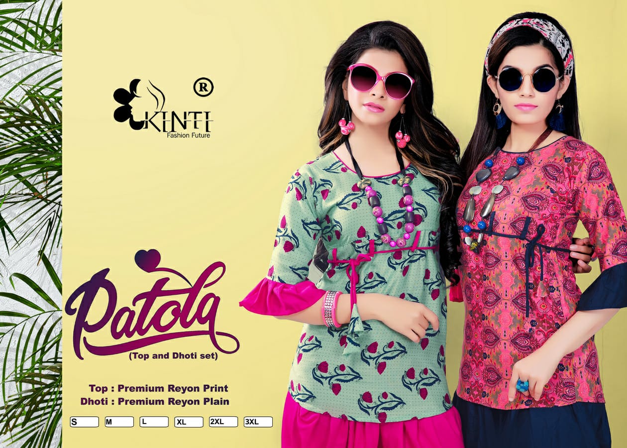 *Patola* *By KINTi* ® Style. : *Dhoti and Top Set* *Top* Fabric. : *Reyon 14 kg Print* *Dhoti* Fabric. : *Reyon 14kg* Sizes : *S M L xl xxl* Designs : *12* *Rate :- 460 + gst 5%* |