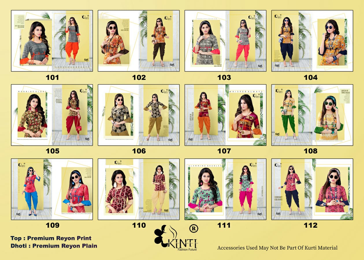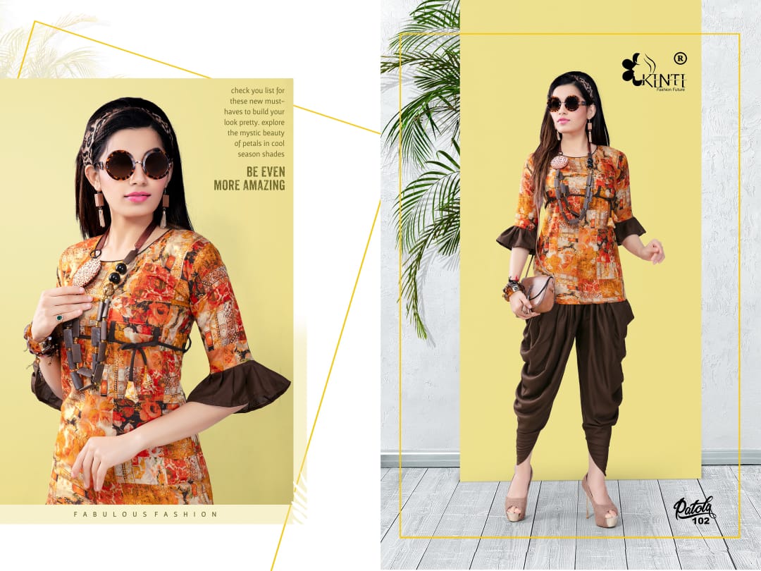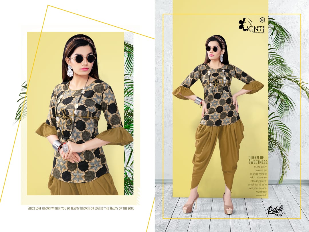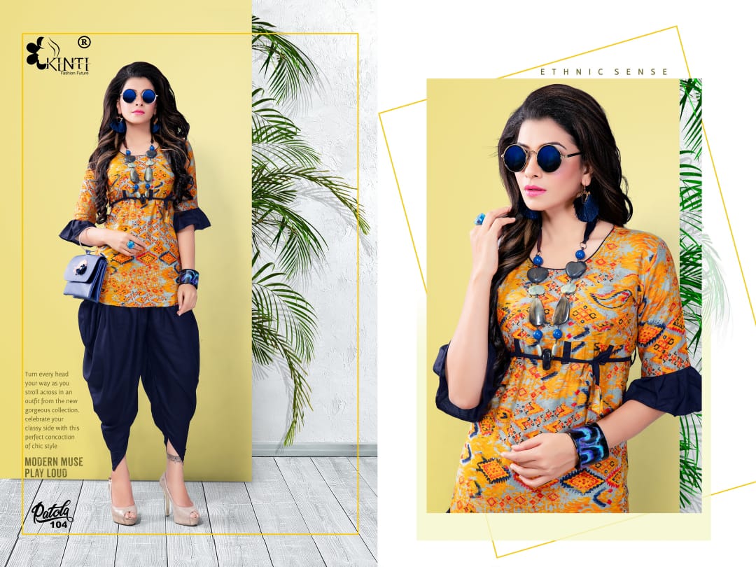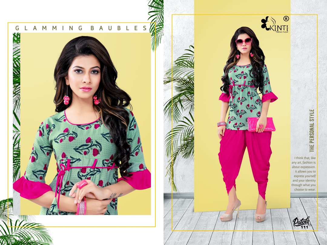 *Patola* *By KINTi* ® Style. : *Dhoti and Top Set* *Top* Fabric. : *Reyon 14 kg Print* *Dhoti* Fabric. : *Reyon 14kg* Sizes : *S M L xl xxl* Designs : *12* *Rate :- 460 + gst 5%* |