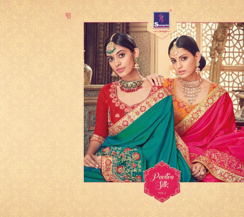 Pavitra silk Vol 2 by Sangrila Shangrila presents enhanced and more elegant version of our best selling catalog "SHACHI SILK" with eye catching work and more rich and vibrant colours. 12 pcs 12 design Price :- 1390/- Set to set. GST 5 Percent Extra. Delivery from today |