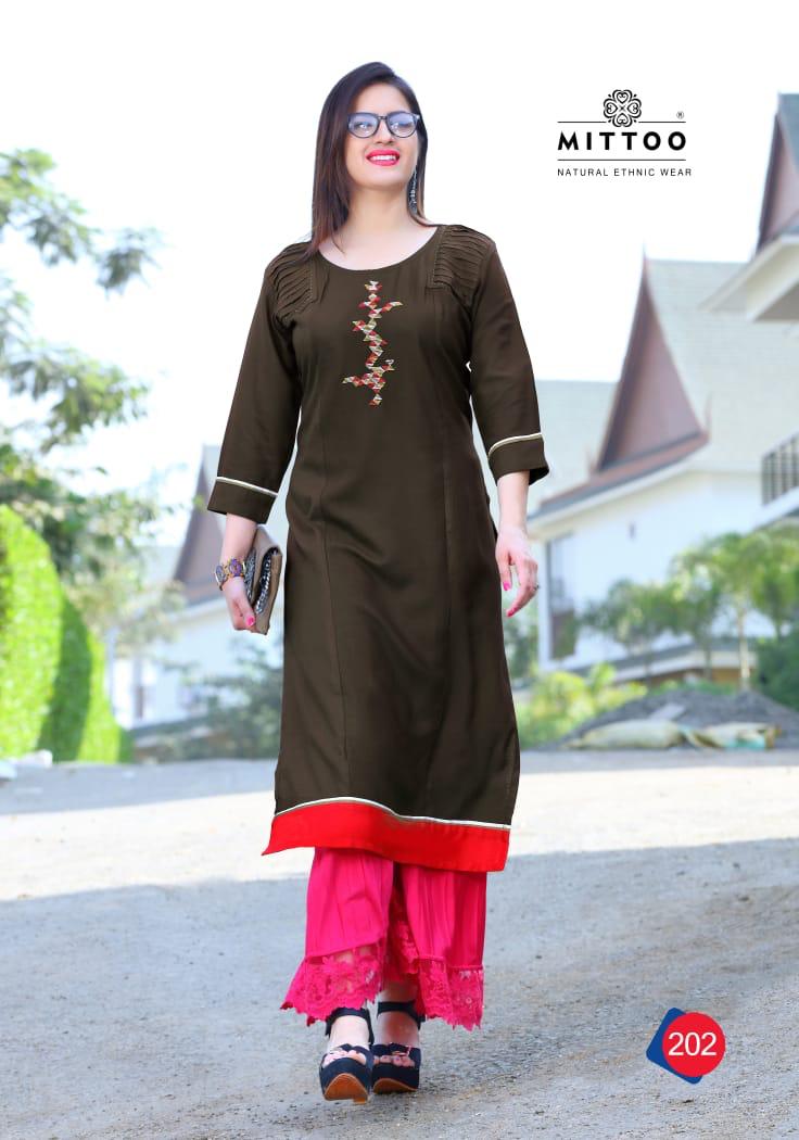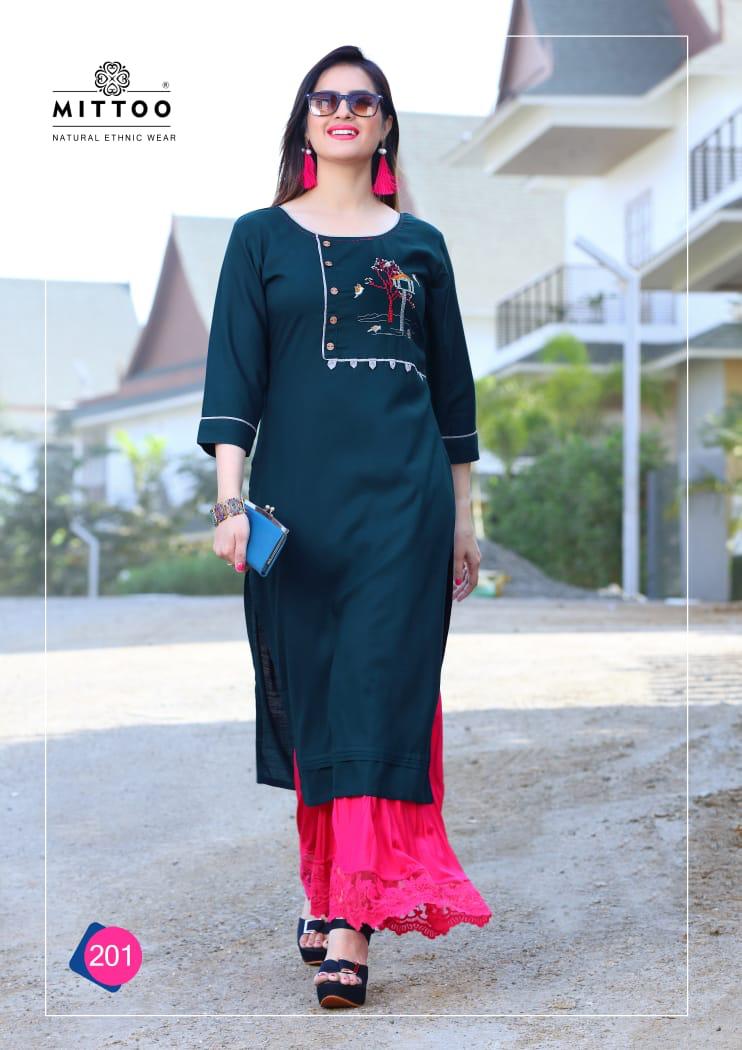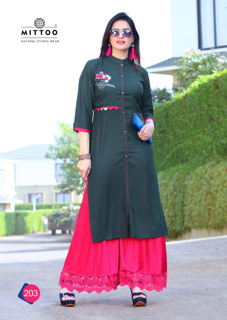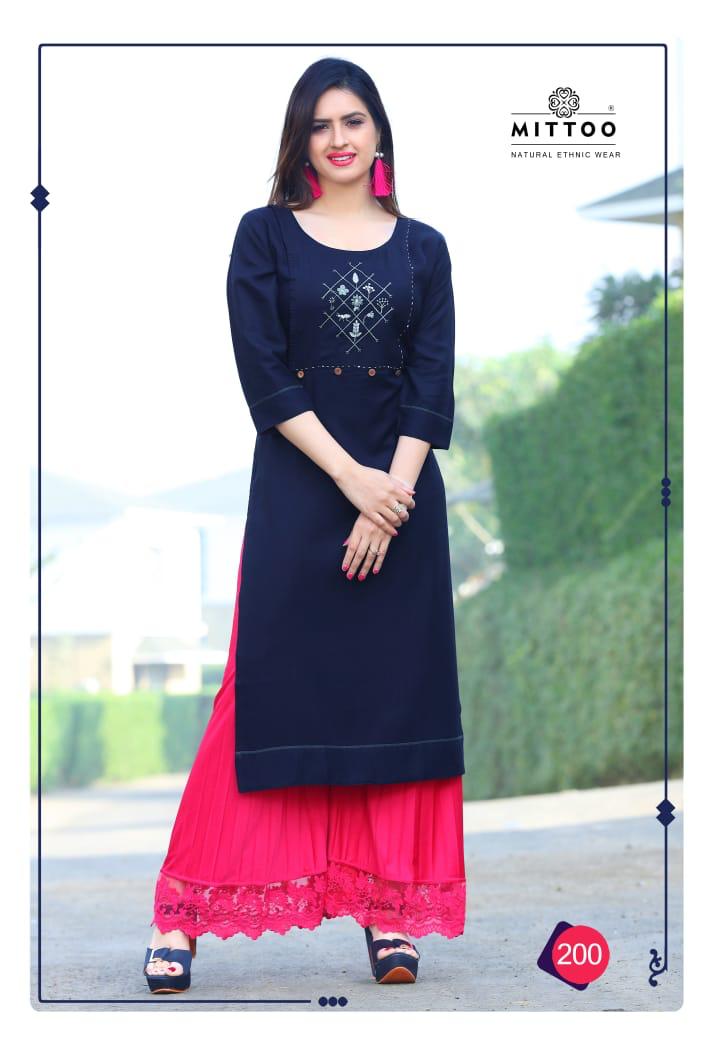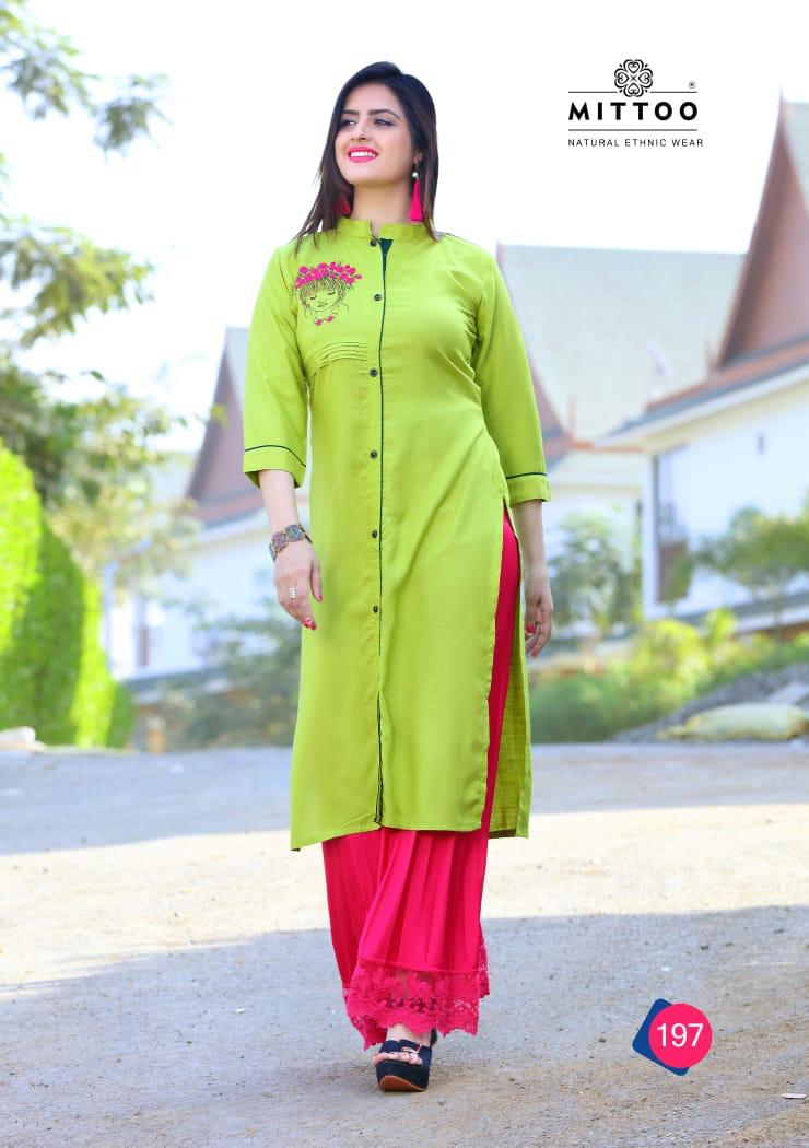 Buy Online Payal Vol 10 By Mittoo 197 Series Fancy Designer Reyon Kurti Catlog Wholesaler Surat 7 Pcs of Full Catalogue at Wholesale Price. Looking for Payal Vol 10 By Mittoo 197 Series Fancy Designer Reyon Kurti Catlog Wholesaler Surat Full Catalouge at Best Price? Buy Now Payal Vol 10 By Mittoo 197 Series Fancy Designer Reyon Kurti Catlog Wholesaler Surat at Wholesale Rate of Rs 2975 with Total 7 Pcs from authroized dealer and supplier of MITTOO Brand. Cost of Each piece is just only Rs 425 which is very low and affordable price to resale the product in your retail store ,This is Surat based Wholesale Supplier & Dealer of MITTOO Brand. Click on Brand name to Know more about MITTOO Brand's products.Call or Whatsapp on 9898838984 for booking or enquiry