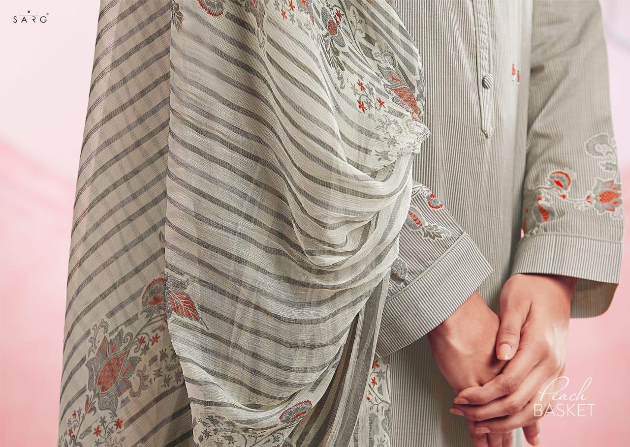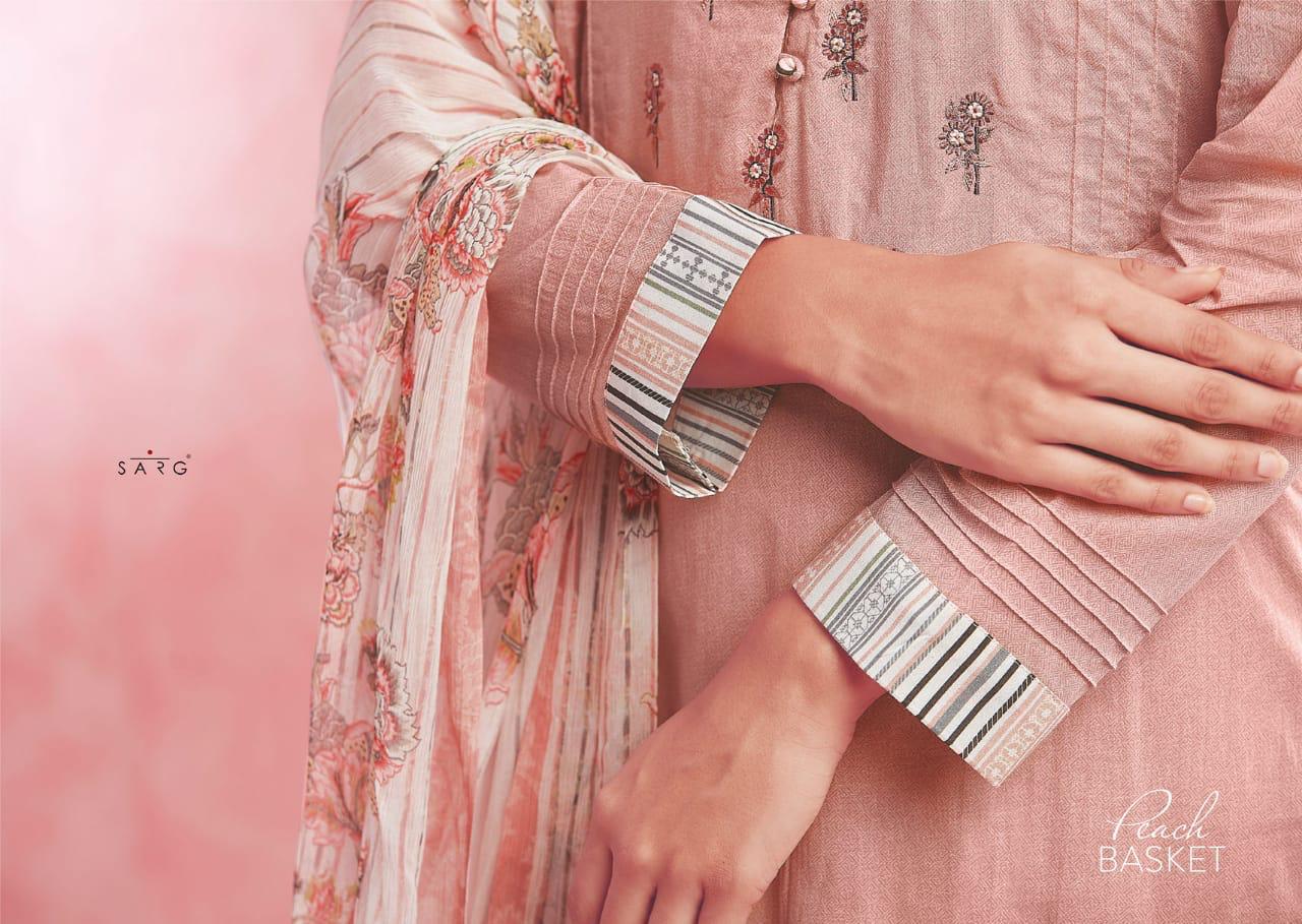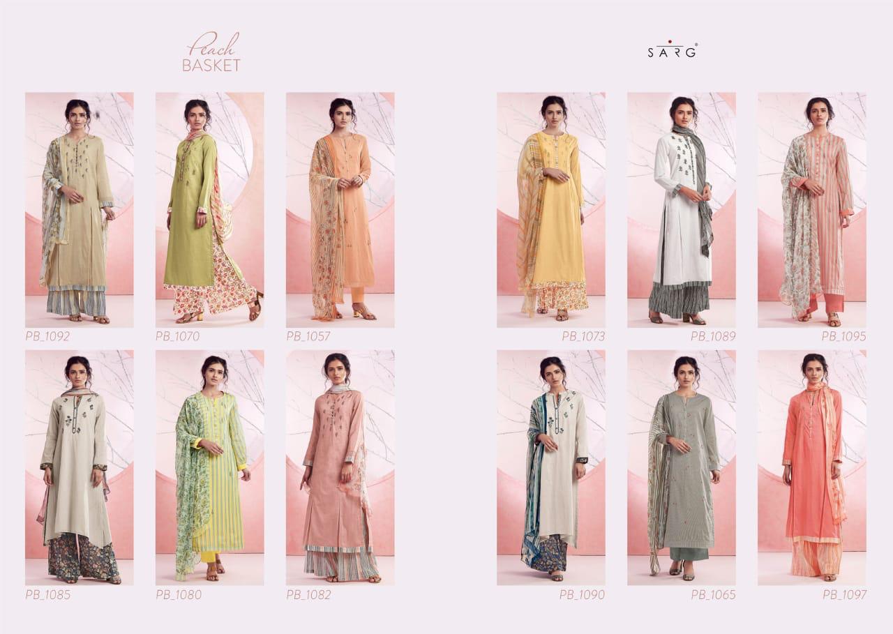 Buy Online Peach Basket By Sarg Lawn Cotton Embroidered Suits Wholesale Supplier Surat 12 Pcs of Full Catalogue at Wholesale Price. Looking for Peach Basket By Sarg Lawn Cotton Embroidered Suits Wholesale Supplier Surat Full Catalouge at Best Price? Buy Now Peach Basket By Sarg Lawn Cotton Embroidered Suits Wholesale Supplier Surat at Wholesale Rate of Rs 19140 with Total 12 Pcs from authroized dealer and supplier of SARG Brand. Cost of Each piece is just only Rs 1595 which is very low and affordable price to resale the product in your retail store ,This is Surat based Wholesale Supplier & Dealer of SARG Brand. Click on Brand name to Know more about SARG Brand's products.Call or Whatsapp on 9898838984 for booking or enquiry