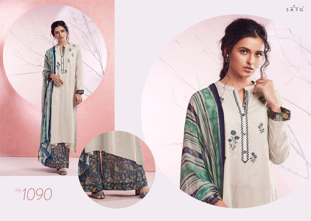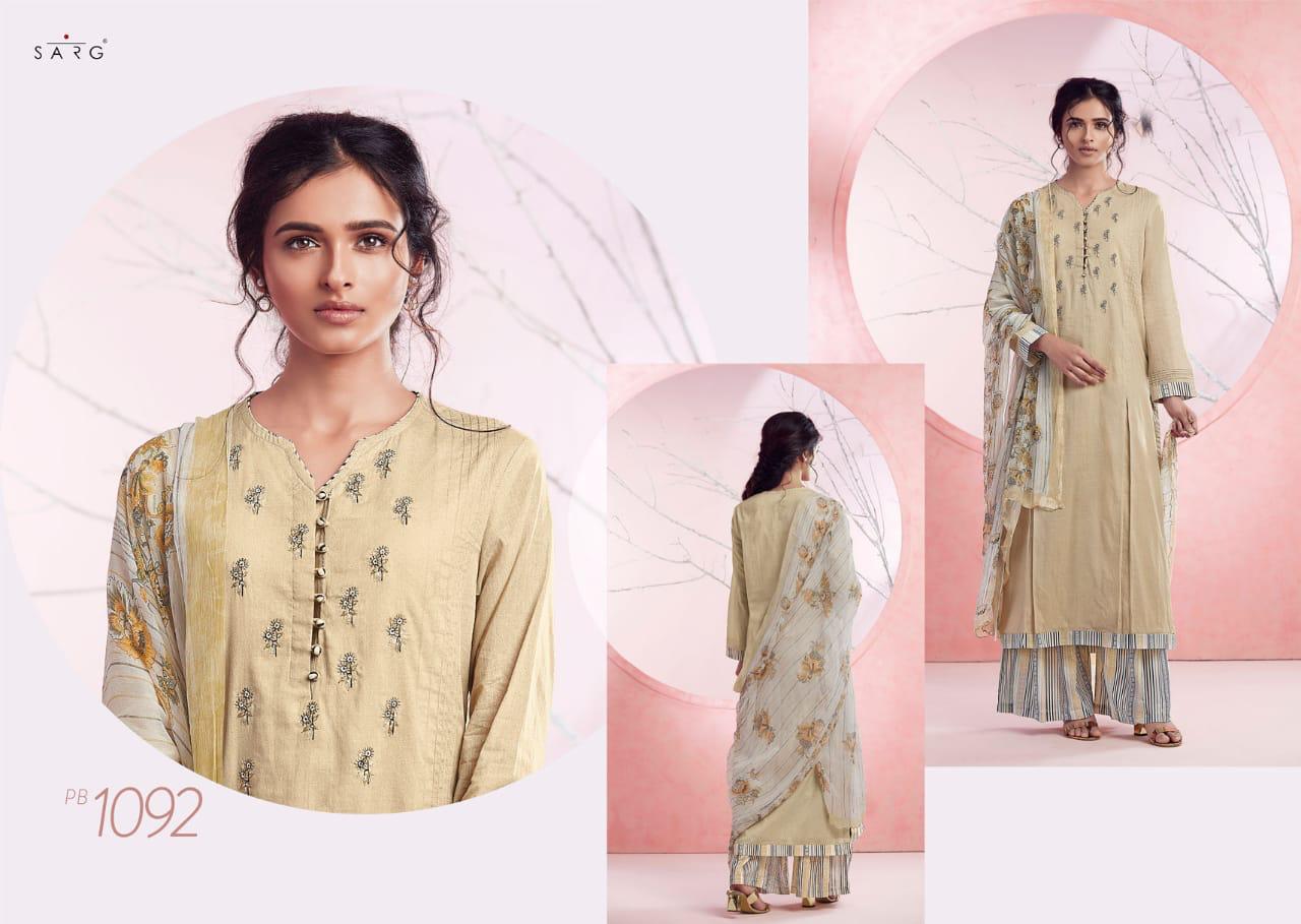 *SARG* A SAHIBA BRAND PRESENTS ITS LATEST CATALOGUE . . *PEACH BASKET* Â?Â?Â?Â?Â?Â?Â?Â?Â?Â?Â?Â?Â?- _FABRIC DETAILS??_ TOP-PURE COTTON LAWN DIGITAL PRINT WITH EMBROIDERY WORK BOTTOM-CAMBRIC DIGITAL PRINT DUPATTA-PURE BEMBERG DIGITAL PRINT _______________________________ *RATE-1595?* 5%GST APPLICABLE SET TO SET DELIVERY 2 DAYS |