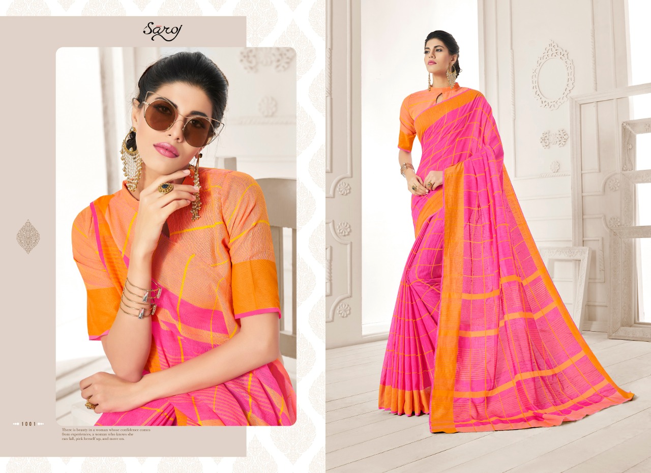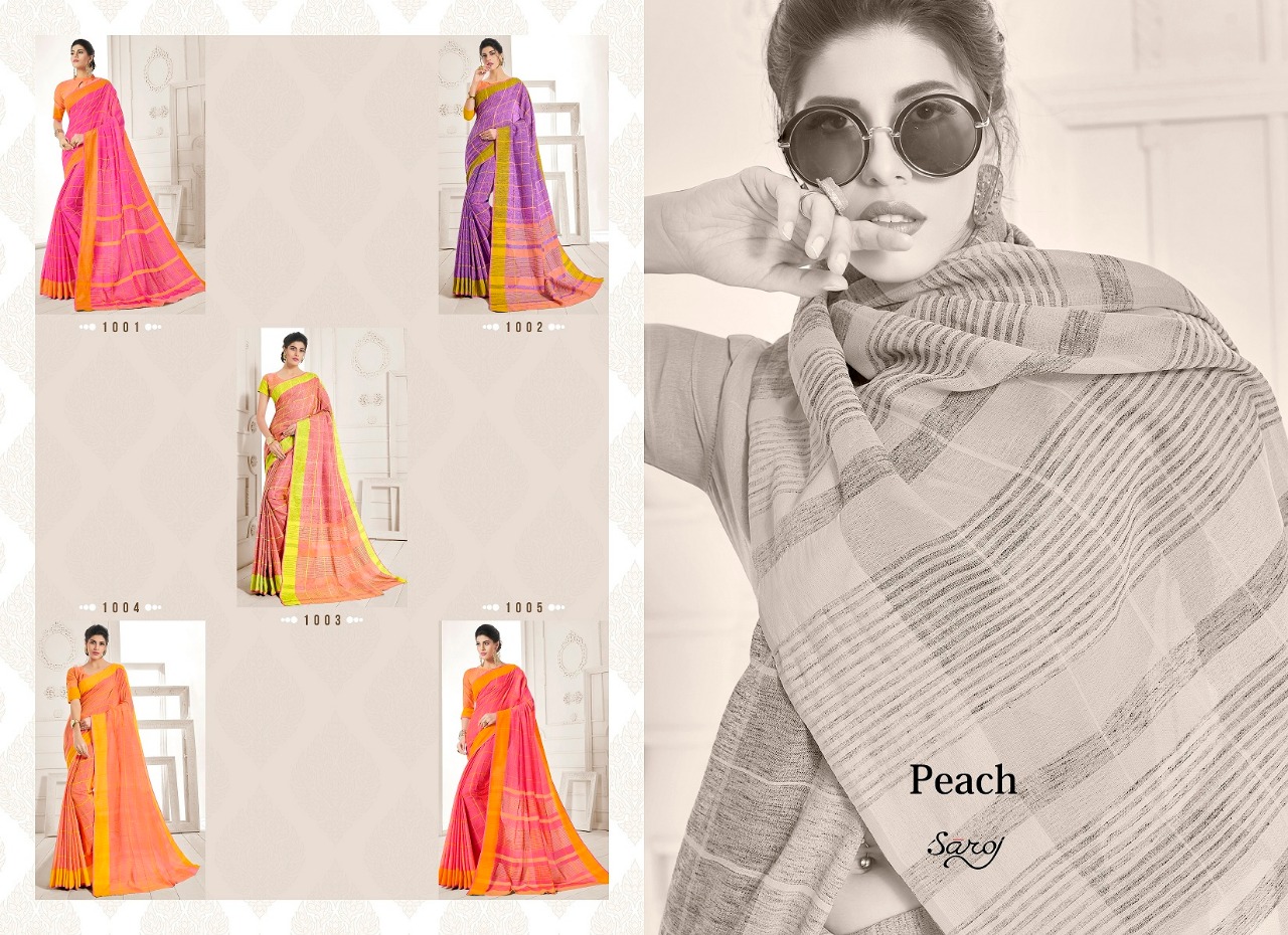 Buy Online Peach By Saroj 1001 Series Fancy Linen Cotton Saree Catlog Wholesale Supplier Surat 5 Pcs of Full Catalogue at Wholesale Price. Looking for Peach By Saroj 1001 Series Fancy Linen Cotton Saree Catlog Wholesale Supplier Surat Full Catalouge at Best Price? Buy Now Peach By Saroj 1001 Series Fancy Linen Cotton Saree Catlog Wholesale Supplier Surat at Wholesale Rate of Rs 4125 with Total 5 Pcs from authroized dealer and supplier of SAROJ SAREE Brand. Cost of Each piece is just only Rs 825 which is very low and affordable price to resale the product in your retail store ,This is Surat based Wholesale Supplier & Dealer of SAROJ SAREE Brand. Click on Brand name to Know more about SAROJ SAREE Brand's products.Call or Whatsapp on 9898838984 for booking or enquiry