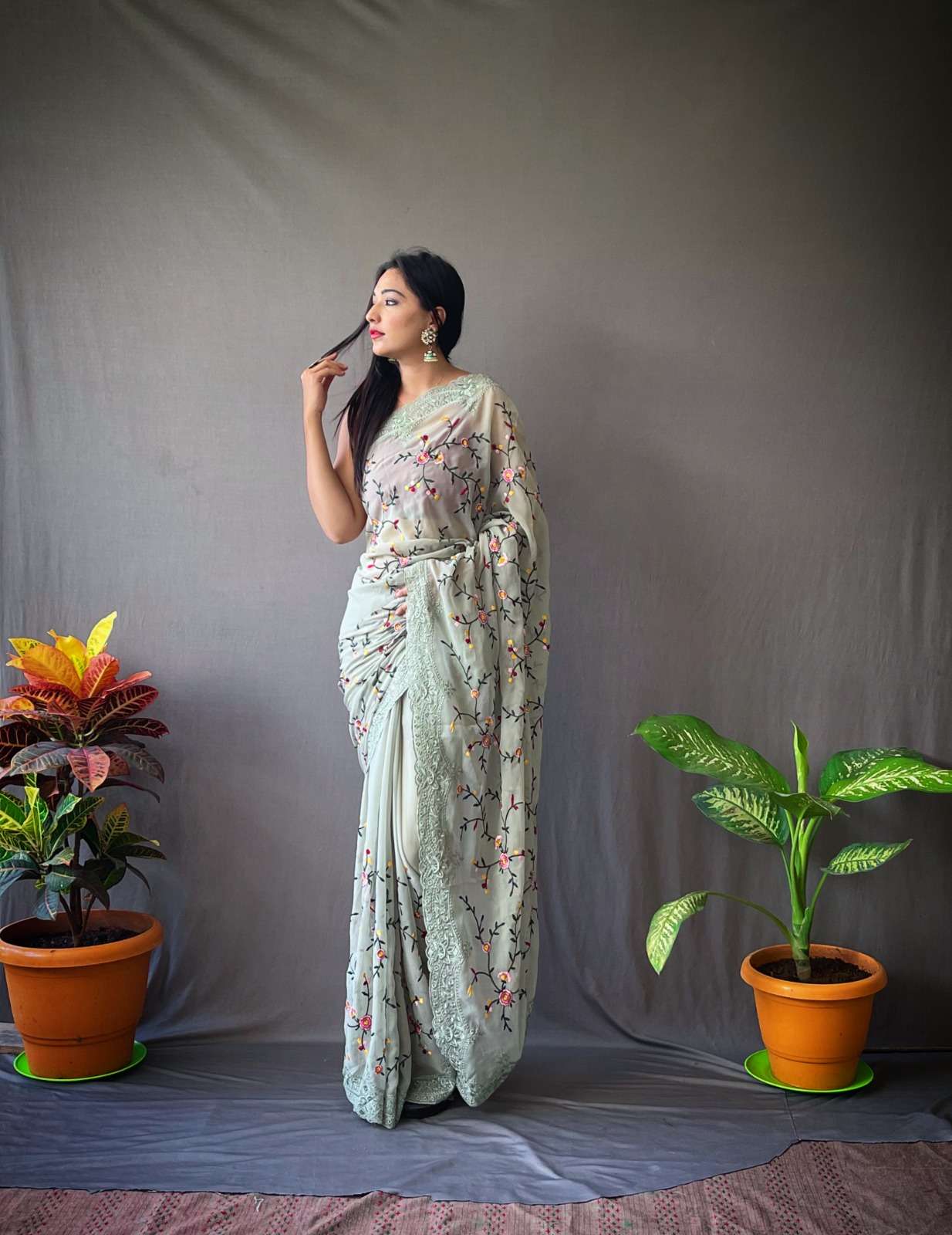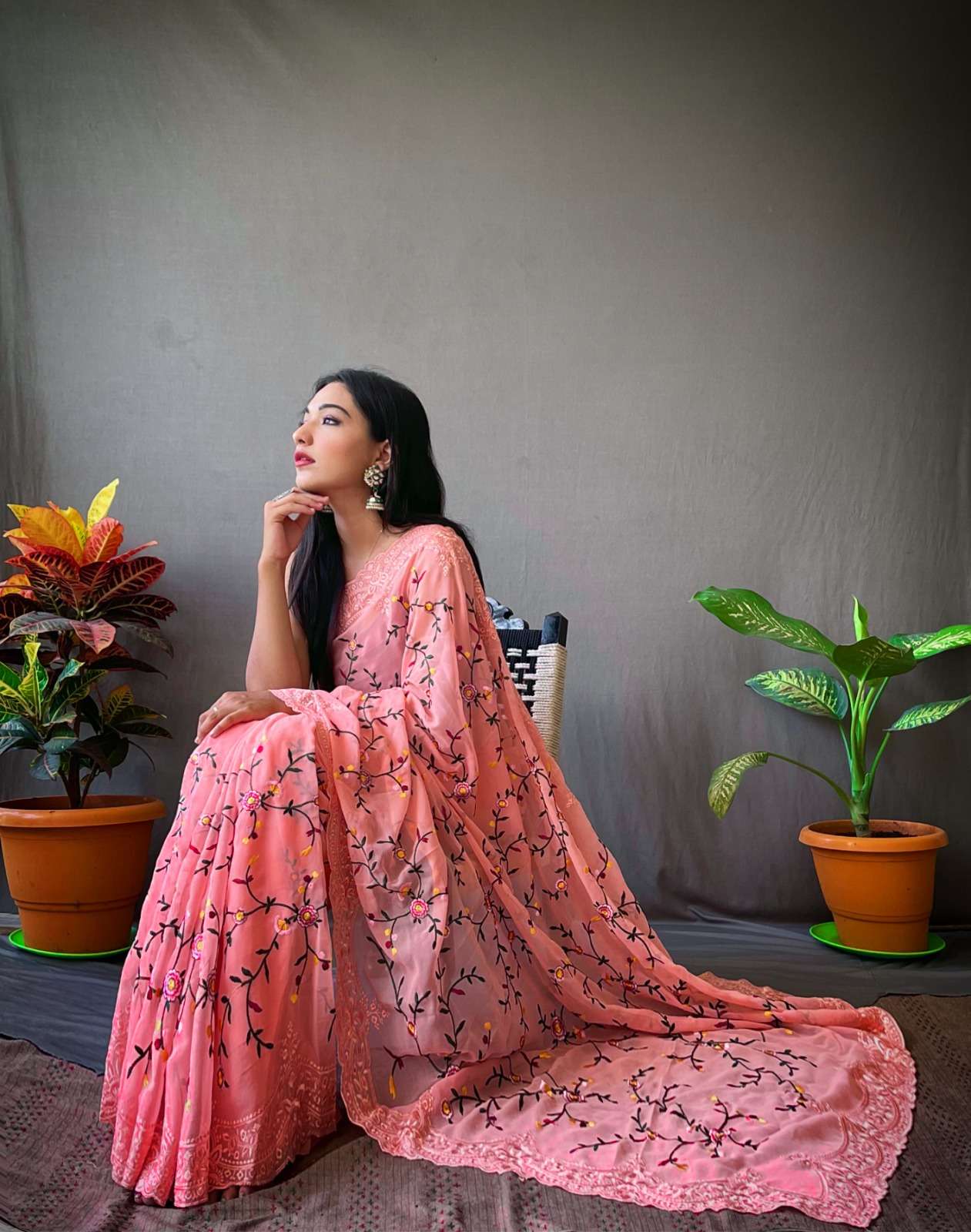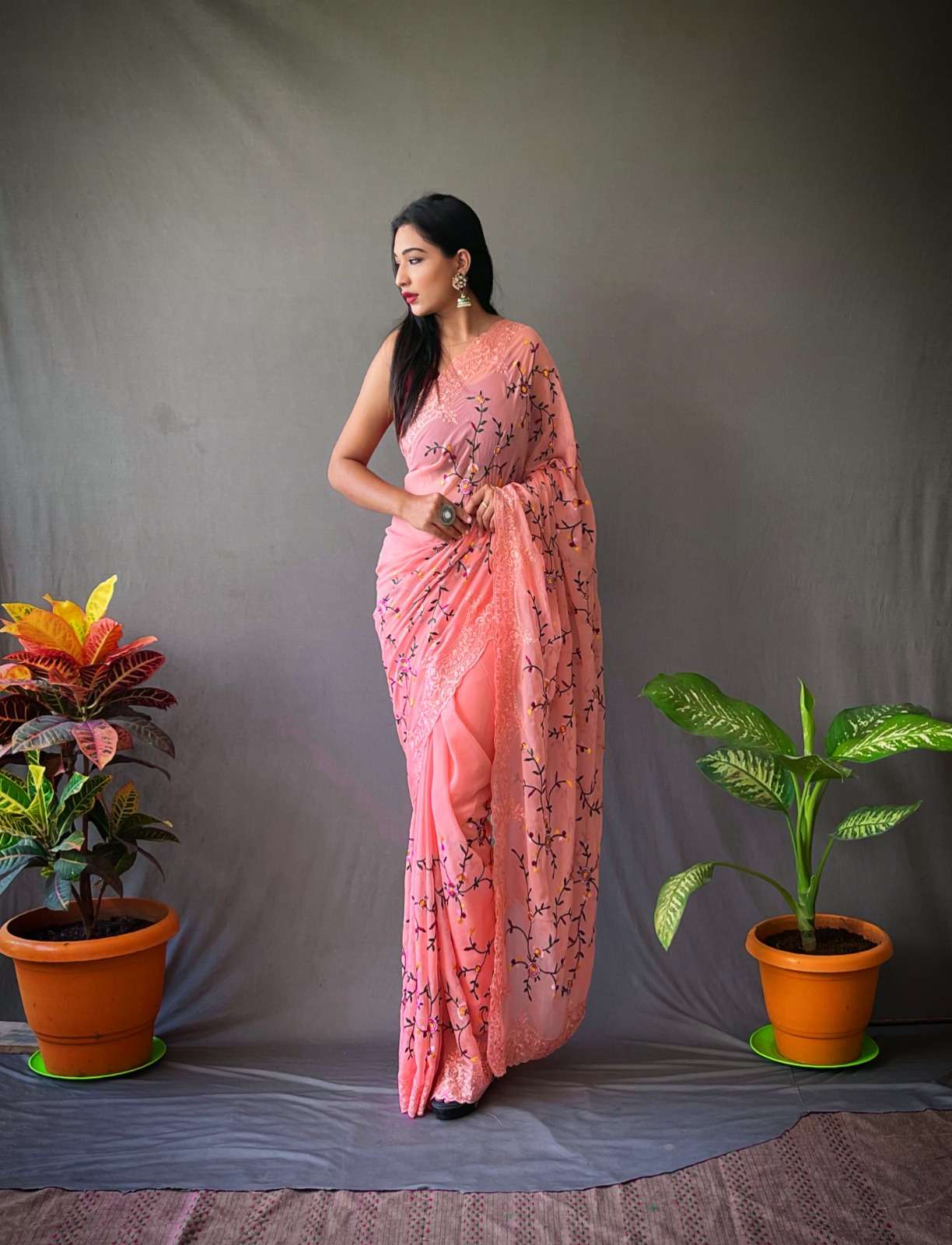 Catalog Name : *Pearl 1* No of Pcs : 4 Fabric : Georgette Work :Pure georgett silk saree having beautiful flowers work jal and cutwork of matching thread work with banglori sattin silk blouse