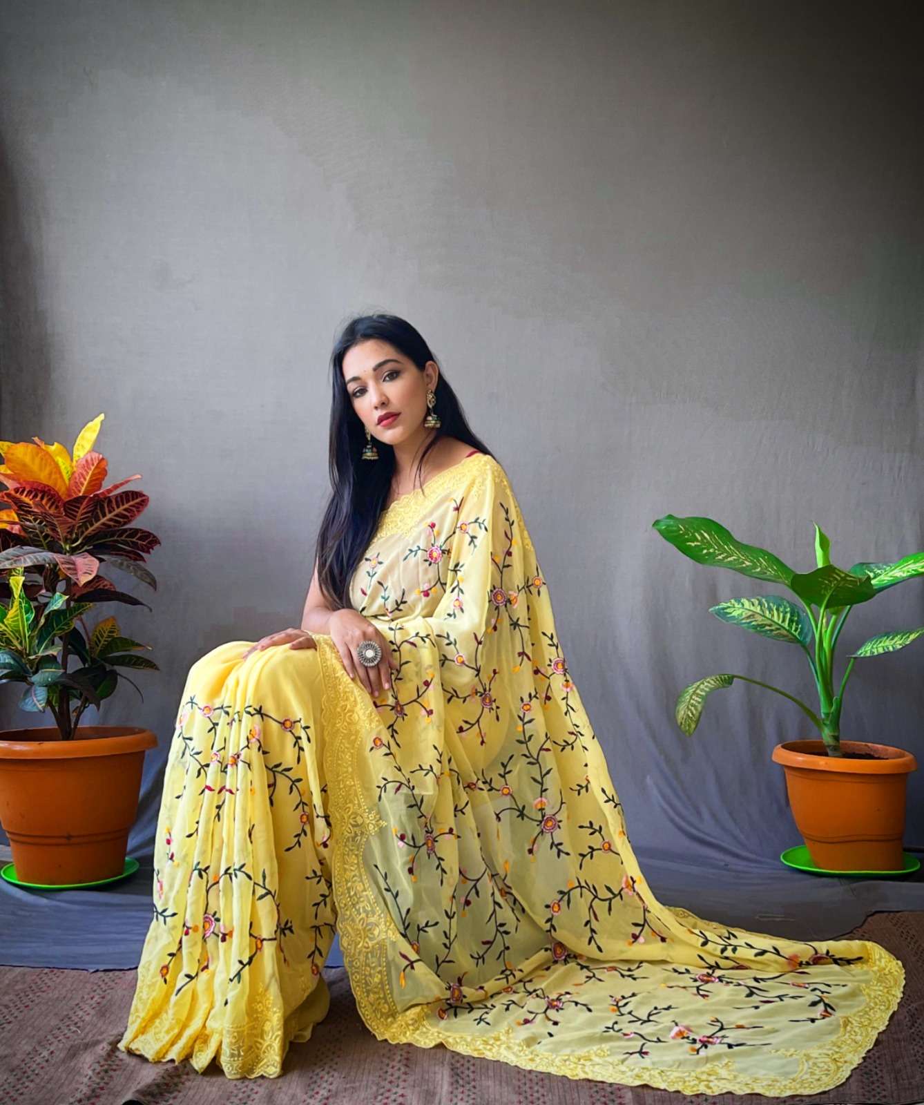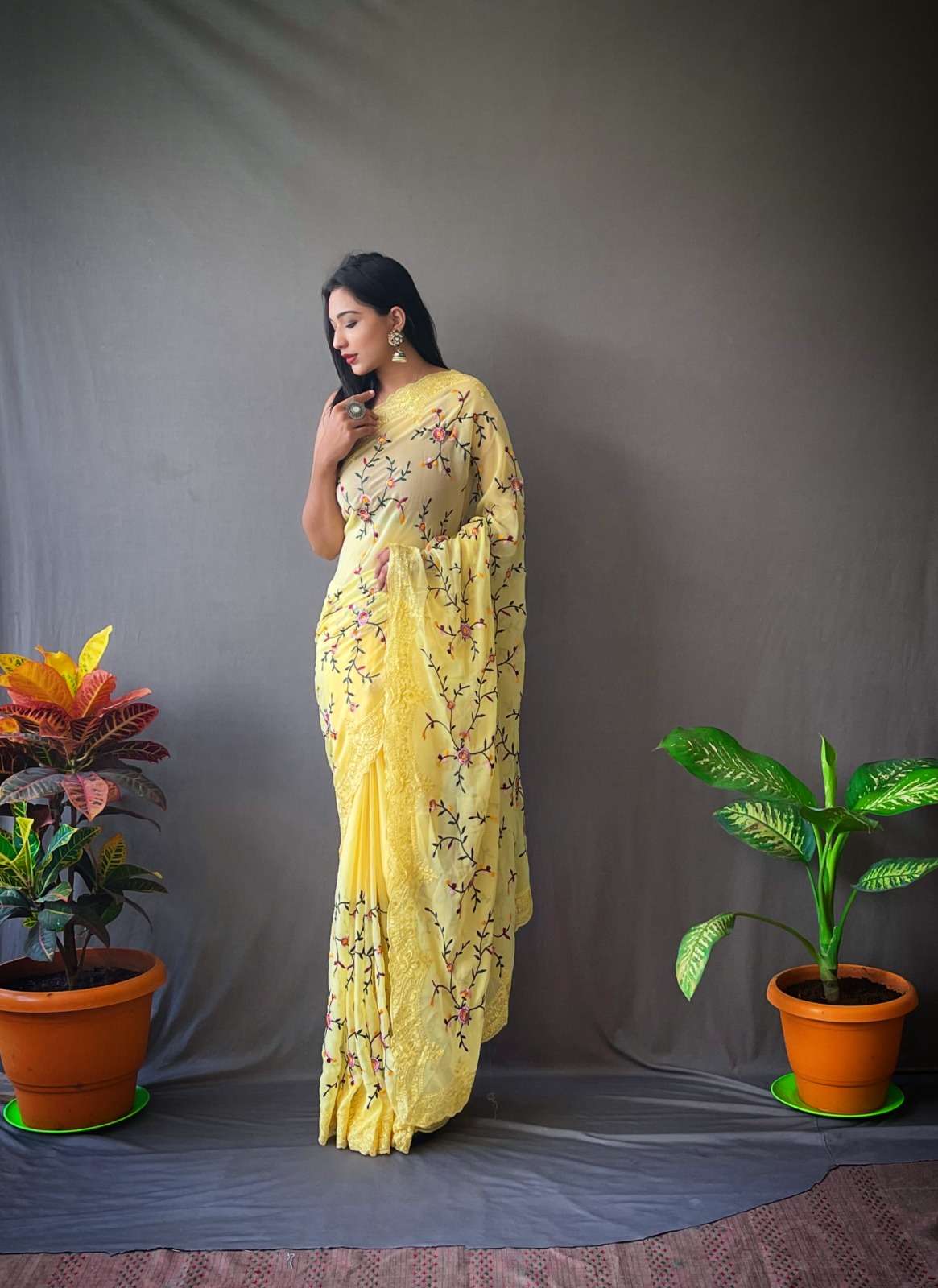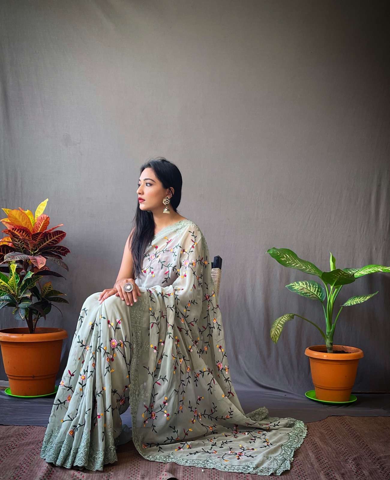 Catalog Name : *Pearl 1* No of Pcs : 4 Fabric : Georgette Work :Pure georgett silk saree having beautiful flowers work jal and cutwork of matching thread work with banglori sattin silk blouse