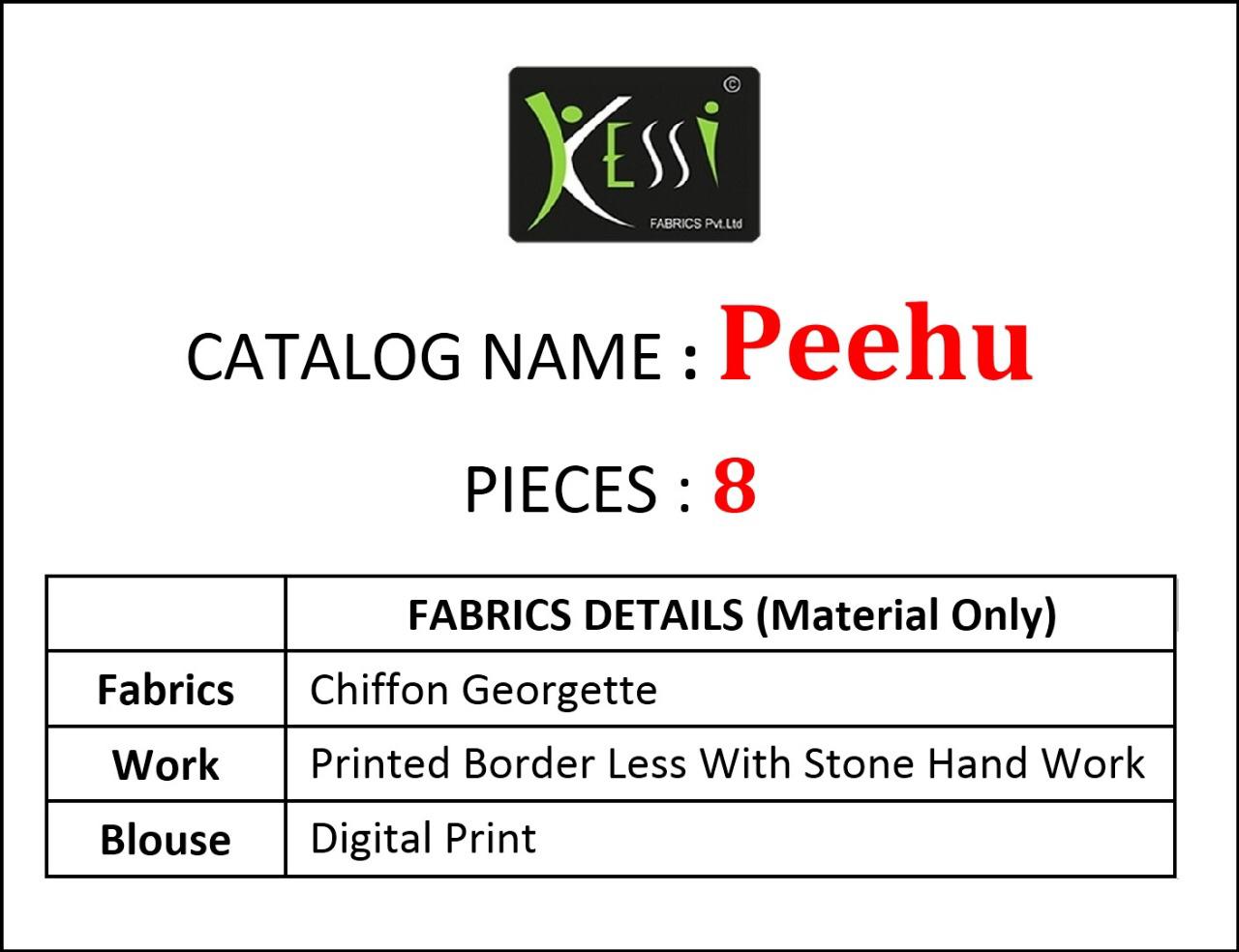 Buy Online Peehu By Kessi Chiffon Georgette Sarees Wholesale Supplier And Dealer Surat 8 Pcs of Full Catalogue at Wholesale Price. Looking for Peehu By Kessi Chiffon Georgette Sarees Wholesale Supplier And Dealer Surat Full Catalouge at Best Price? Buy Now Peehu By Kessi Chiffon Georgette Sarees Wholesale Supplier And Dealer Surat at Wholesale Rate of Rs 5592 with Total 8 Pcs from authroized dealer and supplier of KESSI Brand. Cost of Each piece is just only Rs 699 which is very low and affordable price to resale the product in your retail store ,This is Surat based Wholesale Supplier & Dealer of KESSI Brand. Click on Brand name to Know more about KESSI Brand's products.Call or Whatsapp on 9898838984 for booking or enquiry