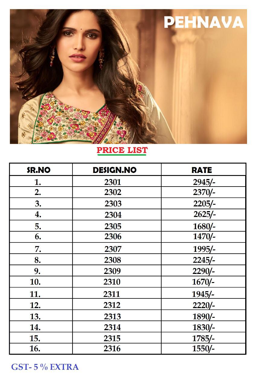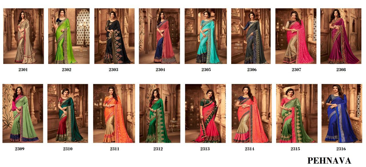 Brand - PEHENVA. Type - Saree. Series Â?2301 to 2316. Set & Loose. GST 5 Percent Extra. Delivery 3-4 days All Fancy Silk base Fabric with Heavy Blouse |