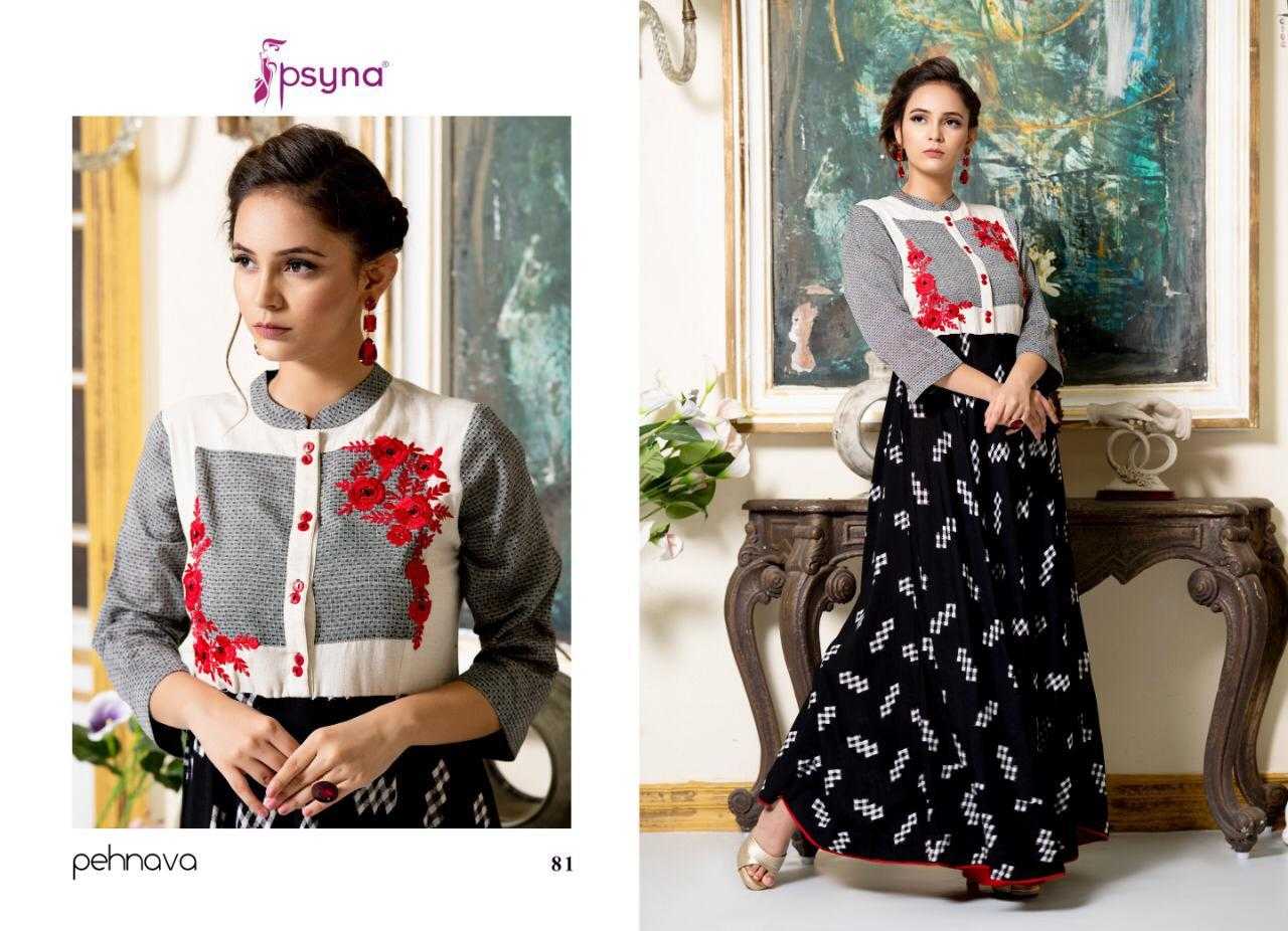 Buy Online Pehnava Vol 8 By Psyna 80 Series Fancy Reyon Cotton Gown Style Kurti Catlog Wholesale Dealer Surat 10 Pcs of Full Catalogue at Wholesale Price. Looking for Pehnava Vol 8 By Psyna 80 Series Fancy Reyon Cotton Gown Style Kurti Catlog Wholesale Dealer Surat Full Catalouge at Best Price? Buy Now Pehnava Vol 8 By Psyna 80 Series Fancy Reyon Cotton Gown Style Kurti Catlog Wholesale Dealer Surat at Wholesale Rate of Rs 8990 with Total 10 Pcs from authroized dealer and supplier of PSYNA Brand. Cost of Each piece is just only Rs 899 which is very low and affordable price to resale the product in your retail store ,This is Surat based Wholesale Supplier & Dealer of PSYNA Brand. Click on Brand name to Know more about PSYNA Brand's products.Call or Whatsapp on 9898838984 for booking or enquiry