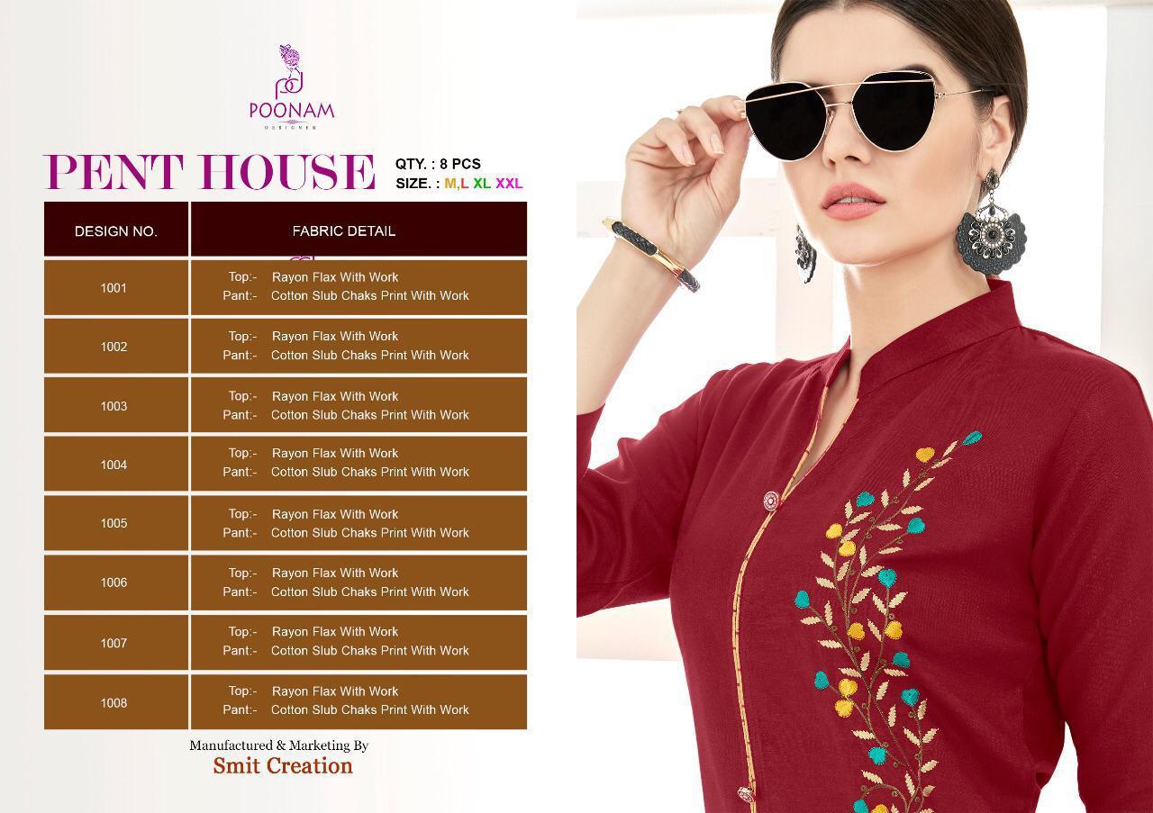 *Poonam DesignerÂ??*? (Smit creation) Â? *Pent House*Â? Top (kurti)? - Rayon flex with work? Bottom (pent) - cotton slub checks with work. Size - M,L,XL & XXL. Des------------08 pes ? 599/- + 5% GST Set to set. Dishpatching--23/01/2019 Thanking You |