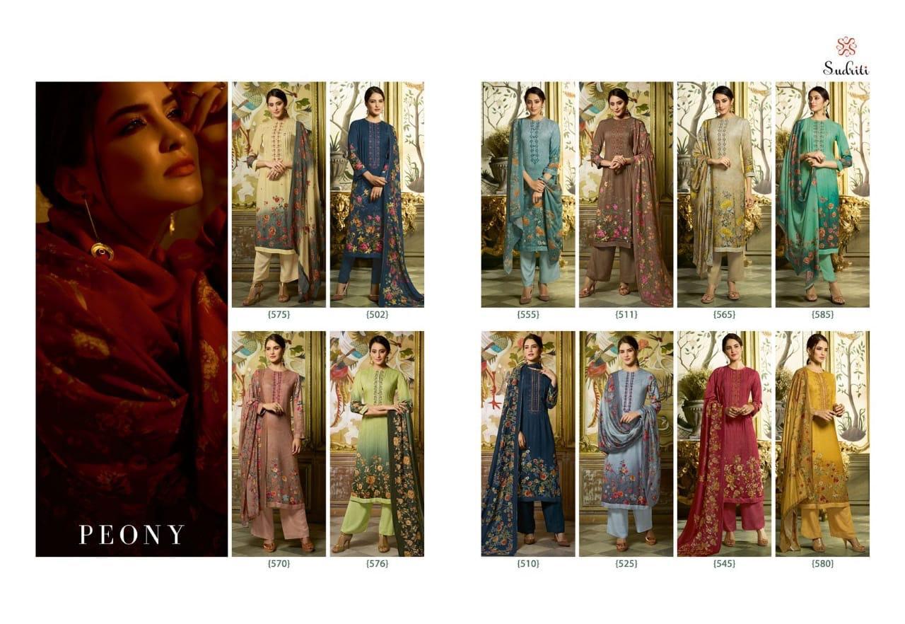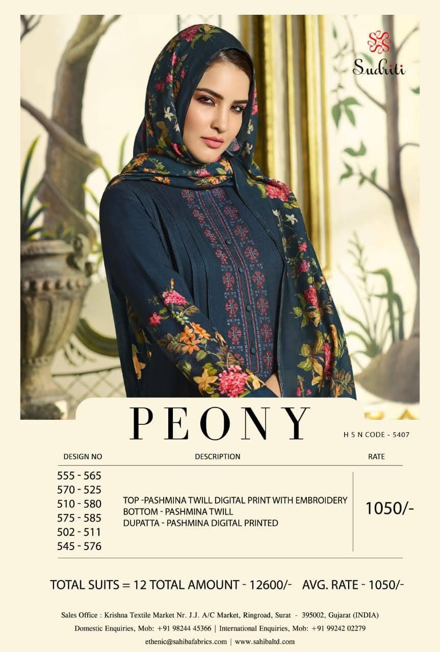 Buy Online Peony By Shaiba Sudriti Pashmina Suits Wholesale Supplier And Dealer Surat 12 Pcs of Full Catalogue at Wholesale Price. Looking for Peony By Shaiba Sudriti Pashmina Suits Wholesale Supplier And Dealer Surat Full Catalouge at Best Price? Buy Now Peony By Shaiba Sudriti Pashmina Suits Wholesale Supplier And Dealer Surat at Wholesale Rate of Rs 12600 with Total 12 Pcs from authroized dealer and supplier of SUDRITI Brand. Cost of Each piece is just only Rs 1050 which is very low and affordable price to resale the product in your retail store ,This is Surat based Wholesale Supplier & Dealer of SUDRITI Brand. Click on Brand name to Know more about SUDRITI Brand's products.Call or Whatsapp on 9898838984 for booking or enquiry
