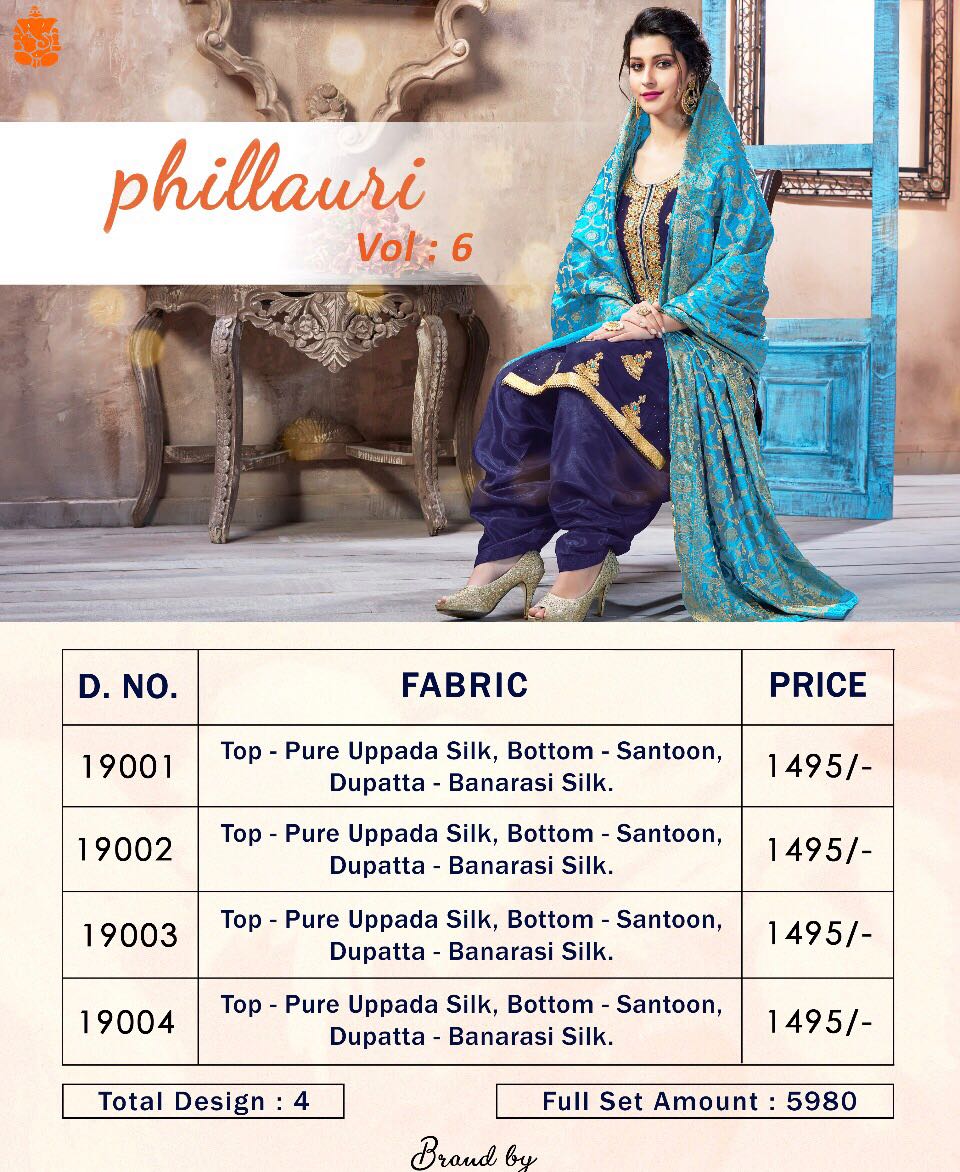 Buy Online Phillauri Vol 6 Series 19001 Panjabi Patiyala Suits Wholesale Supplier And Dealer Surat 4 Pcs of Full Catalogue at Wholesale Price. Looking for Phillauri Vol 6 Series 19001 Panjabi Patiyala Suits Wholesale Supplier And Dealer Surat Full Catalouge at Best Price? Buy Now Phillauri Vol 6 Series 19001 Panjabi Patiyala Suits Wholesale Supplier And Dealer Surat at Wholesale Rate of Rs 5980 with Total 4 Pcs from authroized dealer and supplier of Patiala Suit Brand. Cost of Each piece is just only Rs 1495 which is very low and affordable price to resale the product in your retail store ,This is Surat based Wholesale Supplier & Dealer of Patiala Suit Brand. Click on Brand name to Know more about Patiala Suit Brand's products.Call or Whatsapp on 9898838984 for booking or enquiry