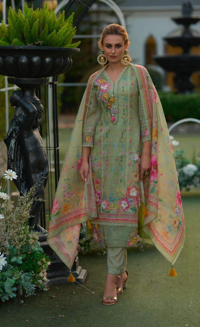 * फुलकारी * * * 💯Quality .... *TOP-* Fabric: * PURE LINEN FABRICS * - Designer style 👗 🔺TOP: - * WORK:- * *PURE LINEN + DIGITAL PRINTS + PURE hand ne therad WORK + 3D flower +Accessory WoRK*