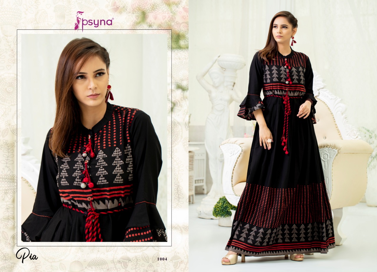 Buy Online Pia By Psyna Tex 1001 Series Reyon Printed Gown Stryle Kurti Catlog Wholesale Dealer Surat 8 Pcs of Full Catalogue at Wholesale Price. Looking for Pia By Psyna Tex 1001 Series Reyon Printed Gown Stryle Kurti Catlog Wholesale Dealer Surat Full Catalouge at Best Price? Buy Now Pia By Psyna Tex 1001 Series Reyon Printed Gown Stryle Kurti Catlog Wholesale Dealer Surat at Wholesale Rate of Rs 7192 with Total 8 Pcs from authroized dealer and supplier of PSYNA Brand. Cost of Each piece is just only Rs 899 which is very low and affordable price to resale the product in your retail store ,This is Surat based Wholesale Supplier & Dealer of PSYNA Brand. Click on Brand name to Know more about PSYNA Brand's products.Call or Whatsapp on 9898838984 for booking or enquiry