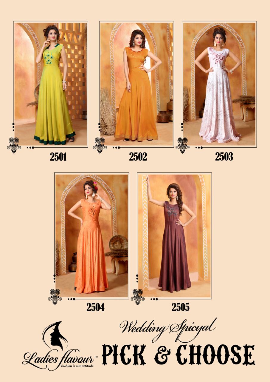 Buy Online Pick And Choose By Ladies Flavour 2501 Series Fancy Party Wear Gown Style Kurti Catlog Wholesale Dealer Surat 5 Pcs of Full Catalogue at Wholesale Price. Looking for Pick And Choose By Ladies Flavour 2501 Series Fancy Party Wear Gown Style Kurti Catlog Wholesale Dealer Surat Full Catalouge at Best Price? Buy Now Pick And Choose By Ladies Flavour 2501 Series Fancy Party Wear Gown Style Kurti Catlog Wholesale Dealer Surat at Wholesale Rate of Rs 4975 with Total 5 Pcs from authroized dealer and supplier of Ladies Flavour Brand. Cost of Each piece is just only Rs 995 which is very low and affordable price to resale the product in your retail store ,This is Surat based Wholesale Supplier & Dealer of Ladies Flavour Brand. Click on Brand name to Know more about Ladies Flavour Brand's products.Call or Whatsapp on 9898838984 for booking or enquiry