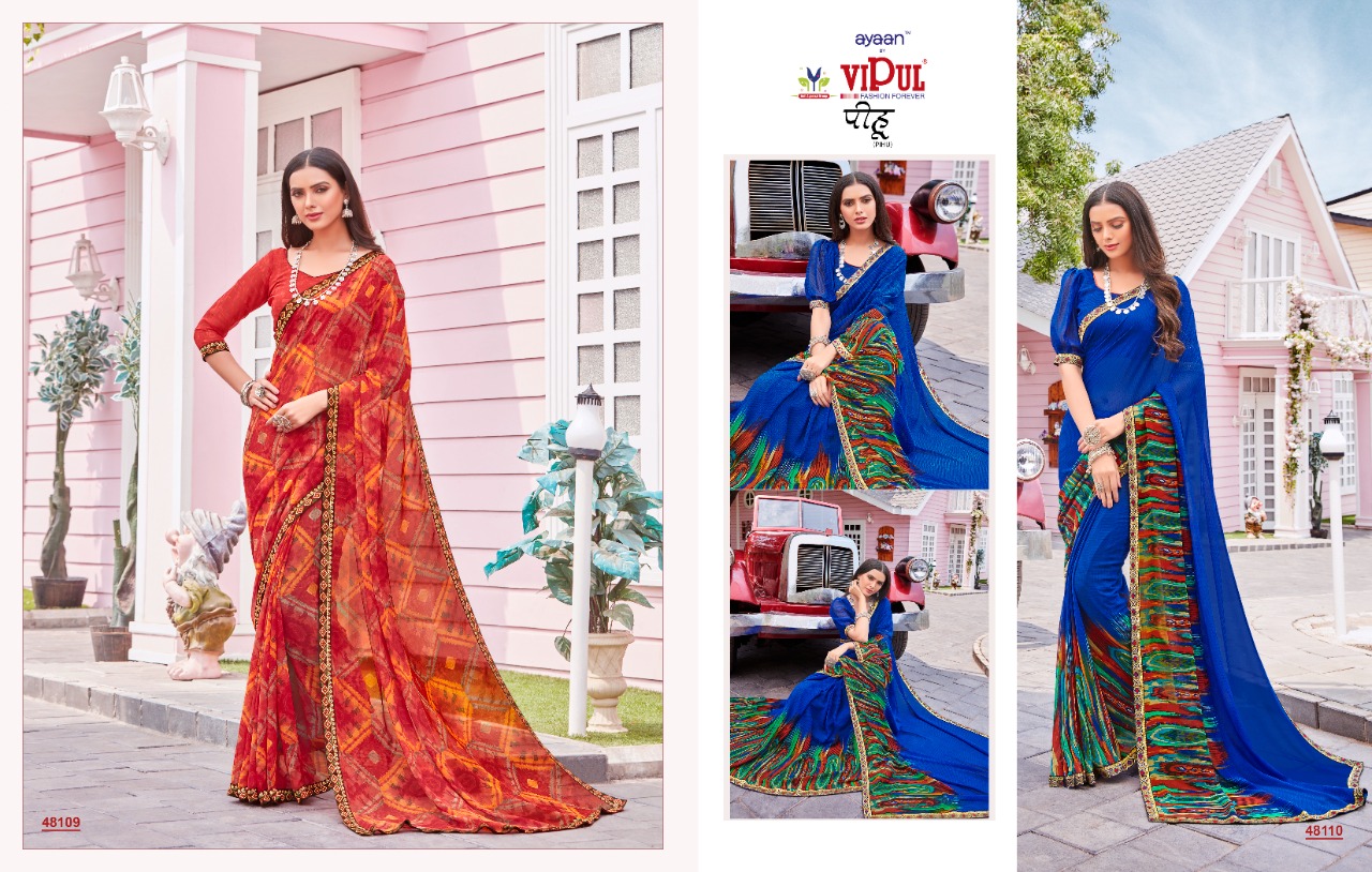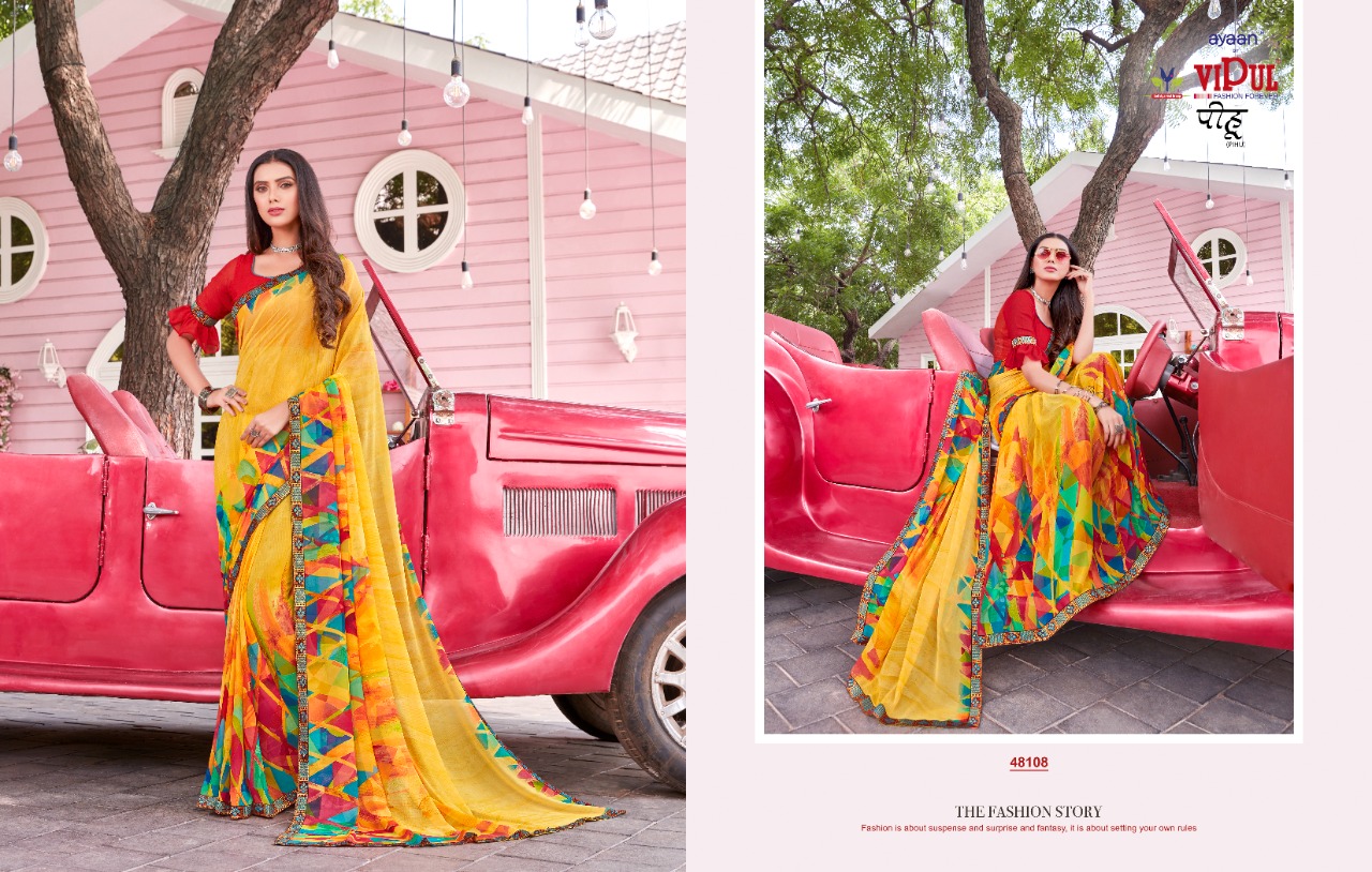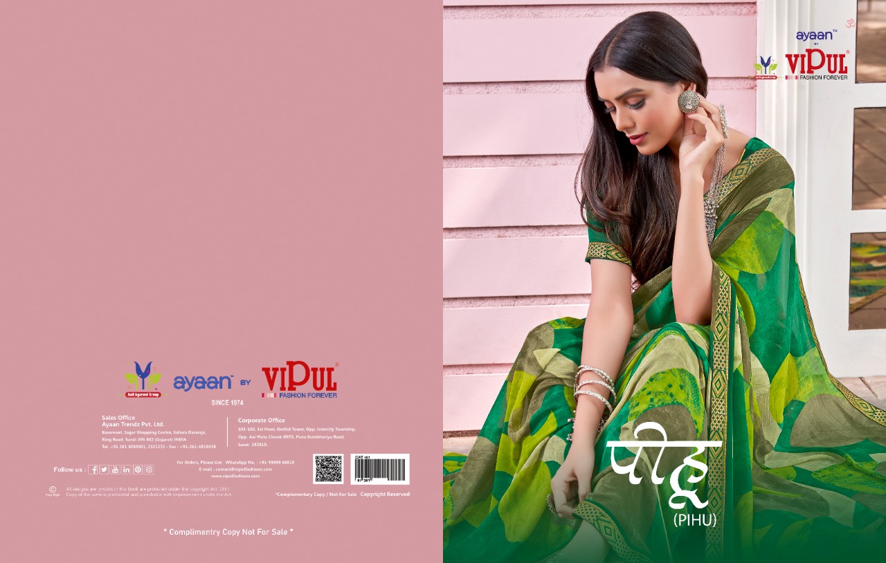 Buy Online Pihu By Vipul Saree Wholesaler Supplier Surat 18 Pcs of Full Catalogue at Wholesale Price. Looking for Pihu By Vipul Saree Wholesaler Supplier Surat Full Catalouge at Best Price? Buy Now Pihu By Vipul Saree Wholesaler Supplier Surat at Wholesale Rate of Rs 10710 with Total 18 Pcs from authroized dealer and supplier of VIPUL Brand. Cost of Each piece is just only Rs 595 which is very low and affordable price to resale the product in your retail store ,This is Surat based Wholesale Supplier & Dealer of VIPUL Brand. Click on Brand name to Know more about VIPUL Brand's products.Call or Whatsapp on 9898838984 for booking or enquiry