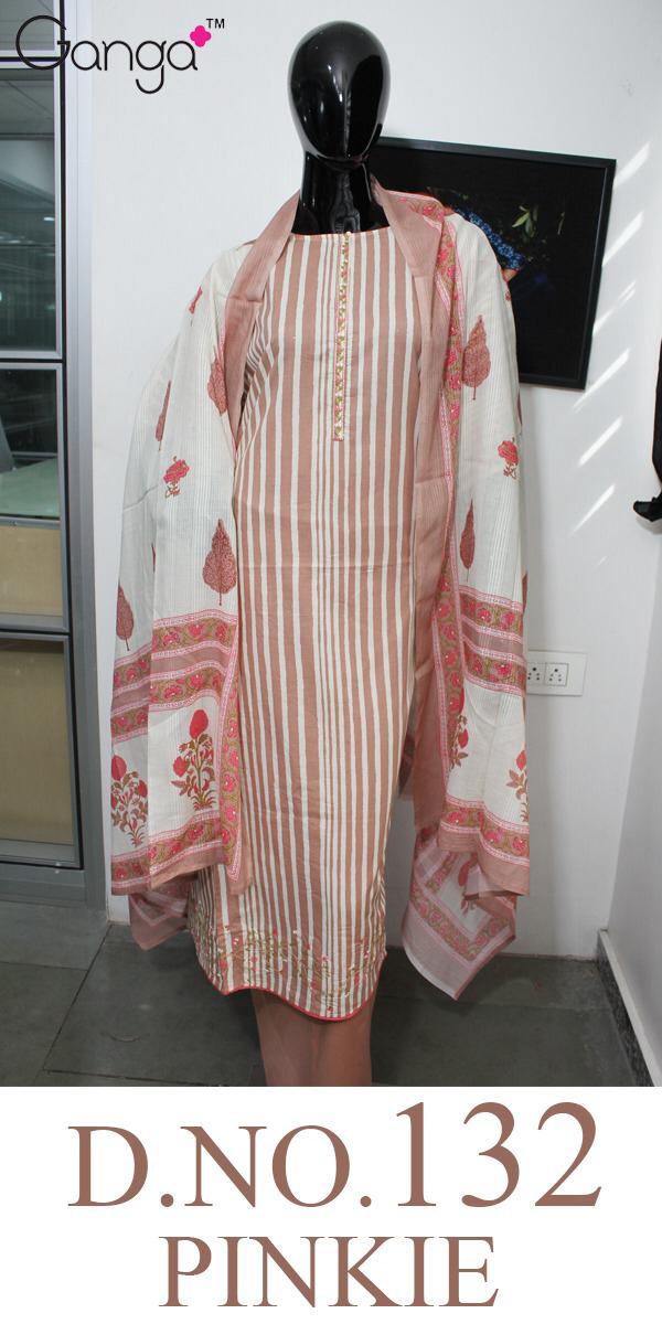 Ganga Four colour matching Pinkie 132 Top super cotton printed with embroidery Bottom super cotton solid Dupatta finest mal cotton pattern printed 1050? 5%Gst Set to set |