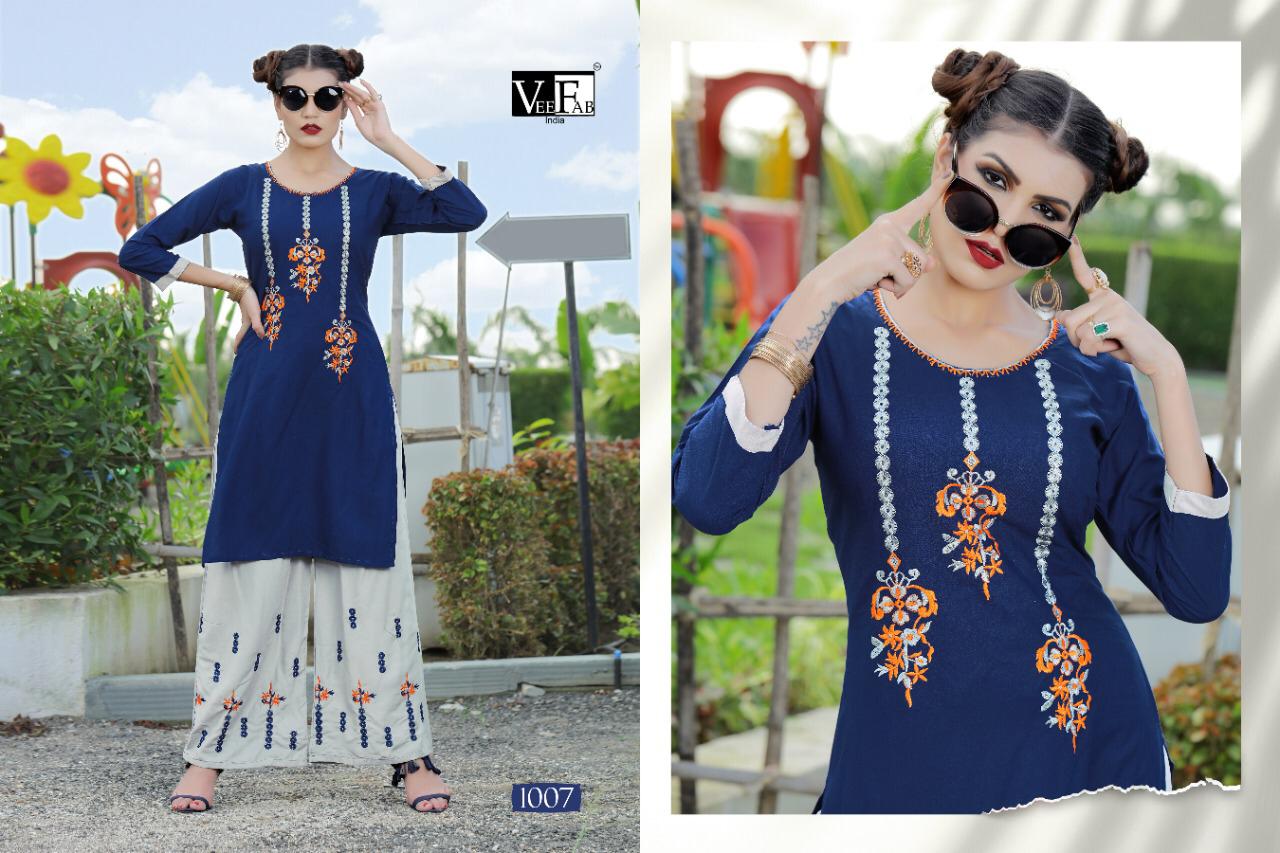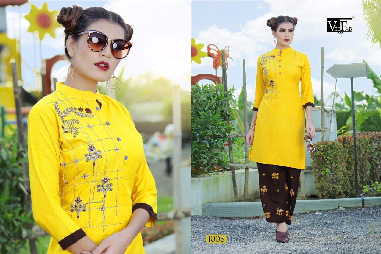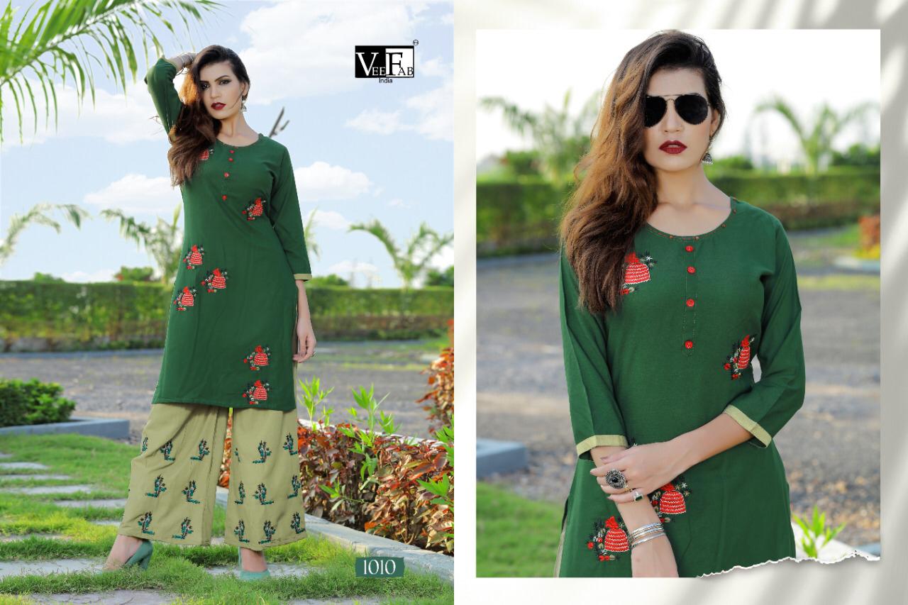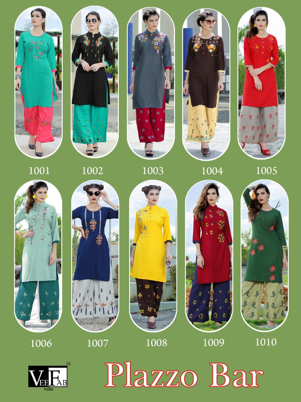 Buy Online Plazzo Bar By Vee Fab India Reyon Kurtis With Plazzo Wholesale Supplier Surat 10 Pcs of Full Catalogue at Wholesale Price. Looking for Plazzo Bar By Vee Fab India Reyon Kurtis With Plazzo Wholesale Supplier Surat Full Catalouge at Best Price? Buy Now Plazzo Bar By Vee Fab India Reyon Kurtis With Plazzo Wholesale Supplier Surat at Wholesale Rate of Rs 6090 with Total 10 Pcs from authroized dealer and supplier of Veefab india Brand. Cost of Each piece is just only Rs 609 which is very low and affordable price to resale the product in your retail store ,This is Surat based Wholesale Supplier & Dealer of Veefab india Brand. Click on Brand name to Know more about Veefab india Brand's products.Call or Whatsapp on 9898838984 for booking or enquiry