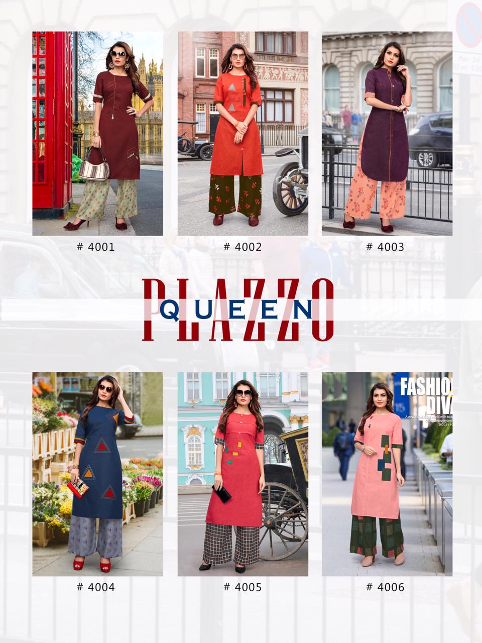 Buy Online Plazzo Queen By Rt 4001 Series Fancy Reyon Kurti With Plazzo Collection Wholesale Dealer Surat 6 Pcs of Full Catalogue at Wholesale Price. Looking for Plazzo Queen By Rt 4001 Series Fancy Reyon Kurti With Plazzo Collection Wholesale Dealer Surat Full Catalouge at Best Price? Buy Now Plazzo Queen By Rt 4001 Series Fancy Reyon Kurti With Plazzo Collection Wholesale Dealer Surat at Wholesale Rate of Rs 3474 with Total 6 Pcs from authroized dealer and supplier of Brand. Cost of Each piece is just only Rs 579 which is very low and affordable price to resale the product in your retail store ,This is Surat based Wholesale Supplier & Dealer of Brand. Click on Brand name to Know more about Brand's products.Call or Whatsapp on 9898838984 for booking or enquiry