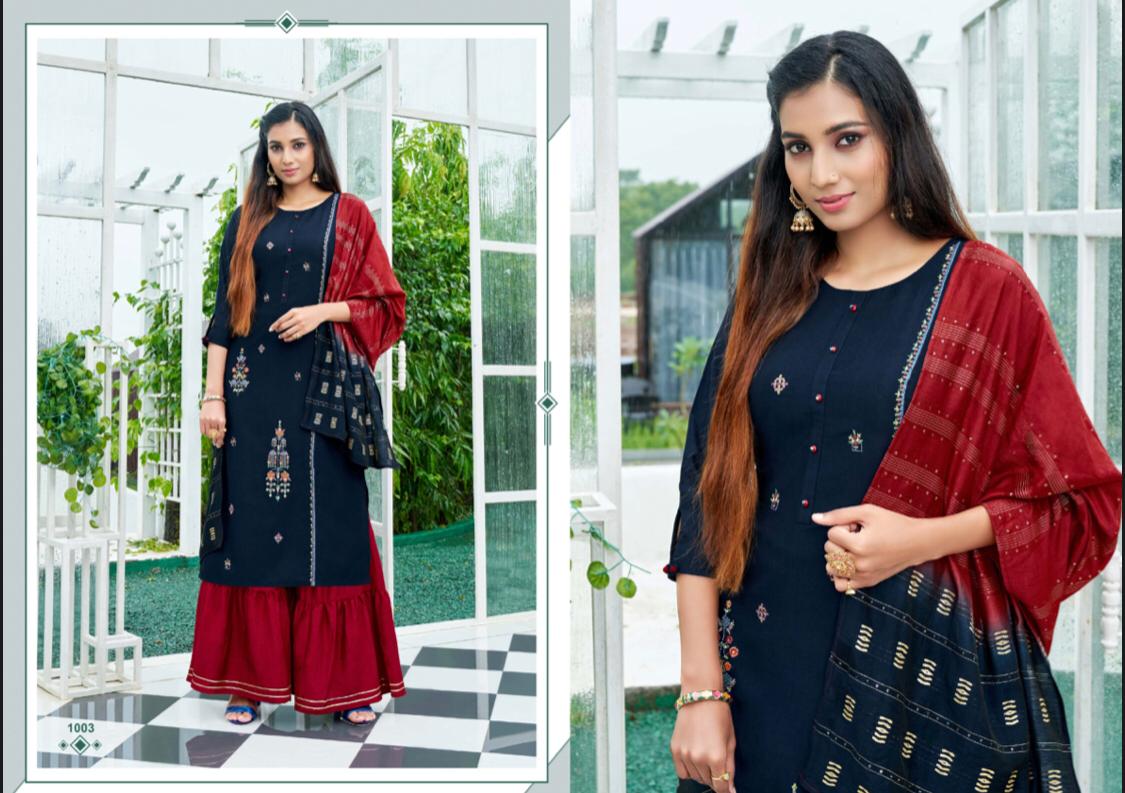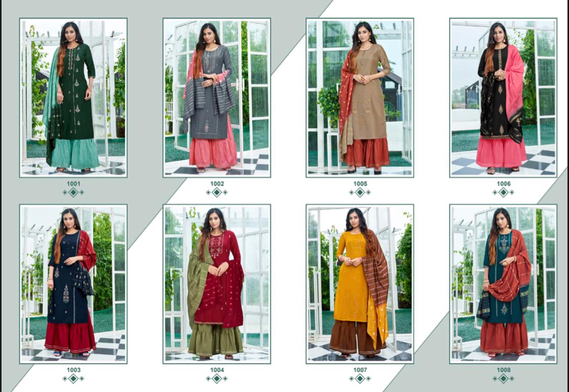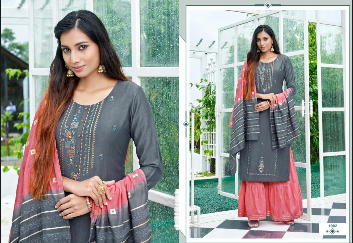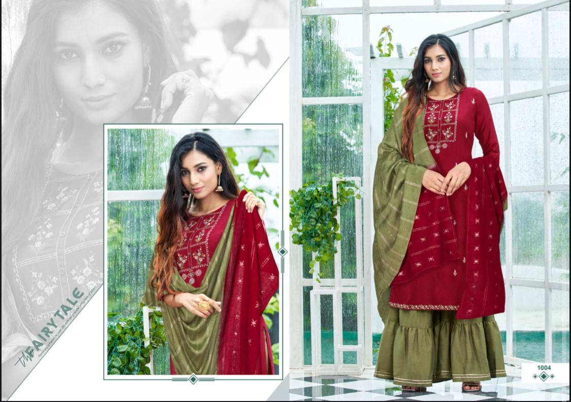 //* AMAAYA GARMENTS *// New Catalog Launched Â?* PLEASANT * Â? ?*TOP-* Fabric: * Chinnin silk with Sequence Embroidery * ?*BOTTOM*- Sharara Fabric- *Chinnon* ?DUPATTA Pure Dupatta with Double Dying Fully stiched Kurtis & Sharara with dupatta Size: *M, L, XL, XXL* ?*RATE : 999/-* Set to set Design:- * 8 *Pcs ?* DISPATCH AFTER 3-4 DAYS * ?Booking started from now... ?Order yours |