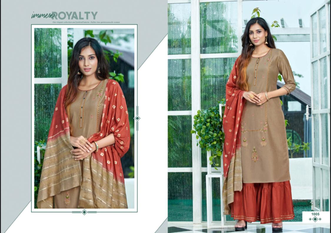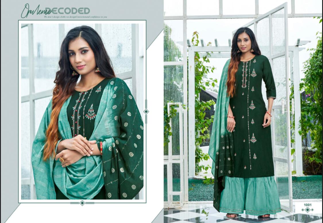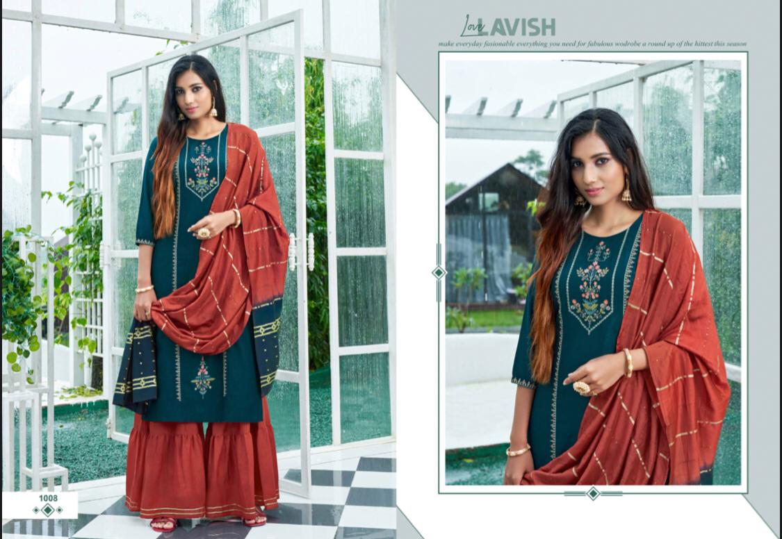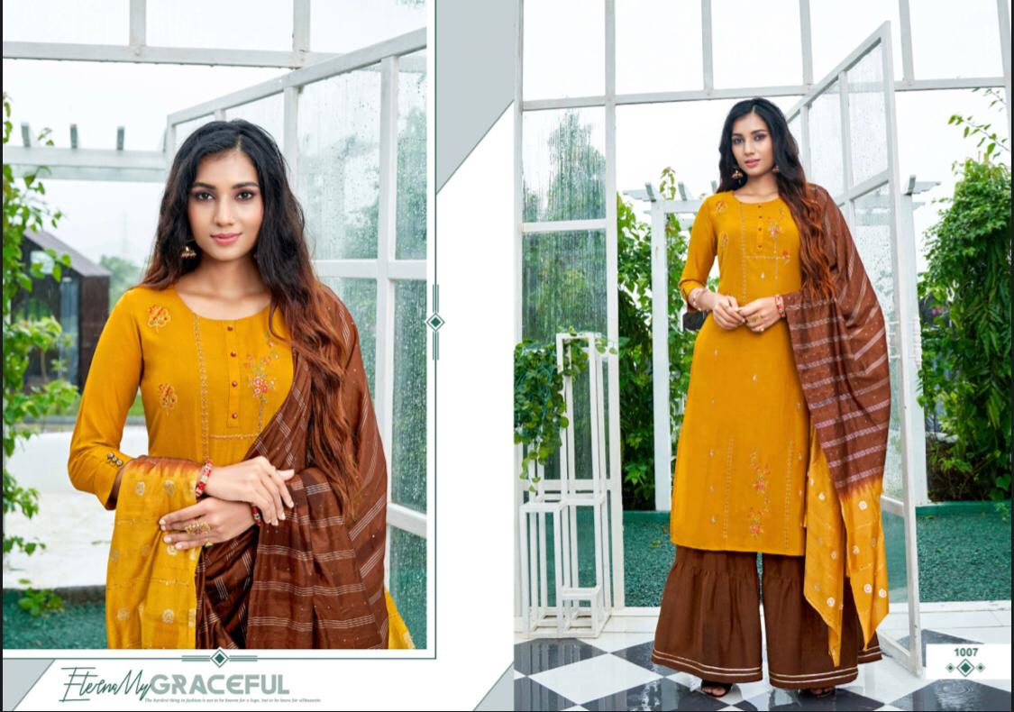 //* AMAAYA GARMENTS *// New Catalog Launched Â?* PLEASANT * Â? ?*TOP-* Fabric: * Chinnin silk with Sequence Embroidery * ?*BOTTOM*- Sharara Fabric- *Chinnon* ?DUPATTA Pure Dupatta with Double Dying Fully stiched Kurtis & Sharara with dupatta Size: *M, L, XL, XXL* ?*RATE : 999/-* Set to set Design:- * 8 *Pcs ?* DISPATCH AFTER 3-4 DAYS * ?Booking started from now... ?Order yours |